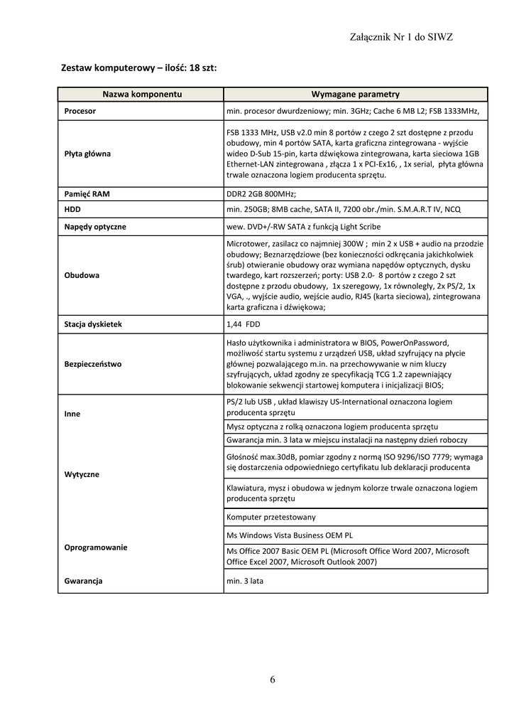 Załącznik Nr 1 do SIWZ Zestaw komputerowy – ilość: 18 szt: Nazwa komponentu Wymagane parametry Procesor min. procesor dwurdzeniowy; min. 3GHz; Cache 6 MB L2; FSB 1333MHz, Płyta główna FSB 1333 MHz, USB v2.0 min 8 portów z czego 2 szt dostępne z przodu obudowy, min 4 portów SATA, karta graficzna zintegrowana - wyjście wideo D-Sub 15-pin, karta dźwiękowa zintegrowana, karta sieciowa 1GB Ethernet-LAN zintegrowana , złącza 1 x PCI-Ex16, , 1x serial, płyta główna trwale oznaczona logiem producenta sprzętu. Pamięć RAM DDR2 2GB 800MHz; HDD min. 250GB; 8MB cache, SATA II, 7200 obr./min. S.M.A.R.T IV, NCQ Napędy optyczne wew. DVD+/-RW SATA z funkcją Light Scribe Obudowa Microtower, zasilacz co najmniej 300W ; min 2 x USB + audio na przodzie obudowy; Beznarzędziowe (bez konieczności odkręcania jakichkolwiek śrub) otwieranie obudowy oraz wymiana napędów optycznych, dysku twardego, kart rozszerzeń; porty: USB 2.0- 8 portów z czego 2 szt dostępne z przodu obudowy, 1x szeregowy, 1x równoległy, 2x PS/2, 1x VGA, ., wyjście audio, wejście audio, RJ45 (karta sieciowa), zintegrowana karta graficzna i dźwiękowa; Stacja dyskietek 1,44 FDD Bezpieczeństwo Hasło użytkownika i administratora w BIOS, PowerOnPassword, możliwość startu systemu z urządzeń USB, układ szyfrujący na płycie głównej pozwalającego m.in. na przechowywanie w nim kluczy szyfrujących, układ zgodny ze specyfikacją TCG 1.2 zapewniający blokowanie sekwencji startowej komputera i inicjalizacji BIOS; Inne PS/2 lub USB , układ klawiszy US-International oznaczona logiem producenta sprzętu Mysz optyczna z rolką oznaczona logiem producenta sprzętu Gwarancja min. 3 lata w miejscu instalacji na następny dzień roboczy Wytyczne Głośność max.30dB, pomiar zgodny z normą ISO 9296/ISO 7779; wymaga się dostarczenia odpowiedniego certyfikatu lub deklaracji producenta Klawiatura, mysz i obudowa w jednym kolorze trwale oznaczona logiem producenta sprzętu Komputer przetestowany Ms Windows Vista Business OEM PL Oprogramowanie Ms Office 2007 Basic OEM PL (Microsoft Office Word 2007, Microsoft Office Excel 2007, Microsoft Outlook 2007) Gwarancja min. 3 lata 6 Załącznik Nr 1 do SIWZ Monitor 19” - ilość: 9 szt. Nazwa Wymagane parametry Monitor LCD 19" 19"; maksymalna rozdzielczość obrazu: 1440 x 900 pikseli; czas reakcji matrycy: 5 ms; typ ekranu: TFT TN; jasność: 300 cd/m2; kontrast: 1000:1; kąty widzenia 160/160 stopni; typ gniazda wejściowego (sygnałowego): 15-pin D-Sub; regulacja kąta nachylenia;. Gwarancja min. 3 lata Monitor 17” – ilość: 9 szt. Nazwa Wymagane parametry Format ekranu monitora Standardowy Przekątna ekranu 17 cali Wielkość plamki 0,264 mm Typ panela LCD TFT TN Technologia podświetlenia CCFL Zalecana rozdzielczość obrazu 1280 x 1024 pikseli 60 Hz Widoczny obszar ekranu 339 x 271 mm Częstotliwość odchylania poziomego 24-83 kHz Częstotliwość odchylenia pionowego 50-77 Hz Czas reakcji matrycy 5 ms Jasność 300 cd/m2 Kontrast 800:1 Kąt widzenia poziomy 160 stopni Kąt widzenia pionowy Regulacja cyfrowa (OSD) 160 stopni • TCO-03 • ISO 13406-2 Tak Typ sygnału wejściowego RGB Typ gniazda wejściowego (sygnałowego) 15-stykowe D-Sub Wbudowany zasilacz Tak Pobór mocy (praca/spoczynek) 29/2 Wat Możliwość pochylenia panela Tak Montaż na ścianie (VESA) 100 x 100 mm Możliwość zabezpieczenia (Kensington) Tak Szerokość x Wysokość x Głębokość 377 mm x 386 mm x 192 mm Masa netto 4,7 kg Kolor obudowy srebrno-czarny Gwarancja min. 3 lata Certyfikaty SERWER NR 1 – ilość: 1 szt. 7 Załącznik Nr 1 do SIWZ Nazwa komponentu Wymagane parametry Identyfikacja Typ produktu, model: Obudowa Tower z możliwością konwersji do instalacji w standardowej szafie RACK 19’’ – maksymalna wysokość 5U Płyta główna Płyta główna z możliwością zainstalowania do dwóch procesorów, dwu lub czterordzeniowych, szyna Front Side Bus umożliwiająca przepustowość do 25 GB/s. Płyta główna musi być zaprojektowana przez producenta serwera i oznaczona jego znakiem firmowym. Chipset Dedykowany przez producenta procesora do pracy w serwerach dwuprocesorowych Procesor Jeden procesor czterordzeniowy klasy x86 dedykowany do pracy w serwerach zaprojektowany do pracy w układach dwuprocesorowych, taktowany zegarem co najmniej 2.0GHz, pamięć L3 4 MB lub procesor równoważny wydajnościowo według wyniku testów przeprowadzonych przez Oferenta. W przypadku zaoferowania procesora równoważnego Zamawiający zastrzega sobie, iż w celu sprawdzenia poprawności przeprowadzenia testów oferent musi dostarczyć zamawiającemu oprogramowanie testujące, oba równoważne porównywalne zestawy oraz dokładny opis użytych testów wraz z wynikami w celu ich sprawdzenia w terminie nie dłuższym niż 3 dni od otrzymania zawiadomienia od zamawiającego. RAM 4 GB DDR3 1066 MHz, możliwość rozszerzenia do 96GB, na płycie głównej powinno znajdować się minimum 12 slotów przeznaczonych dla pamięci, możliwość instalacji kości pamięci RDIMM lub UDIMM. Zabezpieczenia pamięci RAM ECC, SBEC, SDDC (lub równoważny), Memory Mirror. Gniazda PCI Minimum 5 złącz PCIe drugiej generacji z czego minimum 2 złącza PCIe x8, umożliwiające instalację kart pełnej długości i wysokości. Interfejsy sieciowe Minimum 4 złącza typu 10/100/1000 wbudowane na płycie głównej z możliwością obsługi stosu TCP/IP – TOE, wsparciem dla protokołu IPv6 oraz możliwością obsługi iSCSI (w tym uruchamiania systemu z iSCSI). Napęd optyczny Wewnętrzny napęd DVD-ROM, Dyski twarde Możliwość instalacji dysków SATA, SAS lub SSD. Zainstalowane 2 dyski 160GB typu HotPlug SATA 3,5“ 7,2krpm, skonfigurowane jako RAID 1; 3 dyski 1TB typu HotPlug SATA 3,5‘‘ 7,2krpm skonfigurowane jako RAID5 Kontroler RAID Dedykowany kontroler RAID. Pamięć podręczna minimum 256MB, z podtrzymaniem bateryjnym, możliwe konfiguracje 0, 1, 10, 5, 50, 6, 60. Porty 9 x USB 2.0 z czego 2 n