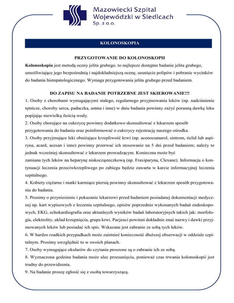 KOLONOSKOPIA PRZYGOTOWANIE DO KOLONOSKOPII Kolonoskopia jest metodą oceny jelita grubego. to najlepsze dostępne badanie jelita grubego, umożliwiające jego bezpośrednią i najdokładniejszą ocenę, usunięcie polipów i pobranie wycinków do badania histopatologicznego. Wymaga przygotowania jelita grubego przed badaniem. DO ZAPISU NA BADANIE POTRZEBNE JEST SKIEROWANIE!!! 1. Osoby z chorobami wymagającymi stałego, regularnego przyjmowania leków (np. nadciśnienie tętnicze, choroby serca, padaczka, astma i inne) w dniu badania powinny zażyć poranną dawkę leku popijając niewielką ilością wody. 2. Osoby chorujące na cukrzycę powinny dodatkowo skonsultować z lekarzem sposób przygotowania do badania oraz poinformować o cukrzycy rejestrację naszego ośrodka. 3. Osoby przyjmujące leki obniżające krzepliwość krwi (np. acenocumarol, sintrom, ticlid lub aspiryna, acard, acesan i inne) powinny przerwać ich stosowanie na 5 dni przed badaniem; należy to jednak wcześniej skonsultować z lekarzem prowadzącym. Konieczna może być zamiana tych leków na heparynę niskocząsteczkową (np. Fraxiparyna, Clexane). Informacja o kontynuacji leczenia przeciwkrzepliwego po zabiegu będzie zawarta w karcie informacyjnej leczenia szpitalnego. 4. Kobiety ciężarne i matki karmiące piersią powinny skonsultować z lekarzem sposób przygotowania do badania. 5. Prosimy o przyniesienie i pokazanie lekarzowi przed badaniem posiadanej dokumentacji medycznej np. kart wypisowych z leczenia szpitalnego, opisów poprzednio wykonanych badań endoskopowych, EKG, echokardiografia oraz aktualnych wyników badań laboratoryjnych takich jak: morfologia, elektrolity, układ krzepnięcia, grupa krwi. Pacjenci powinni dokładnie znać nazwy i dawki przyjmowanych leków lub posiadać ich spis. Wskazane jest zabranie ze sobą tych leków. 6. W bardzo rzadkich przypadkach może zaistnieć konieczność dłuższej obserwacji w oddziale szpitalnym. Prosimy uwzględnić to w swoich planach. 7. Osoby wymagające okularów do czytania proszone są o zabranie ich ze sobą. 8. Wyznaczona godzina badania może ulec przesunięciu, ponieważ czas trwania kolonoskopii jest trudny do przewidzenia. 9. Na badanie proszę zgłosić się z osobą towarzyszącą. SCHEMAT PRZYGOTOWANIA PREPARATEM FORTRANS • Na pięć dni przed planowaną kolonoskopią nie należy spożywać owoców pestkowych (np.winogron, pomidorów, kiwi, truskawek) oraz pestek siemienia lnianego i maku • W dniu poprzedzającym badanie można zjeść tylko śniadanie, bez mleka, surowych owoców i warzyw oraz napojów gazowanych. Można spożywać zupy w formie zmiksowanej (zupa krem), kisiel, budyń, serki homogenizowane bez dodatków. Inne napoje można pić w dowolnej ilości. • około godziny 15.00, zgodnie z instrukcja, należy przygotować 4 litry roztworu Fortransu rozpuszczając każdą z 4 torebek w 1 litrze NIEGAZOWANEJ wody. Przygotowany roztwór należy wypić w ciągu 5 – 6 godzin. Smak roztworu można poprawić dodając sok z cytryny lub grapefruitowy w stosunku 2:1. (2 objętości roztworu do 1 objętości soku). • Od chwili wypicia Fortransu nie należy nic jeść. Można pić dowolną ilość NIEGAZOWANEJ wody mineralnej. • Normalną reakcją na lek powinny być wypróżnienia, pod koniec treścią płynną. Wypróżnienia prawie czysta woda oznaczają dobre przygotowanie do badania. • Przed zastosowaniem preparatu FORTRANS prosimy o przeczytanie ulotki informacyjnej dołączonej do preparatu. • W DNIU BADANIA NIE WOLNO PROWADZIĆ POJAZDÓW ANI OBSŁUGIWAĆ MASZYN SCHEMAT PRZYGOTOWANIA JELITA GRUBEGO PREPARATEM MOVIPREP • na pięć dni przed planowaną kolonoskopią nie należy spożywać sałatek jarzynowych, owoców pestkowych (np. winogron, pomidorów, kiwi, truskawek) oraz pestek dyni, siemienia lnianego i maku, a także tłustych mięs i wędlin • w dniu poprzedzającym badanie: - bez jedzenia, tylko płyny (woda, herbata, jasne soki) • około godz. 18-tej należy przygotować 2 litry roztworu MOVIPREP (lek na receptę) rozpuszczając zawartość saszetki A i B w 1 litrze NIEGAZOWANEJ wody, drugi litr przygotować tak samo - mieszać, aż do całkowitego rozpuszczenia proszku- roztwór powinien być przezroczysty lub odrobinę mętny • przygotowany roztwór należy pić: szklankę roztworu co 10-15 minut - zaleca się dodatkowo wypić około 1 lita wody niegazowanej, aby zapobiec uczuciu pragnienia i odwodnienia. • normalną reakcją na lek powinny być wypróżnienia, pod koniec treścią płynną. Wypróżnienia prawie czystą wodą oznaczają dobre przygotowanie do badania. • w dniu badania bez jedzenia i picia (leki nasercowe i nadciśnieniowe przyjąć około godz. 6-tej popijając małą ilością wody). SCHEMAT PRZYGOTOWANIA JELITA GRUBEGO PREPARATEM FLEET® PHOSPHO-SODA. • Na pięć dni przed planowaną kolonoskopią nie należy spożywać owoców pestkowych (np. winogron, pomidorów, kiwi, truskawek) oraz pestek siemienia lnianego i maku. • W dniu poprzedzającym badanie można zjeść tylko śniadanie, bez mleka, surowych owoców i warzyw oraz napojów gazowanych. Inne napoje można pić w dowolnej ilości. W dniu poprzedzającym badanie: • Godzina 7.00- 8.00 - zamiast śniadania wypić co najmniej 1 szklankę wody lub innego płynu (bez płynów gazowanych, mleka, soków z pulpą owocową). W razie pragnienia można wypić więcej płynów. • Zawartość pierwszej butelki Fleet Phospho-soda / 45 ml / wymieszać z 1/ 2 szklanki (120 ml) zimnej wody. Powstały roztwór wypić, popijając co najmniej jedną pełną szklanką (240 ml) zimnej wody. • Godzina 13.00 – zamiast obiadu wypić co najmniej 3 pełne szklanki (720 ml) wody lub innego płynu. • Godzina 19.00 – Zamiast kolacji wypić co najmniej jedną szklankę (120 ml) wody lub innego płynu. Zawartość drugiej butelki Fleet Phospho-soda (45 ml /) wymieszać z 1/ 2 szklanki (120 m l) zimnej wody. Powstały roztwór wypić,