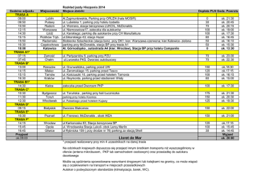 Godzina odjazdu TRASA A 09:00 09:50 10:50 12:15 14:30 15:15 15:50 16:30 18:00 TRASA A1* 07:15 07:45 TRASA B* 13:00 14:15 15:15 16:30 TRASA B1* 14:30 TRASA C* 10:30 11:30 12:30 TRASA D* 09:15 TRASA E* 10:30 TRASA F* 14:15 15:45 16:45 Przyjazd ok.09:00 Miejscowość Rozkład jazdy Hiszpania 2014 Miejsce zbiórki Lublin Puławy Radom Warszawa Łódź Piotrków Tryb. Radomsko Częstochowa Katowice Al.Zygmuntowskie, Parking przy ORLEN (hala MOSIR) ul. Lubelska 1; parking przy hotelu Izabella ul. Wernera, stacja benzynowa LUKOIL, McDonalds ul. Niemcewicza17, zatoczka dla autokarów ul. Karskiego; parking dla autokarów przy CH Manufaktura ul.Sikorskiego 43; stacja Huzar Stobiecko Szlacheckie (stacja benz. przy DK1: kier. Warszawa-czerwona; kier.Katowice- zielona parking przy McDonalds, stacja BP przy trasie A1 Al. Górnośląska , autostrada A4 (kier. Wrocław), Stacja BP przy hotelu Campanile 0 30 70 100 100 80 50 50 0 ok. 21:30 ok. 20:45 ok. 20:15 ok. 19:00 ok. 17:30 ok. 16:45 ok. 16:10 ok. 15:30 ok. 13:30 Zamość Chełm ul. Partyzantów 8, parking przy PZU ul.Lwowska PKS. Dworzec autobusowy 70 70 ok. 23.00 ok. 22.30 Rzeszów Mielec Tarnów Kraków ul. Grunwaldzka, parking przed UW ul. Żeromskiego 15; parking przed Tesco ul. Kościuszki 10, parking przed hotelem Tarnovia ul. Reymonta, parking przed stadionem Wisły 150 120 100 80 ok.18:30 ok.17:15 ok. 16:15 ok. 15:00 zatoczka przed Dworcem PKP 100 ok. 17:30 ul. Toruńska , parking przy hali Łuczniczka parking przy hotelu Kosmos ul. Pułaskiego przed hotelem Kujawy 175 150 125 ok. 21:30 ok. 20:30 ok. 19:30 Dworzec Biakomex 150 ok. 22:00 Poznań ul. Franowo; McDonalds , obok IKEA 150 ok. 21:00 Wrocław Opole Gliwice ul Karkonoska 63; Stacja benzynowa BP ul. Wrocławska:Stacja Lukoil- obok Leroy Merlin ul Rybnicka 159 ( przy drodze nr 78) parking za stacją Shell 120 100 30 ok.17:15 ok. 15:45 ok. 14:45 Wyjazd ok. 20:00 Kielce Bydgoszcz Toruń Włocławek Białystok Dopłata PLN Godz. Powrotu Lloret de Mar * przejazd realizowany przy min 4 uczestnikach na danej trasie Na odcinkach krajowych dopuszcza się przejazd innym środkiem transportu niż wyszczególniony w ofercie (antena mikrobusem, PKP lub samochodem osobowym) oraz przesiadkę do autokaru docelowego Możlie są spóźnienia spowodowane warunkami drogowymi lub kolejkami na granicy, co może wiązać się z oczekiwaniem na transport w miejscach przesiadkowych Autokar o podwyższonym standardzie (klimatyzacja, barek, WC).
