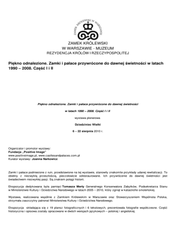 ZAMEK KRÓLEWSKI W WARSZAWIE - MUZEUM REZYDENCJA KRÓLÓW I RZECZYPOSPOLITEJ Piękno odnalezione. Zamki i pałace przywrócone do dawnej świetności w latach 1990 – 2008. Część I i II Piękno odnalezione. Zamki i pałace przywrócone do dawnej świetności w latach 1990 – 2008. Część I i II wystawa plenerowa Dziedziniec Wielki 6 – 22 sierpnia 2010 r. Organizator i promotor wystawy: Fundacja „Positive Image” www.positiveimage.pl, www.castlesandpalaces.com.pl Kurator wystawy: Joanna Narkowicz Zamki i pałace podniesione z ruin, przedstawione na tej wystawie, stanowiły znakomite przykłady udanej rewitalizacji. To obiekty z niezwykłą przeszłością, pieczołowicie odrestaurowane. Ich przywrócenie do dawnej świetności jest świadectwem niezwykłej pasji. Są znakiem potęgi historii. Ekspozycja dedykowana była pamięci Tomasza Merty Generalnego Konserwatora Zabytków, Podsekretarza Stanu w Ministerstwie Kultury i Dziedzictwa Narodowego w latach 2005 – 2010, który zginął w katastrofie smoleńskiej. Wystawa, realizowana wspólnie z Zamkiem Królewskim w Warszawie oraz Stowarzyszeniem Wspólnota Polska, otrzymała zaszczytny patronat Ministerstwa Kultury i Dziedzictwa Narodowego. Ekspozycja składająca się z 19 plansz fotograficznych i 6 tekstowych, prezentowała fotografie współczesne. Część historyczna i opisowa zostały opracowane w dwóch wersjach językowych – polskiej i angielskiej. Obiekty, które zostały zaprezentowane: Pałac Odrowążów Pałac skryty w zabytkowym parku krajobrazowym należy do najstarszych rezydencji w Polsce. Jednym z właścicieli posiadłości był gen. Roman Sołtyk, uczestnik Kampanii Napoleońskiej oraz Powstania Listopadowego, towarzysz broni ks. Józefa Poniatowskiego. Pałac Staniszów Renesansowy dwór z 2 poł. XVI w. został gruntownie przebudowany w stylu barokowym przez księcia Henryka Von Reuss w roku 1787, przy pałacu na przełomie XVIII i XIX w. założono piękny park krajobrazowy. Pałac został opisany przez Izabelę Fleming-Czartoryską w pamiętnikach z podróży w roku 1816 „Dyliżansem po Śląsku”. Odrestaurowany przez rodzinę Dzida. Pałac Wąsowo W roku 1868 majątek Wąsowo, należący w XVIII w. do Sylwestra Szczanieckiego, starosty średzkiego i posła na Sejm Rzeczypospolitej Obojga Narodów, nabył berliński kupiec Richard von Hardt. W latach 1870 – 1872 wzniósł on romantyczną budowlę w stylu neogotyckim, projektu Gustawa Erdmanna. Około roku 1900,Wąsowo wizytował cesarz Wilhelm II. Pałac Lubostroń Wybudowany w latach 1795 – 1800 wg. projektu Stanisława Zawadzkiego, na zlecenie Fryderyka hrabiego Skórzewskiego, na wzór warszawskiej Królikarni. Prace sztukatorskie wykonał Michał Ceptowicz, prace malarskie – prof. Franciszek Smuglewicz (twórca dekoracji Zamku Ujazdowskiego) wraz z bratem, Antonim Smuglewiczem. Kopułę pałacu ozdobiła rzeźba Atlasa – dzieło Władysława Marcinkowskiego. W Lubostroniu gościli wybitni przedstawiciele świata nauki i sztuki oraz członkowie polskich i europejskich rodów arystokratycznych. Pałac Mierzęcin Pałac wybudowany w latach 1861 – 1863 przez Roberta Friedricha von Waldow, w stylu neogotyku angielskiego wraz z romantycznym parkiem. Zamek Kliczków Wzniesiony w 1297 roku przez Bolka I Surowego, należał kolejno do rodzin: von Rechenberg, von Schellendorf, von Promnitz, zu Solms-Baruth. Gruntownie przebudowany w latach 1881 – 1885 przez berlińskich architektów – Henryka Kaysera oraz Karola von Grossheim. Park w stylu angielskim zaprojektował Eduard Petzold. W Kliczkowie gościł cesarz Wilhelm II. Pałac Krobielowice Pałac przekazany w roku 1810 feldmarszałkowi Gebhardowi Leberecht von Blücher, księciu von Wahlstadt w uznaniu zasług za zwycięstwo pod Waterloo. Odrestaurowany przez Chrisa E. Vaila – potomka von Blüchera z linii angielskiej. Pałac Alexandrów Schloss Romberg – początek klasycyzmu w architekturze na Dolnym Śląsku. Dzisiejszy Pałac Alexandrów w Samotworze został wybudowany w latach 1776 – 1781 przez Carla Gottharda Langhansa (architekta m.in. Bramy Brandenburskiej w Berlinie). Langhans zrealizował tu pełen program przestrzenny i architektoniczny wiejskiej rezydencji nowego typu, zainspirowany nowymi ideami artystycznymi sztuki angielskiego palladianizmu i francuskiego neoklasycyzmu, ale też miejscową, śląską tradycją budownictwa dworów wiejskich. Pałac w Małej Wsi Pałac wybudował Bazyli Walicki, uczestnik Sejmu Wielkiego, doradca i przyjaciel Stanisława Augusta Poniatowskiego. Król odwiedził Bazylego w 1788 roku, co upamiętnia inskrypcja na kamieniu umieszczonym w parku nad stawem. Zgodnie z ówczesną modą, pałac wybudowany został w stylu klasycystycznym, według projektu Hilarego Szpilowskiego, znanego w Królestwie architekta. Lechosław Hertz, historyk Mazowsza, określił Małą Wieś jednym z najpiękniejszych zabytków klasycyzmu w Polsce. Pałac Nieznanice Pierwsze wzmianki o Nieznanicach pochodzą z XVI w. Posiadłość przechodziła przez ręce wielu rodzin, aż w drugiej Pierwsze wzmianki o Nieznanicach pochodzą z XVI w. Posiadłość przechodziła przez ręce wielu rodzin, aż w drugiej połowie XIX w. odziedziczył ją Leon Wuensche – Polak niemieckiego pochodzenia. Jego syn Aureliusz zbudował w okresie I wojny światowej swoją nową siedzibę – modernistyczną budowlę z elementami pseudo renesansowymi. Pałac Galiny Pałac został wybudowany dla barona Botho zu Eulenburga w 1589 roku i przez ponad 400 lat pozostawał własnością tej rodziny. W roku 1945 nastały mroczne czasy dla pałacu, który został splądrowany, a jego ostatni właściciel, hrabia Botho Wend zu Eulenburg, zmarł podczas wywózki na Sybir. Pałac cudem ocalał, ale jego wnętrza zostały zniszczone. Po długim okresie złego gospodarowania, zaniedbania, a później opuszczenia, pałac wraz z całym otoczeniem popadł w ruinę. Pałac Szczawin Pierwsze zachowane wzmiank