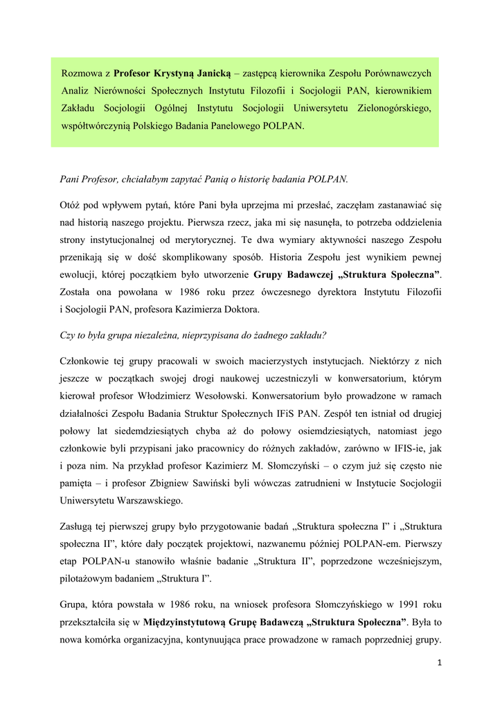 Rozmowa z Profesor Krystyną Janicką – zastępcą kierownika Zespołu Porównawczych Analiz Nierówności Społecznych Instytutu Filozofii i Socjologii PAN, kierownikiem Zakładu Socjologii Ogólnej Instytutu Socjologii Uniwersytetu Zielonogórskiego, współtwórczynią Polskiego Badania Panelowego POLPAN. Pani Profesor, chciałabym zapytać Panią o historię badania POLPAN. Otóż pod wpływem pytań, które Pani była uprzejma mi przesłać, zaczęłam zastanawiać się nad historią naszego projektu. Pierwsza rzecz, jaka mi się nasunęła, to potrzeba oddzielenia strony instytucjonalnej od merytorycznej. Te dwa wymiary aktywności naszego Zespołu przenikają się w dość skomplikowany sposób. Historia Zespołu jest wynikiem pewnej ewolucji, której początkiem było utworzenie Grupy Badawczej „Struktura Społeczna”. Została ona powołana w 1986 roku przez ówczesnego dyrektora Instytutu Filozofii i Socjologii PAN, profesora Kazimierza Doktora. Czy to była grupa niezależna, nieprzypisana do żadnego zakładu? Członkowie tej grupy pracowali w swoich macierzystych instytucjach. Niektórzy z nich jeszcze w początkach swojej drogi naukowej uczestniczyli w konwersatorium, którym kierował profesor Włodzimierz Wesołowski. Konwersatorium było prowadzone w ramach działalności Zespołu Badania Struktur Społecznych IFiS PAN. Zespół ten istniał od drugiej połowy lat siedemdziesiątych chyba aż do połowy osiemdziesiątych, natomiast jego członkowie byli przypisani jako pracownicy do różnych zakładów, zarówno w IFIS-ie, jak i poza nim. Na przykład profesor Kazimierz M. Słomczyński – o czym już się często nie pamięta – i profesor Zbigniew Sawiński byli wówczas zatrudnieni w Instytucie Socjologii Uniwersytetu Warszawskiego. Zasługą tej pierwszej grupy było przygotowanie badań „Struktura społeczna I” i „Struktura społeczna II”, które dały początek projektowi, nazwanemu później POLPAN-em. Pierwszy etap POLPAN-u stanowiło właśnie badanie „Struktura II”, poprzedzone wcześniejszym, pilotażowym badaniem „Struktura I”. Grupa, która powstała w 1986 roku, na wniosek profesora Słomczyńskiego w 1991 roku przekształciła się w Międzyinstytutową Grupę Badawczą „Struktura Społeczna”. Była to nowa komórka organizacyjna, kontynuująca prace prowadzone w ramach poprzedniej grupy. 1 Tworzyły ją osoby z IFIS PAN: profesor Ireneusz Białecki, profesor Henryk Domański, ja, pani doktor Joanna Sikorska, profesor Wojciech Zaborowski, profesorowie Kazimierz M. Słomczyński i Zbigniew Sawiński z UW oraz profesor Bogdan Mach (pierwotnie także z UW, a następnie także w IFIS PAN), który w tym czasie był już pracownikiem Instytutu Studiów Politycznych PAN. Kierowanie Grupą powierzono profesorowi Słomczyńskiemu, a ja pełniłam funkcję jego zastępcy, ponieważ w tym czasie profesor pracował w Ohio State University i często wyjeżdżał do USA. Jako kierownicy mieliśmy takie same uprawnienia, jak kierownicy zakładów. Podstawą działalności grupy był statut określający szczegółowo warunki jej działania. Jeden z tych warunków zakładał, że będziemy zabiegać o finansowanie poprzez uzyskiwanie grantów krajowych i zagranicznych. Na fundamencie międzyinstytutowej grupy badawczej z dniem 1 marca 1992 roku na wniosek członków-założycieli utworzono w IFiS PAN Zespół Porównawczych Analiz Nierówności Społecznych. Z wnioskiem o powołanie Zespołu zwrócił się do dyrektora profesor Kazimierz M. Słomczyński, a członkami-założycielami poza profesorem Słomczyńskim – który był wówczas docentem – byli ówcześni doktorzy: Krystyna Janicka, Bogdan W. Mach oraz Wojciech Zaborowski. Powodem, który skłonił nas do wystąpienia z tą inicjatywą, było uzyskanie grantu „Struktura społeczna a psychologiczne funkcjonowanie jednostki w warunkach zmiany społecznej”. Składałam nawet w imieniu grupy wniosek do Komitetu Badań Naukowych o przyznanie tego grantu. To były jednak bardzo duże środki, jak na owe czasy. Przyznano je na ściśle określonych warunkach, ponieważ wtedy właśnie wprowadzono nowe zasady finansowania nauki, co oznaczało między innymi odpowiedzialność finansową kierownika projektu. W relacjach z KBN-em nie czułam się równoprawnym partnerem, formalnie rzecz biorąc byłam na podporządkowanej pozycji. W przypadku niepowodzenia cały ciężar odpowiedzialności spoczywałby na mnie. Pamiętam, że zwracałam się do różnych instytucji ubezpieczeniowych – także do Powszechnego Zakładu Ubezpieczeń – z pytaniem, czy można się ubezpieczyć od finansowego ryzyka w działalności naukowej. Ale sytuacja taka stanowiła wtedy novum, patrzono na mnie jak na osobę z innego świata. Ostatecznie nie zdecydowałam się wtedy wziąć na siebie takiej odpowiedzialności, więc profesor Słomczyński przejął oficjalnie kierownictwo tego grantu. Celem Zespołu była w początkowym okresie jego działalności przede wszystkim realizacja grantu, a także stworzenie wspólnej platformy badawczej, umożliwiającej zajęcie się w spójnych ramach teoretycznych możliwie pełnym 2 zakresem problemów ilustrujących stan społeczeństwa i jego przekształcenia – zarówno w ujęciu dynamicznym, jak i międzykrajowym. Zespół Porównawczych Analiz Nierówności Społecznych został powołany na trzy lata. Pozostawał pod nadzorem dyrektora, chociaż kierownikiem był profesor Słomczyński. Co pewien czas występowaliśmy o przedłużenie działalności Zespołu. W pewnym momencie staliśmy się formalnie jego pracownikami, odchodząc z naszych poprzednich zakładów. Ja na przykład byłam pierwotnie zatrudniona w Zakładzie Badania Nierówności Społecznych, którego kierownikiem w pierwszym okresie działalności był docent Wacław Makarczyk, a później profesor Edmund Wnuk-Lipiński. Następnie przeszłam do Zakładu Struktury Społecznej, utworzonego przez pro
