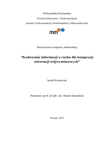 Politechnika Poznańska Wydział Elektroniki i Telekomunikacji Katedra Telekomunikacji Multimedialnej i Mikroelektroniki Streszczenie rozprawy doktorskiej “Kodowanie informacji o ruchu dla kompresji sekwencji trójwymiarowych” Jacek Konieczny Promotor: prof. dr hab. inż. Marek Domański Poznań, 2012 Spis treści Spis treści...................................................................................................................... 3 1. Zakres i cel rozprawy.......................................................................................... 4 1.1. Zakres rozprawy........................................................................................................................ 4 1.2. Cele i teza rozprawy.................................................................................................................. 8 1.3. Metodologia badań.................................................................................................................... 9 1.4. Przegląd pracy ......................................................................................................................... 11 2. Zasadnicze wyniki rozprawy ............................................................................ 12 2.1. Stan obecny ............................................................................................................................. 12 2.2. Oryginalne metody predykcji między-widokowej wykorzystujące informację o głębi .........13 2.3. Autorskie techniki kodowania informacji o ruchu wykorzystujące zaproponowane metody predykcji między-widokowej ...........................................................................................................15 2.4. Wpływ zaproponowanych metod predykcji na efektywność kompresji kodeków wielowidokowych ............................................................................................................................ 19 3. Podsumowanie pracy oraz wnioski ................................................................. 23 3.1. Podsumowanie pracy .............................................................................................................. 23 3.2. Oryginalne osiągnięcia zaprezentowane w rozprawie ............................................................ 26 3.3. Ogólne wnioski ....................................................................................................................... 27 Literatura ................................................................................................................... 30 Dokumentacja dorobku naukowego autora ........................................................... 32 1. Zakres i cel rozprawy 1.1. Zakres rozprawy Rozprawa doktorska dotyczy zagadnienia poprawy kompresji trójwymiarowych sekwencji wizyjnych. Zagadnienie to ma fundamentalne znaczenie dla rozwoju usług wykorzystujących trójwymiarowe sekwencje wizyjne, takich jak telewizja trójwymiarowa nowej generacji (3D-TV) oraz telewizja swobodnego punktu widzenia (FTV). Wspomniane nowe typy systemów wizyjnych budzą ogromne zainteresowanie, wykraczając zdecydowanie poza możliwości oferowane przez obecne systemy stereoskopowe dostępne komercyjnie. Systemy FTV pozwalają użytkownikowi na zmianę punktu obserwacji sceny niezależnie od położenia fizycznych kamer użytych do jej akwizycji. Treść prezentowana dla widoków wirtualnych uzyskiwana jest w tym przypadku poprzez wykorzystanie algorytmów syntezy, z użyciem informacji o teksturze i geometrii sceny wizyjnej. Z drugiej strony, technologia trójwymiarowa nowej generacji obecna w systemach 3D-TV pozwala na doświadczanie bardziej realistycznego efektu głębi. W rezultacie możliwe staje się odtworzenie efektu paralaksy wynikającej z ruchu, lub też percepcja głębi stereoskopowej bez konieczności stosowania specjalnych okularów. Przewiduje się, iż wykorzystanie trójwymiarowych sekwencji wizyjnych nowej generacji zaowocuje licznymi korzyściami, zwłaszcza w obszarze nauki i rozrywki. Dlatego też, w przyszłości, trójwymiarowe sekwencje wizyjne oferowane będą w różnego typu aplikacjach, jak choćby telewizji rozsiewczej, transmisji strumieniowej w Internecie, czy usługach mobilnych. Takie systemy wizyjne przyszłości wymagać będą jednak transmisji ogromnych strumieni danych do odbiorcy. Oznacza to, iż możliwości istniejących technik transmisji danych mogą okazać się niewystarczające, zwłaszcza w przypadku usług mobilnych. W rezultacie istnieje silna motywacja by stworzyć nowe techniki kompresji trójwymiarowych sekwencji wizyjnych, oferujące większy stopień kompresji dzięki bardziej efektywnemu wykorzystaniu istniejącej korelacji międzyobrazowej w sekwencjach wizyjnych. We wspomnianych systemach multimedialnych nowej generacji przetwarzaniu poddawane są wielowidokowe sekwencje wizyjne [Smo06, Kauf07], a więc sekwencje przedstawiające tą samą scenę wizyjną zarejestrowaną jednocześnie z wielu punktów obserwacji. Dodatkowo, w przypadku licznych aplikacji trójwymiarowych nowej generacji, obrazowi wielowidokowemu towarzyszy również informacja o strukturze geometrycznej sceny w postaci np. głębi stereoskopowej. Ten 4 szczególny rodzaj sekwencji wielowidokowych określany jest mianem trójwymiarowych sekwencji wizyjnych w formacie MVD (ang. Multiview Video plus Depth) [Smo07]. Niniejsza rozprawa dotyczy właśnie zagadnień związanych z przetwarzaniem trójwymiarowych sekwencji wizyjnych formacie MVD. Typowy system przetwarzania wielowidokowych sekwencji wizyjnych składa się z części odpowiedzialnych za akwizycję obrazu, transmisję oraz prezentację (Rys. 1.1). Informacja o głębi zazwyczaj wykorzystywana jest w takim systemie do syntezy widoków wirtualnych z użyciem dedykowanych algorytmów projekcji [Kauf07]. W rezultacie, po stronie odbiorczej takiego systemu wymagana jest dostępność zarówno wybranych widoków przetwarzanej sekwencji wi