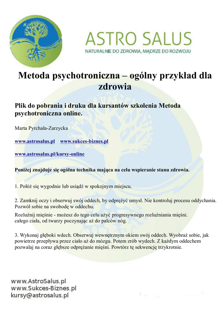 Metoda psychotroniczna – ogólny przykład dla zdrowia Plik do pobrania i druku dla kursantów szkolenia Metoda psychotroniczna online. Marta Pyrchała-Zarzycka www.astrosalus.pl www.sukces-biznes.pl www.astrosalus.pl/kursy-online Poniżej znajduje się ogólna technika mająca na celu wspieranie stanu zdrowia. 1. Połóż się wygodnie lub usiądź w spokojnym miejscu. 2. Zamknij oczy i obserwuj swój oddech, by odprężyć umysł. Nie kontroluj procesu oddychania. Pozwól sobie na swobodę w oddechu. Rozluźnij mięśnie - możesz do tego celu użyć progresywnego rozluźniania mięśni. całego ciała, od twarzy poczynając aż do palców nóg. 3. Wykonaj głęboki wdech. Obserwuj wewnętrznym okiem swój oddech. Wyobraź sobie, jak powietrze przepływa przez ciało aż do mózgu. Potem zrób wydech. Z każdym oddechem pozwalaj na coraz głębsze odprężanie mięśni. Powtórz tę sekwencję trzykrotnie. 4. Wyobraź sobie swój układ krwionośny - żyły, tętnice, naczynia włosowate i serce. Uświadom sobie jego pracę, przepływ krwi przez organizm. Powiedz do siebie w myślach z uczuciem pełnej mocy: „Niech mój system krwionośny był w całkowitej harmonii ze sobą samym i z innymi układami mojego organizmu. Niech usunie wszelkie zanieczyszczenia, odżywi i dotleni moje ciało dodając mu energii”. 5. Następnie wyobraź sobie swój układ oddechowy. Zobacz, jak pracują Twoje płuca i tchawica. Powiedz do siebie w myślach: „Przez potęgę mojej Nadświadomości rozkazuję, aby mój system oddechowy pracował doskonale i był w doskonałej harmonii ze sobą i wszystkimi pozostałymi układami mojego ciała”. 6. Potem wizualizuj swój system trawienny. Zobacz żołądek, jelita, trzustkę i wątrobę. Powtarzaj z uczuciem wielkiej siły i zdecydowania: „Przez moc Nadświadomości rozkazuję, aby mój system trawienny wyciągał maksimum składników odżywczych i energii z pokarmu, który spożywam oraz by pozostawał w całkowitej harmonii ze sobą i pozostałymi częściami mojego o rganizmu". 7. Wytwórz w swym umyśle obraz swojego szkieletu. Niech Twoje wewnętrzne oko ujrzy wszystkie kości i stawy. Powiedz w myślach: „Przez niezwykłą moc mojej Nadświadomości i potęgę mojego wyższego Ja rozkazuję, aby wszystkie zwapnienia, zgrubienia i schorzenia mojego szkieletu natychmiast zostały usunięte, a chore komórki odłączone, zastąpione zdrowymi i wydalone z organizmu. Niech mój układ szkieletowy będzie zdrowy i silny oraz niech pozostaje w harmonii z innymi częściami mojego ciała". 8. Teraz zobacz w umyśle swoje mięśnie. Powiedz do siebie w myślach: "Przez najwyższą moc mojego Wyższego Ja rozkazuję, aby moje mięśnie były zdrowe i silne. Niech pracują w harmonii ze sobą i z resztą mojego ciała. Niech tak będzie." 9. Następnie ujrzyj swój układ moczowy. Zobacz pęcherz, nerki i moczowody. Powiedz do siebie z uczuciem wielkiej władzy nad swoim ciałem: "Przez najwyższą mądrość mojej Nadświadomości rozkazuję, aby moje nerki świetnie pracowały i znakomicie oczyszczały mój organizm. Niech cały mój układ moczowy będzie zdrowy, silny i niech będzie w harmonii ze sobą i innymi narządami". 10. Teraz zajmij się swoimi narządami rozrodczymi. Zobacz je swoim wewnętrznym okiem. Powiedz: "Przez najwyższą moc mojej Nadświadomości rozkazuję, aby moje narządy płciowe pozostawały młode, silne i zdrowe. Niech funkcjonują prawidłowo i niech będę w pełnej harmonii ze sobą i innymi układami. Niech tak będzie". 11. Na końcu ujrzyj w umyśle siebie samego. Zobacz siebie w doskonałym zdrowiu i samopoczuciu. Powiedz do siebie w myślach z uczuciem władzy nad sobą i swoim życiem: „Niech wszystkie systemy mego ciała będą w całkowitej harmonii. Niech zostaną usunięte wszelkie toksyny i choroby obciążające mój organizm. Przez potęgę mojej Nadświadomości żądam, aby ciało moje będzie zdrowe, silne, pełne energii i młode. Niech tak się stanie". 12. Oddychaj głęboko i spokojnie. Obserwuj wewnętrznym okiem, jak powietrze wędruje przez Twoje ciało i natlenia mózg. Powtórz to ćwiczenie trzy razy za każdym coraz bardziej się relaksując. Powtarzaj: „Jestem doskonale zdrowy na ciele i umyśle. Tryskam energią i dobrym samopoczuciem”. 13. Oddychaj spokojnie i nadal odprężaj ciało i umysł. 14. Możesz powoli otworzyć oczy i wrócić do zwykłego stanu umysłu.