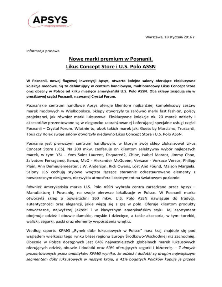 Warszawa, 18 stycznia 2016 r. Informacja prasowa Nowe marki premium w Posnanii. Likus Concept Store i U.S. Polo ASSN W Posnanii, nowej flagowej inwestycji Apsys, otwarto kolejne salony oferujące ekskluzywne kolekcje modowe. Są to debiutujący w centrum handlowym, multibrandowy Likus Concept Store oraz obecny w Polsce od kilku miesięcy amerykaoski U.S. Polo ASSN. Oba sklepy znajdują się w prestiżowej części Posnanii, nazwanej Crystal Forum. Poznaoskie centrum handlowe Apsys oferuje klientom najbardziej kompleksowy zestaw marek modowych w Wielkopolsce. Sklepy otworzyły tu zarówno marki fast fashion, polscy projektanci, jak również marki luksusowe. Ekskluzywne kolekcje ok. 20 marek odzieży i akcesoriów prezentowane są w elegancko zaaranżowanej i oferującej specjalne usługi części Posnanii – Crystal Forum. Właśnie tu, obok takich marek jak: Guess by Marciano, Trussardi, Tous czy Rolex swoje salony otworzyły niedawno Likus Concept Store i U.S. Polo ASSN. Posnania jest pierwszym centrum handlowym, w którym swój sklep zlokalizował Likus Concept Store (LCS). Na 200 mkw. zaoferuje on klientom selektywny wybór najlepszych marek, w tym: YSL - Yves Saint Laurent, Dsquared2, Chloe, Isabel Marant, Jimmy Choo, Salvatore Ferragamo, Kenzo, McQ - Alexander McQueen, Versace - Versace Versus, Philipp Plein, Ann Demeulemeester, J.W. Anderson, Rick Owens, Lost And Found, Maison Margiela. Salony LCS cechują stylowe wnętrza łączące starannie odrestaurowane elementy z nowoczesnym designem, niezwykła atmosfera i asortyment na światowym poziomie. Również amerykaoska marka U.S. Polo ASSN wybrała centra zarządzane przez Apsys – Manufakturę i Posnanię, na swoje pierwsze lokalizacje w Polsce. W Posnanii marka otworzyła sklep o powierzchni 160 mkw. U.S. Polo ASSN nawiązuje do tradycji, autentyczności oraz elegancji, jakie wiążą się z grą w polo. Oferuje klientom produkty nowoczesne, najwyższej jakości i w klasycznym amerykaoskim stylu. Jej asortyment obejmuje odzież i obuwie damskie, męskie i dziecięce, a także akcesoria, w tym: torebki, walizki, zegarki, paski oraz elementy wyposażenia wnętrz. Według raportu KPMG „Rynek dóbr luksusowych w Polsce” nasz kraj znajduje się pod względem wielkości tego rynku bliżej regionu Europy Środkowo-Wschodniej niż Zachodniej. Obecnie w Polsce dostępnych jest 64% najważniejszych globalnych marek luksusowych oferujących odzież, obuwie i dodatki oraz 69% oferujących zegarki i biżuterię. – Z danych prezentowanych przez analityków KPMG wynika, że odzież i dodatki są drugim największym segmentem dóbr luksusowych w naszym kraju, a 41% bogatych Polaków kupuje je przede wszystkim w centrach handlowych. W najbliższych latach, najbardziej dynamicznie będą się rozwijad przede wszystkim segmenty biżuterii i zegarków, artykułów piśmienniczych, alkoholi oraz samochodów premium i luksusowych. Według prognoz do 2020 roku polski rynek dóbr luksusowych wzrośnie o kolejne 27%. Biorąc po uwagę te dane zaoferowaliśmy klientom Posnanii szeroki wybór marek w strefie dedykowanej ofercie ekskluzywnej – mówi Marek Błędowski, dyrektor handlowy i członek zarządu Apsys Polska. *** Kontakt dla mediów: Joanna Stankiewicz, Effective Public Relations, tel. (022) 822 07 52, 605 106 740, e-mail: [email protected] O APSYS APSYS jest jednym z wiodących operatorów branży centrów handlowych w Polsce i we Francji. Firma powstała w 1996 roku i działa jako inwestor, deweloper, agent ds. najmu, menadżer projektu oraz zarządca nieruchomości. Tworzy innowacyjne, „szyte na miarę” projekty uwzględniające specyfikę danego miejsca, kontekst społeczny oraz środowisko naturalne. Do największych inwestycji firmy należą Manufaktura w Łodzi oraz Posnania w Poznaniu, otwarta w październiku br. jako największe centrum zakupów, rozrywki i rekreacji w Wielkopolsce 2 (100 tys. m GLA), wyróżnione nagrodą „Retail Project of the Year 2016”. APSYS zarządza obecnie 24 centrami handlowymi zlokalizowanymi w 17 największych miastach w Polsce. Ich łączna powierzchnia najmu wynosi 1 milion mkw. W ostatnich latach APSYS Polska był nagradzany przez PRCH, ICSC oraz Europa Property w dziedzinach rozwoju, zarządzania oraz marketingu. Więcej informacji: www.apsysgroup.pl