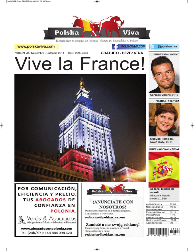NOVIEMBRE.qxp_FEBRERO.qxd24/11/159:34Página1 Vive la France! www.polskaviva.com núm./nr 35 Noviembre - Listopad 2014 ISSN 2299-3630 POLSKAVIVA.COM GRATUITO - BEZPŁATNA @polskaviva ENTREVISTA / WYWIAD Conrado Moreno. 14-15 POLÍTICA / POLITYKA Nuevos tiempos. Nowe czasy. 14-15 INTERNACIONAL - ŚWIAT España: historia de un éxito. Hiszpania: historia sukcesu. 16-19 Análisis/Analiza Negocios/Biznes Derecho/Prawo Entrevista/Wywiad Política/Polityka Internacional/Świat Gastronomía/Gastro Agenda/Agenda 9 772293 63081 3 02-05 06-09 10 12-13 14-15 16-19 20-22 23 05 NOVIEMBRE.qxp_FEBRERO.qxd24/11/159:34Página2 ANáLISIS Vive la France! POLSKAVIVA.COM 2 @polskaviva Cientos de ciudadanos de Varsovia se acercaron a las puertas de la Embajada de Francia para mostrar su dolor y apoyo. ChrIS GAjoS-ChrIS mA APArAt Setki warszawiaków zebrały się pod Ambasadą Francji, aby okazać wsparcie Francuzom. Paco Soto, periodista y corresponsal en Polonia VArSoVIA. Lo primero que quiero hacer en este artículo es rendir un homenaje a las víctimas de la masacre de París y transmitir mi más sincero pésame a sus familias. Dos de estas víctimas eran compatriotas: juan Alberto González y la joven de origen mexicano y nacionalidad española michelle Gil jaimes. han sido asesinados una mayoría de franceses, pero también ciudadanos de otras nacionalidades: tunecinos, británicos, chilenos… La verdad es que todos estos seres humanos son mis compatriotas, porque la patria para mí, en este momento tan duro, son los hombres y mujeres que han sufrido los zarpazos del terrorismo yihadista en París, la Ville Lumière. No me importa la nacionalidad, la lengua, la cultura, la religión, el color de piel… Los asesinos sin entrañas que han sembrado el terror y el caos en París son seres cobardes y despreciables y su mejor lugar es la cárcel o el cemente- rio. Estos criminales que matan en nombre de Dios y utilizan el islam para desprestigiarlo, embaucar a jóvenes descarriados y justificar sus aberraciones, están en guerra contra la civilización democrática en Europa y en el conjunto de occidente, pero también en el mundo islámico. Los musulmanes son sus principales víctimas. Además de asesinos, son mafiosos que roban, saquean, venden petróleo ilegalmente, violan y siembran dolor y lágrimas en los territorios que conquistan a sangre y fuego. En Europa, y especialmente en un país como Francia, intentan dividir a la sociedad entre la minoría musulmana y el resto y provocar conflictos civiles, además de chantajear a los gobiernos legítimos, sean éstos de derecha, centro o izquierda, y difundir el pánico en la población. Ofensiva policial, educativa y social Que estos criminales yihadistas no lo consigan depende en gran medida de la unidad de los demócratas, de una acertada ofensiva policial y militar de los estados y de políticas educativas y sociales adecuadas para evitar que jóvenes de origen musulmán, que en muchos casos ya no son inmigrantes como sus padres y abuelos, no se desenganchen de los países donde han crecido y no se dejen atrapar por los tentáculos del yihadismo y las corrientes ultrareaccionarias que se reclaman del islam. Creo que esto debería ser asumido por cualquier demócrata y ser humano con un mínimo de sensibilidad e inteligencia política. Yo no quiero que los dos millones de musulmanes que viven en España se conviertan en seres marginales. Al revés, aspiro a que la nación española, rica, diversa y plural, sea la casa común de todos sus ciudadanos; deseo que esta nación democrática sea la comunidad política que una dentro de la diversidad ideológica, cultural, social, religiosa y lingüística a un conjunto de ciudadanos iguales ante la ley y deseosos de compartir los mismos valores y normas. Esto es lo realmente importante y decisivo y no la pesadez de las raíces identitarias o las diferencias en materia religiosa o cultural. Estas diferencias deben subordinarse a los valores de la casa común cívica y democrática. hoy más que nunca, después de la terrible masacre terrorista de París, deberíamos evitar la desunión, las luchas políticas mezquinas, los ataques sectarios al adversario, porque es una manera de hacerle el juego al terrorismo. habrá tiempo para la crítica y el legítimo debate político contradictorio. Ahora no, por favor. El presidente del Gobierno español, mariano rajoy, dejó muy claro en el discurso institucional que pronunció después de los atentados terroristas de París que no hay una guerra de religiones entre occidente y los musulmanes, sino un conflicto entre la barbarie y la civilización. Unidad contra la barbarie La clase política francesa, con contadas excepciones, ha difundido un mensaje a la ciudadanía de unidad y firmeza contra el terrorismo yihadista. El líder de la izquierda radical gala, jean-Luc mélenchon, ha dejado claro que Francia no está en guerra contra el islam, sino contra un ejército de bárbaros, cobardes y delincuentes que cuentan con apoyos políticos y económicos en algunos países del Golfo Pérsico. mélenchon no ha aprovechado los trágicos sucesos parisinos para atacar al Gobierno socialista de manuel Valls y al presidente François hollande, y ha dejado bien claro que los tiempos de las disputas políticas sobre los orígenes del yihadismo y los errores cometidos por las potencias occidentales en el mundo islámico en las últimas décadas ya llegaran, pero ahora, ha insistido el dirigente izquierdista, lo que toca es la solidaridad con las víctimas del terror y sus familias y tejer lazos de amor y respeto entre los ciudadanos para evitar conflictos y divisiones. Amor y respeto es algo que no entienden los asesinos yihadistas. mélenchon se ha comportado como un político responsable y un patriota francés honorable. A ver si se les pega algo a los gerifaltes de la ultraizquierda española, que odian a su propio país con toda su alma, desprecian la bandera y los símbolos consti