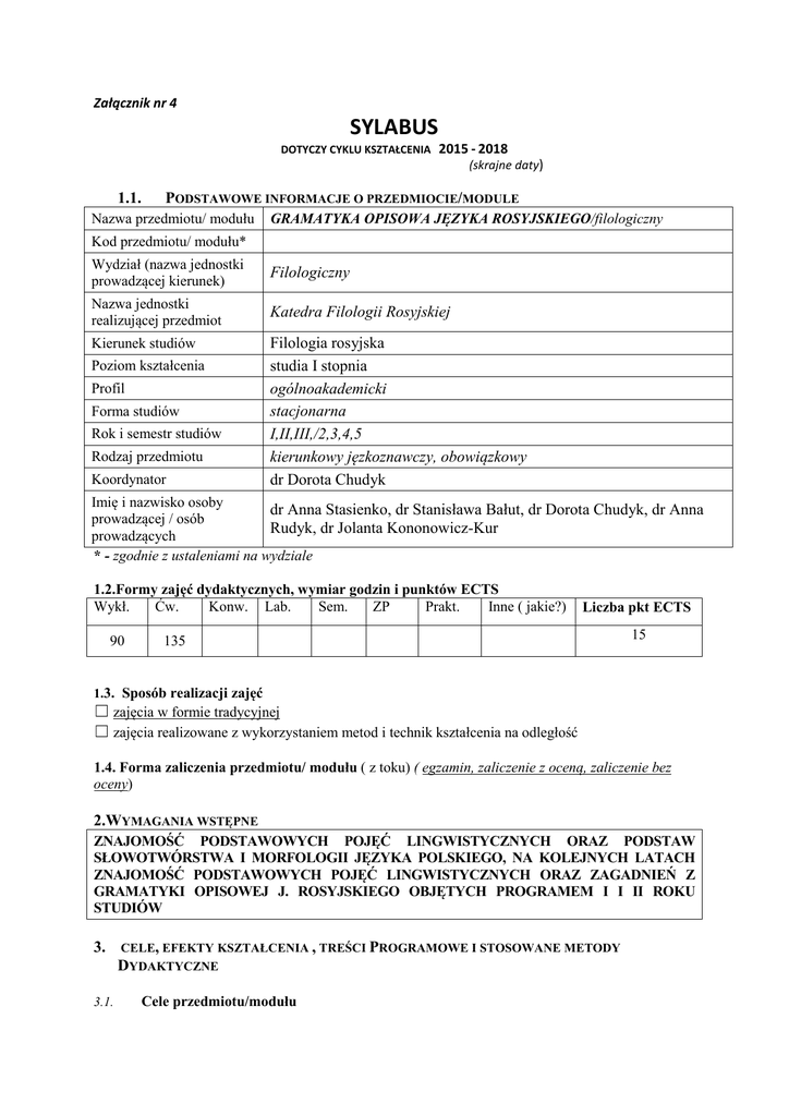 Załącznik nr 4 SYLABUS DOTYCZY CYKLU KSZTAŁCENIA 2015 - 2018 (skrajne daty) 1.1. PODSTAWOWE INFORMACJE O PRZEDMIOCIE/MODULE Nazwa przedmiotu/ modułu GRAMATYKA OPISOWA JĘZYKA ROSYJSKIEGO/filologiczny Kod przedmiotu/ modułu* Wydział (nazwa jednostki prowadzącej kierunek) Filologiczny Nazwa jednostki realizującej przedmiot Katedra Filologii Rosyjskiej Kierunek studiów Poziom kształcenia Profil Forma studiów Rok i semestr studiów Rodzaj przedmiotu Koordynator Filologia rosyjska studia I stopnia ogólnoakademicki stacjonarna I,II,III,/2,3,4,5 kierunkowy jęzkoznawczy, obowiązkowy dr Dorota Chudyk Imię i nazwisko osoby dr Anna Stasienko, dr Stanisława Bałut, dr Dorota Chudyk, dr Anna prowadzącej / osób Rudyk, dr Jolanta Kononowicz-Kur prowadzących * - zgodnie z ustaleniami na wydziale 1.2.Formy zajęć dydaktycznych, wymiar godzin i punktów ECTS Wykł. Ćw. Konw. Lab. Sem. ZP Prakt. Inne ( jakie?) 90 Liczba pkt ECTS 135 15 1.3. Sposób realizacji zajęć ☐ zajęcia w formie tradycyjnej ☐ zajęcia realizowane z wykorzystaniem metod i technik kształcenia na odległość 1.4. Forma zaliczenia przedmiotu/ modułu ( z toku) ( egzamin, zaliczenie z oceną, zaliczenie bez oceny) 2.WYMAGANIA WSTĘPNE ZNAJOMOŚĆ PODSTAWOWYCH POJĘĆ LINGWISTYCZNYCH ORAZ PODSTAW SŁOWOTWÓRSTWA I MORFOLOGII JĘZYKA POLSKIEGO, NA KOLEJNYCH LATACH ZNAJOMOŚĆ PODSTAWOWYCH POJĘĆ LINGWISTYCZNYCH ORAZ ZAGADNIEŃ Z GRAMATYKI OPISOWEJ J. ROSYJSKIEGO OBJĘTYCH PROGRAMEM I I II ROKU STUDIÓW 3. 3.1. CELE, EFEKTY KSZTAŁCENIA , TREŚCI PROGRAMOWE I STOSOWANE METODY DYDAKTYCZNE Cele przedmiotu/modułu C1 C2 Zapoznanie studentów z podstawami słowotwórstwa, kategoriami gramatycznymi rzeczownika, przymiotnika, liczebnika, zaimka, czasownika oraz z niesamodzielnymi częściami mowy. Zapoznanie studentów ze składnią rosyjską w zakresie syntaktycznych grup wyrazowych oraz struktury zdania pojedynczego. 3.2 EFEKTY KSZTAŁCENIA DLA PRZEDMIOTU/ MODUŁU EK ( efekt kształcenia) EK_01 EK_02 EK_03 Treść efektu kształcenia zdefiniowanego dla przedmiotu (modułu) Odniesienie do efektów kierunkowych (KEK) K_W_01, K_W_02, Wiedza: K_W_03, K_W_04, Student przyswaja wiedzę z zakresu słowotwórstwa, K_W_07, KW_10, charakteryzuje sposoby derywacji. Zapoznaje się ze K_W_12, K_W_16, sposobami tworzenia i użycia kategorii gramatycznych Rzeczowników, przymiotników, liczebników, zaimków, czasowników, przysłówków. Poznaje klasyfikacje niesamodzielnych części mowy. Student przyswaja wiedzę z zakresu syntaktycznych grup wyrazowych oraz struktury zdania pojedynczego Umiejętności: K_U_01, K_U_02, K_U_03, K_U_05, Student rozpoznaje sposoby derywacji, umie K_U_07,K_U_08, przeprowadzić analizę morfemową i słowotwórcza K_U_13, K_U_22 wyrazu, prawidłowo tworzy formy gramatyczne omawianych części mowy i używa ich w zdaniach. Student potrafi scharakteryzować poszczególne syntaktyczne grupy wyrazowe oraz dokonać analizy składniowej zdania pojedynczego. K_K_01, K_K_02, Kompetencje społeczne: K_K_03, K_K_04, K_K_05, K_K_06, Student dba o rzetelność wykonania postawionych zadań, jest otwarty na pogłębianie wiedzy w zakresie językoznawstwa, chętnie pracuje w grupie TREŚCI PROGRAMOWE A. Problematyka wykładu Treści merytoryczne 1. Słowotwórstwo jako dyscyplina naukowa. Przedmiot, zadania i metody. 2. Ogólne pojęcia słowotwórstwa. Termin morfem, klasyfikacja morfemów. 3. Budowa morfologiczna i słowotwórcza wyrazu. 4. Sposoby derywacji. 5. Ogólne pojęcia morfologii. Znaczenia gramatyczne słów. Gramatyczne formy słów. Kategorie gramatyczne. Słowoforma a forma słowa. Paradygmat morfologiczny. 6. Części mowy jako leksykalno-gramatyczne klasy słów. System części mowy w języku rosyjskim. Samodzielne i niesamodzielne części mowy. 7. Rzeczownik jako część mowy. Ogólne pojęcie terminu rzeczownik Leksykalno-gramatyczne 3.3 klasy rzeczowników. Rzeczowniki własne i pospolite. Rzeczowniki konkretne, abstrakcyjne, zbiorowe i materiałowe. Rzeczowniki żywotne i nieżywotne. 8. Kategoria rodzaju rzeczowników rosyjskich. Znaczenie kategorii rodzaju. Wykładniki rodzaju. Rodzaj słów-skrótowców. Warianty rodzajowe. Rodzaj rzeczowników nieodmiennych. Stylistyczne wykorzystanie kategorii rodzaju. 9. Kategoria liczby rzeczowników rosyjskich. Znaczenie i gramatyczne środki wyrazu kategorii liczby. Rzeczowniki używane tylko w jednej formie liczby. Stylistyczne użycie liczby pojedynczej w znaczeniu liczby mnogiej. Stylistyczne użycie liczby mnogiej znaczeniu liczby pojedynczej 10. Kategoria przypadka rzeczowników rosyjskich. Podstawowe znaczenia przypadków. Deklinacje rzeczowników i ich typy. 11. Przymiotnik. Ogólne pojęcie terminu przymiotnik. Leksykalno – gramatyczne klasy przymiotników. Znaczenie przymiotników jakościowych. Znaczenie przymiotników relacyjnych. Znaczenie i formy przymiotników dzierżawczych. Przejście przymiotników relacyjnych w jakościowe i jakościowych w relacyjne. 12. Krótka forma przymiotników. Cechy gramatyczne formy krótkiej. Stylistyczne i semantyczne cechy wyróżniające formy krótkiej. 13. Stopniowanie przymiotników. Znaczenie i formy wyrażenia stopnia wyższego. Znaczenie i formy wyrażenia stopnia najwyższego. 14. Liczebnik. Ogólne rozumienie terminu liczebnik. Cechy gramatyczne liczebników: morfologiczne, syntaktyczne. Klasyfikacja liczebników. 15. Odmiana liczebników. 16. Zaimki. Ogólne rozumienie terminu zaimek. Klasy semantyczne zaimków (osobowe, zwrotny, dzierżawcze, wskazujące, pytające, względne, określające, przeczące, nieokreślone). 17. Odmiana zaimków. 18. Czasownik. Ogólne rozumienie terminu czasownik. Bezokolicznik. Dwa tematy czasownika. Koniugacja czasowników. 19. Kategoria osoby i czasu. Charakterystyczne cechy tworzenia form osobowych niektórych czasowników. 20. Kategoria aspektu. Podstawowe znaczenia czasowników dokonanych i niedokonanych. Pary czasowników: dokonany – niedokonany. Two