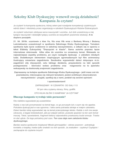 Szkolny Klub Dyskusyjny wznowił swoją działalność! Kampania Ja czytam! Ja czytam! to kampania społeczna, której celem jest rozwijanie kompetencji czytelniczych wśród dzieci i młodzieży przez organizację w szkołach Dyskusyjnych Klubów Edukacyjnych. Ja czytam! szturmem zdobywa serca nauczycieli i uczniów. Już dziś uczestniczą w niej tysiące nauczycieli i dziesiątki tysięcy uczniów ze wszystkich poziomów edukacji. A to dopiero początek. 21. 04. 2016r. uczniowie z klas Va, VIa oraz VIb wraz z Barbarą Wroną i Bożeną Leśniakiewicz uczestniczyli w spotkaniu Szkolnego Klubu Dyskusyjnego. Tematem spotkania było życie codzienne w szkolnej rzeczywistości, a odbyło się w oparciu o tekst Elżbiety Zubrzyckiej "Dręczyciel w klasie". Sama autorka poprzez łącze internetowe skierowała kilka słów do uczniów na omawiany temat. Wskazała na najważniejsze aspekty problemu, po czym nastąpiła dyskusja z udziałem młodych ludzi. Dodatkowym elementem inspirującym zgromadzonych był film animowany ilustrujący omawiane zagadnienie. Swobodne wypowiedzi dzieci dotyczące m.in. zagadnień siły dręczycieli, celu takiego działania, przyzwalania na taki sposób postępowania - bierności wobec problemu oraz reagowania na to zjawisko wskazywały na doskonałą znajomość zagadnienia. Zapraszamy na kolejne spotkanie Szkolnego Klubu Dyskusyjnego - jeśli masz coś do powiedzenia, interesujesz się różnymi tematami, jesteś wnikliwym obserwatorem rzeczywistości - przyjdź, spotkaj się z nami, podziel się swoimi opiniami i spostrzeżeniami! ZAPRASZAMY W CZWARTKI DO SALI 113 W tym roku czytamy obrazy, filmy, graffiti. OTO KILKA SŁÓW O KAMPANII "JA CZYTAM" Dlaczego kampania wywołuje takie poruszenie? Oto niektóre wypowiedzi jej uczestników: Każdy z nas lubi porozmawiać na temat tego, co go poruszyło lub z czym się nie zgadza. Potrzeba dyskusji jest w nas ogromna. I taka sama potrzeba istnieje w małym człowieku. Dzieci bardzo lubią wypowiadać się na temat przeczytanego tekstu. Każde z nich ma swoje odczucia, a bagaż doświadczeń, jaki już zdążyli zebrać, pozwala spojrzeć na ten sam temat inaczej. Tekst, opowiadanie, fragment lektury odpowiednio przekazany budzi emocje. Trzeba im dać ujście. Do tego potrzebny jest czas. Ten czas daje nam założenie klubu dyskusyjnego. Bardzo ważna społecznie inicjatywa! Młodzi gimnazjaliści - wbrew pozorom - potrzebuję kontaktu z książką; trzeba tylko znaleźć na nich sposób. Ja znalazłem - czytamy! Czytajcie i zachęcajcie do czytania innych! Dlaczego warto Ja czytam! wpisuje się w edukacyjne priorytety MEN! Minister Edukacji Narodowej ogłosiła edukacyjne priorytety na rok szkolny 2015/2016. Rozwijanie kompetencji czytelniczych oraz upowszechnianie czytelnictwa wśród dzieci i młodzieży znalazło się wśród tych priorytetów. Ja czytam! doskonale wpisuje się z wyznaczony przez MEN kierunek. Pozwala realizować zadania konieczne w sposób nieschematyczny, ciekawy i twórczy. Kampania Ja czytam! jest szansą: dla nauczycieli na: przełamanie codziennej rutyny wzmocnienie więzi z uczniami zdobycie nowych kompetencji promocję siebie i własnej szkoły podniesienie jakości własnej pracy kontakt z wybitnymi twórcami rozwój i satysfakcję z pracy dla szkoły na: realizację zadań zalecanych przez MEN osiąganie efektów, które są przedmiotem ewaluacji szkoły tworzenie przyjaznego klimatu sprzyjającego nauczaniu i uczeniu się budowanie relacji między wszystkimi członkami społeczności szkolnej wzajemny rozwój a nade wszystko dla uczniów na: polubienie czytania spotkanie i rozmowę na ważne tematy budowanie dobrych relacji całej społeczności szkolnej rozwój osobisty