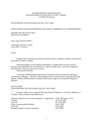 WOJEWÓDZTWO MAŁOPOLSKIE MAŁOPOLSKIE CENTRUM KULTURY „SOKÓŁ” w NOWYM SĄCZU XII KONKURS SZTUKI WOKALNEJ IM. ADY SARI POD PATRONATEM MINISTERSTWA KULTURY I DZIEDZICTWA NARODOWEGO DYREKTOR ARTYSTYCZNY HELENA ŁAZARSKA Nowy Sącz 20-26.05.2007 r. „Kochajcie muzykę w sobie, a nie siebie w muzyce” CELE Propagowanie wartościowej muzyki róŜnych stylów i gatunków poprzez realizowanie prawidłowej sztuki wokalnej. Najszerzej pojęty rozwój młodych śpiewaków: kształtowanie ich muzycznych i artystycznych upodobań oraz świadomości w zakresie zdobywania warsztatu wokalnego. Poszukiwanie własnej osobowości twórczej. Promowanie talentów. Uczczenie wielkiej polskiej śpiewaczki, światowej mistrzyni kunsztu wokalnego i zasłuŜonego pedagoga – Ady Sari, której droga do sławy znaczona była wytrwałą pracą nad głosem, a takŜe osobistą kulturą i ludzką Ŝyczliwością, stając się wzorem dla następnych pokoleń. REGULAMIN XII KONKURSU SZTUKI WOKALNEJ IM. ADY SARI I. Konkurs odbywa się w ramach Festiwalu Sztuki Wokalnej im. Ady Sari. Składa się z 3 etapów, które są otwarte dla publiczności. Otwarcie konkursu i losowanie kolejności występowania I ETAP II ETAP Próba z orkiestrą dla finalistów III ETAP Rozdanie nagród i koncert laureatów 1 19.05.2007 godz. 19.30 20-21.05.2007 22-23.05.2007 24.05. 2007 25.05.2007 26.05.2007 II. W Konkursie mogą brać udział studenci i absolwenci wydziałów wokalno-aktorskich polskich i zagranicznych uczelni muzycznych. Dopuszczalny wiek uczestników: kobiety urodzone po 20 maja 1977, męŜczyźni urodzeni po 20 maja 1975. Kandydaci winni zgłosić swe uczestnictwo na karcie zgłoszenia wypełnionej pismem drukowanym, przesłanej pocztą oraz per e-mail (wysoce poŜądane!) - wraz z dokumentem potwierdzającym wymagane kwalifikacje (kopia waŜnej legitymacji studenckiej lub dyplomu) oraz czarno-białą fotografią do 15 marca 2007 r. pod adres: Małopolskie Centrum Kultury SOKÓŁ Konkurs Sztuki Wokalnej im. Ady Sari ul. Długosza 3 33-300 Nowy Sącz 3. Do udziału w konkursie moŜe być dopuszczonych nie więcej niŜ 75 kandydatów – według kolejności nadesłanych zgłoszeń. 4. Uczestnicy są zobowiązani zgłosić swego akompaniatora lub poinformować czy będą korzystać ze współpracy z akompaniatorami konkursu. III .PROGRAM KONKURSU W programie konkursu kaŜdy kandydat jest obowiązany przygotować 10 dowolnych utworów*), wśród których muszą znajdować się dwie arie operowe przewidziane do wykonania z orkiestrą w III etapie - wybrane z podanej listy obowiązkowej. NaleŜy nieodzownie zaznaczyć, które arie kandydat pragnie wykonać z orkiestrą. Przy kaŜdym z 10 podanych utworów naleŜy zamieścić dokładny czas trwania!!! W I etapie kandydat wykonuje 3 utwory wedle własnego wyboru - obowiązkowo naleŜy je podkreślić w proponowanym programie!!! Brak podkreślenia spowoduje wybór repertuaru przez jury, w momencie, gdy kandydat będzie juŜ na estradzie. Czas trwania max. 12 min. W razie przekroczenia przewidzianego czasu jury ma prawo przerwać wykonanie! W II etapie kandydat będzie wykonywać 4 (lub 3) utwory z wyboru jury, o którym to wyborze będzie poinformowany po ogłoszeniu wyników z I etapu. III etap – do III etapu dopuszczonych zostanie 6-8 kandydatów, którzy wykonają wybrane przez siebie, z podanej listy, 2 arie operowe z towarzyszeniem orkiestry. Nie istnieje Ŝadna moŜliwość zmiany tych arii po 15.03.2007!!! Próba z orkiestrą będzie miała miejsce w dniu poprzedzającym III etap. *) Program powinien uwzględniać róŜne style i gatunki muzyczne oraz zawierać: 1 utwór polskiego kompozytora 1 utwór W.A. Mozarta 1 utwór zawierający istotne elementy kompozycji współczesnej Dobór programu wpływa na ogólną punktację. Ponadto: 2 * Jeden kompozytor moŜe być reprezentowany najwyŜej dwukrotnie (nie dotyczy to autora cyklu pieśni); * Obowiązuje śpiewanie w języku oryginalnym (za wyjątkiem polskiego utworu – w wypadku obcokrajowców), przy czym naleŜy wykazać się prawidłową wymową (!) w co najmniej dwóch językach obcych. * Wyklucza się transpozycje arii operowych, poza wyjątkami uznanymi w praktyce przez tradycję wykonawczą. * Zaleca się wykonywanie pieśni w powszechnie drukowanych wydaniach (na głos wysoki, średni i niski). NAGRODA za wykonanie PIEŚNI Istnieje moŜliwość ubiegania się o nagrodę dotyczącą wykonania cyklu pieśni albo jego części - z niemieckiego lub francuskiego kręgu muzyki (dla uczestników ze słowiańskiego kręgu muzyki) tak, aby czas trwania nie przekraczał 12 min. Wykonanie tego cyklu przewidziane jest w II etapie - obok obowiązującego programu. O przejściu kandydatów do finału decyduje łączna punktacja z I oraz II etapu. W rozdziale nagród brana jest pod uwagę łączna punktacja ze wszystkich trzech etapów. LISTA UTWORÓW PRZEWIDZIANYCH DO WYKONANIA z TOWARZYSZENIEM ORKIESTRY w III ETAPIE Haendel Giulio Cesare Serse Va tacito nascosto (Ct) Ombra mai fu (Ct/M) Gluck Orfeo ed Euridice Che faro senza Euridice (Ct/M) Mozart Le nozze di Figaro E Susanna non vien..Dove sono (S) Giunse alfin il momento... Deh vieni non tardar (S) Voi che sapete (M/Ct) Hai gia vinta la causa (Br) Non piú andrai (Br/B) La vendetta (B) Don Giovanni Batti, batti, o bel Masetto (S/M) I mio tesoro (T) Madamina, il catalogo e questo (B/Br) Die Zauberflöte Der Hölle Rache (S) Ah, ich fühl´s (S) Dies Bildnis (T) Ein Maedchen oder Weibchen (Br) O Isis und Osiris (B) Beethoven 3 Fidelio O waer ich schon mit dir vereint (S) Hat man nicht auch Gold beineben (B) Rossini Il Barbiere di Siviglia Una voce poco fa (E-dur/F-dur) (M/S) Il vecchiotto cerca moglie (M) Ecco ridente (T) Largo al factotum (Br) Un dottore della mia sorte (B) La calunia (B) Czajkowski Jewgienij Oniegin Puccini La Bohème Bizet Carmen Verdi La Traviata Moniuszko Straszny Dwór Strauss Fledermaus Ja nie spasobna k grusti tomnoj (M) Kuda, kuda (T) Wy mnie pisa