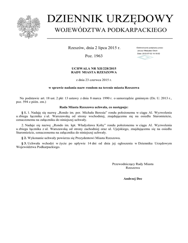 DZIENNIK URZĘDOWY WOJEWÓDZTWA PODKARPACKIEGO Rzeszów, dnia 2 lipca 2015 r. Elektronicznie podpisany przez: Janusz Władysław Olech Data: 2015-07-02 14:18:02 Poz. 1963 UCHWAŁA NR XII/228/2015 RADY MIASTA RZESZOWA z dnia 23 czerwca 2015 r. w sprawie nadania nazw rondom na terenie miasta Rzeszowa Na podstawie art. 18 ust. 2 pkt 13 ustawy z dnia 8 marca 1990 r. o samorządzie gminnym (Dz. U. 2013 r., poz. 594 z późn. zm.) Rada Miasta Rzeszowa uchwala, co następuje: § 1. 1. Nadaję się nazwę „Rondo im. por. Michała Beresia” rondu położonemu w ciągu Al. Wyzwolenia u zbiegu łącznika z ul. Warszawską od strony wschodniej, znajdującemu się na osiedlu Staromieście, oznaczonemu na załączniku do niniejszej uchwały. 2. Nadaje się nazwę „Rondo im. kpt. Władysława Koby” rondu położonemu w ciągu Al. Wyzwolenia u zbiegu łącznika z ul. Warszawską od strony zachodniej oraz ul. Ujejskiego, znajdującemu się na osiedlu Staromieście, oznaczonemu na załączniku do niniejszej uchwały. § 2. Wykonanie uchwały powierza się Prezydentowi Miasta Rzeszowa. § 3. Uchwała wchodzi w życie po upływie 14 dni od dnia jej ogłoszenia w Dzienniku Urzędowym Województwa Podkarpackiego. Przewodniczący Rady Miasta Rzeszowa Andrzej Dec Dziennik Urzędowy Województwa Podkarpackiego –2– Poz. 1963 Dziennik Urzędowy Województwa Podkarpackiego –3– Poz. 1963 Uzasadnienie Wnioskodawcą nadania dwóm rondom w ciągu Al. Wyzwolenia imion kpt. Władysława Koby oraz por. Michała Beresia jest Klub Radnych Prawa i Sprawiedliwości. Propozycja radnych PiS wynika z przekonania o konieczności zachowania pamięci o bohaterach, którzy swoją postawą w obronie wolności i niepodległości Polski stawili opór władzy komunistycznej, za co zapłacili najwyższą cenę. Działki zajęte pod w/w ronda stanowią własność Gminy Miasto Rzeszów. Kpt. Władysław Koba – urodził się 8 stycznia 1914 roku w Jarosławiu w rodzinie kupieckorzemieślniczej o tradycjach patriotycznych. Służył w 3 pułku piechoty legionów, jako dowódca 4 plutonu. W 1939 roku został awansowany do stopnia porucznika. W kampanii wrześniowej 1939 roku uczestniczył jako dowódca 1 kompanii ckm, która po poważnych stratach w walce pod Przyłęką, przedostała się do twierdzy Modlin. Po kapitulacji twierdzy Władysław Koba dostał się do niemieckiej niewoli, z której po miesiącu został zwolniony z obowiązkiem meldowania się w miejscu zamieszkania. Po podaniu fałszywego adresu powrócił na Podkarpacie, gdzie ukrywał się, a następnie podjął służbę konspiracyjną. Za swoją działalność dywersyjną był intensywnie poszukiwany przez gestapo. W okresie Polski lubelskiej był celem NKWD i UB. Służył w obwodzie Przemyśl AK, a po jej rozwiązaniu został komendantem Obwodu Przemyśl „Nie”. We wrześniu 1945 roku, został kierownikiem Rady WiN Przemyśl, a w maju 1947 objął dowodzenie okręgiem Rzeszów WiN, gdzie koncentrowano się na akcji propagandowo-informacyjnej. W związku z natężeniem aresztowań ze strony WUBP działalność okręgu Rzeszów została zawieszona, a Władysława Kobę we wrześniu 1947 roku aresztowano w Przemyślu, skąd został przetransportowany do Rzeszowa. Podczas rozprawy w październiku 1948 roku sąd uznał Kobę winnego zarzucanych mu czynów zwłaszcza udział w „Armii Krajowej” i „Wolność i Niezawisłość”. 21 października sąd w Rzeszowie skazał Kobę na karę śmierci, którą wykonano strzałem w tył głowy 31 stycznia 1949 roku w więzieniu na Zamku w Rzeszowie. Władysław Koba został pochowany w prowizorycznej mogile na cmentarzu w Zwięczycy. Por. Michał Bereś – pseudonim "Bem" urodził się 19 lutego 1911 roku w Rzeszowie – Staromieściu. Po wybuchu II wojny światowej brał udział w obronie Warszawy, aż do jej kapitulacji, a następnie unikając niewoli niemieckiej przedostał się do Rzeszowa. W lutym 1940 r. został przyjęty do Związku Walki Zbrojnej i złożył przysięgę przed Łukaszem Cieplińskim. „Bem” początkowo działał jako oficer do zleceń Dowódcy Obwodu, a następnie jako organizator i dowódca Placówki kryptonim 33, później 84 w Słocinie. Porucznik Michał Bereś 25 maja 1944 roku brał udział w akcji mającej na celu zlikwidowanie dwóch funkcjonariuszy Gestapo w Rzeszowie. „Bem” zagrożony aresztowaniem został przeniesiony na zastępcę komendanta Podobwodu AK Sędziszów w Obwodzie Dębica, gdzie brał udział w akcji „Burza” i zajmował się organizowaniem dywersji na trasach komunikacyjnych Rzeszów - Dębica. Po zajęciu tych terenów przez Sowietów we wrześniu 1944 roku wrócił do Rzeszowa i objął obowiązki drugiego zastępcy komendanta Rzeszowskiego Obwodu AK. Nękany ciągłymi najściami UB w maju 1945 r. po licznych zmianach miejsc pobytu przeniósł się do Sopotu. Wstąpił do organizacji WIN, w której działał do chwili aresztowania przez WUBP w Gdańsku w dniu 5 lutego 1947 roku. Wojskowy Sąd Rejonowy w Gdańsku skazał por. Michała Beresia na osiem lat więzienia i zastosował wobec niego amnestyjne darowanie 1/2 kary. Z więzienia został zwolniony w 1951 r. Ciągle nękany przez UB, pozbawiany pracy, w 1963 roku postanowił o przeprowadzce do Olsztyna, gdzie mieszkał do śmierci w 1996 roku. Michał Bereś został pochowany w grobowcu rodzinnym na rzeszowskim cmentarzu Pobitno.