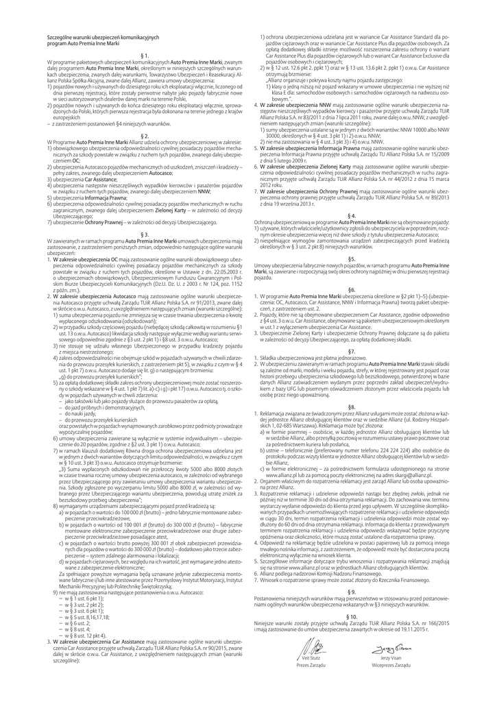 Szczególne warunki ubezpieczeń komunikacyjnych program Auto Premia Inne Marki § 1. W programie pakietowych ubezpieczeń komunikacyjnych Auto Premia Inne Marki, zwanym dalej programem Auto Premia Inne Marki, określonym w niniejszych szczególnych warunkach ubezpieczenia, zwanych dalej warunkami, Towarzystwo Ubezpieczeń i Reasekuracji Allianz Polska Spółka Akcyjna, zwane dalej Allianz, zawiera umowy ubezpieczenia: 1) pojazdów nowych i używanych do dziesiątego roku ich eksploatacji włącznie, liczonego od dnia pierwszej rejestracji, które zostały pierwotnie nabyte jako pojazdy fabrycznie nowe w sieci autoryzowanych dealerów danej marki na terenie Polski, 2) pojazdów nowych i używanych do końca dziesiątego roku eksploatacji włącznie, sprowadzonych do Polski, których pierwsza rejestracja była dokonana na terenie jednego z krajów europejskich – z zastrzeżeniem postanowień §4 niniejszych warunków. § 2. W Programie Auto Premia Inne Marki Allianz udziela ochrony ubezpieczeniowej w zakresie: 1) obowiązkowego ubezpieczenia odpowiedzialności cywilnej posiadaczy pojazdów mechanicznych za szkody powstałe w związku z ruchem tych pojazdów, zwanego dalej ubezpieczeniem OC; 2) ubezpieczenia Autocasco pojazdów mechanicznych od uszkodzeń, zniszczeń i kradzieży – pełny zakres, zwanego dalej ubezpieczeniem Autocasco; 3) ubezpieczenia Car Assistance; 4) ubezpieczenia następstw nieszczęśliwych wypadków kierowców i pasażerów pojazdów w związku z ruchem tych pojazdów, zwanego dalej ubezpieczeniem NNW; 5) ubezpieczenia Informacja Prawna; 6) ubezpieczenia odpowiedzialności cywilnej posiadaczy pojazdów mechanicznych w ruchu zagranicznym, zwanego dalej ubezpieczeniem Zielonej Karty – w zależności od decyzji Ubezpieczającego; 7) ubezpieczenie Ochrony Prawnej – w zależności od decyzji Ubezpieczającego. § 3. W zawieranych w ramach programu Auto Premia Inne Marki umowach ubezpieczenia mają zastosowanie, z zastrzeżeniem poniższych zmian, odpowiednio następujące ogólne warunki ubezpieczeń: 1. W zakresie ubezpieczenia OC mają zastosowanie ogólne warunki obowiązkowego ubezpieczenia odpowiedzialności cywilnej posiadaczy pojazdów mechanicznych za szkody powstałe w związku z ruchem tych pojazdów, określone w Ustawie z dn. 22.05.2003 r. o ubezpieczeniach obowiązkowych, Ubezpieczeniowym Funduszu Gwarancyjnym i Polskim Biurze Ubezpieczycieli Komunikacyjnych (Dz.U. Dz. U. z 2003 r. Nr 124, poz. 1152 z późn. zm.). 2. W zakresie ubezpieczenia Autocasco mają zastosowanie ogólne warunki ubezpieczenia Autocasco przyjęte uchwałą Zarządu TUiR Allianz Polska S.A. nr 91/2013, zwane dalej w skrócie o.w.u. Autocasco, z uwzględnieniem następujących zmian (warunki szczególne): 1) suma ubezpieczenia pojazdu nie zmniejsza się w czasie trwania ubezpieczenia o kwotę wypłaconego odszkodowania (odszkodowań); 2) w przypadku szkody częściowej pojazdu (niebędącej szkodą całkowitą w rozumieniu §1 ust. 13 o.w.u. Autocasco) likwidacja szkody następuje wyłącznie według wariantu serwisowego odpowiednio zgodnie z §3 ust. 2 pkt 1) i §8 ust. 3 o.w.u. Autocasco; 3) nie stosuje się udziału własnego Ubezpieczonego w przypadku kradzieży pojazdu z miejsca niestrzeżonego; 4) zakres odpowiedzialności nie obejmuje szkód w pojazdach używanych w chwili zdarzenia do przewozu przesyłek kurierskich, z zastrzeżeniem pkt 5), w związku z czym w § 4 ust. 1 pkt 7) o.w.u. Autocasco dodaje się lit. g) o następującym brzmieniu: „g) do przewozu przesyłek kurierskich”; 5) za opłatą dodatkowej składki zakres ochrony ubezpieczeniowej może zostać rozszerzony o szkody wskazane w § 4 ust. 1 pkt 7) lit. a)-c) i g) i pkt 17) o.w.u. Autocasco tj. o szkody w pojazdach używanych w chwili zdarzenia: – jako taksówki lub jako pojazdy służące do przewozu pasażerów za opłatą, – do jazd próbnych i demonstracyjnych, – do nauki jazdy, – do przewozu przesyłek kurierskich oraz powstałych w pojazdach wynajmowanych zarobkowo przez podmioty prowadzące wypożyczalnię pojazdów; 6) umowy ubezpieczenia zawierane są wyłącznie w systemie indywidualnym – ubezpieczenie do 20 pojazdów, zgodnie z §2 ust. 3 pkt 1) o.w.u. Autocasco; 7) w ramach klauzuli dodatkowej Równa droga ochrona ubezpieczeniowa udzielana jest w jednym z dwóch wariantów dotyczących limitu odpowiedzialności, w związku z czym w § 10 ust. 3 pkt 3) o.w.u. Autocasco otrzymuje brzmienie: „3) Suma wypłaconych odszkodowań nie przekroczy kwoty 5000 albo 8000 złotych w czasie trwania rocznej umowy ubezpieczenia autocasco, w zależności od wybranego przez Ubezpieczającego przy zawieraniu umowy ubezpieczenia wariantu ubezpieczenia. Szkody zgłoszone po wyczerpaniu limitu 5000 albo 8000 zł, w zależności od wybranego przez Ubezpieczającego wariantu ubezpieczenia, powodują utratę zniżek za bezszkodowy przebieg ubezpieczenia”; 8) wymaganymi urządzeniami zabezpieczającymi pojazd przed kradzieżą są: a) w pojazdach o wartości do 100 000 zł (brutto) – jedno fabrycznie montowane zabezpieczenie przeciwkradzieżowe, b) w pojazdach o wartości od 100 001 zł (brutto) do 300 000 zł (brutto) – fabrycznie montowane elektroniczne zabezpieczenie przeciwkradzieżowe oraz drugie zabezpieczenie przeciwkradzieżowe posiadające atest, c) w pojazdach o wartości brutto powyżej 300 001 zł obok zabezpieczeń przewidzianych dla pojazdów o wartości do 300 000 zł (brutto) – dodatkowo jako trzecie zabezpieczenie – system zdalnego alarmowania i lokalizacji; d) w pojazdach ciężarowych, bez względu na ich wartość, jest wymagane jedno atestowane z zabezpieczenie elektroniczne; Za spełniające powyższe wymagania będą uznawane jedynie zabezpieczenia montowane fabrycznie i/lub inne atestowane przez Przemysłowy Instytut Motoryzacji, Instytut Mechaniki Precyzyjnej lub Politechnikę Świętokrzyską; 9) nie mają zastosowania następujące postanowienia o.w.u. Autocasco: − w