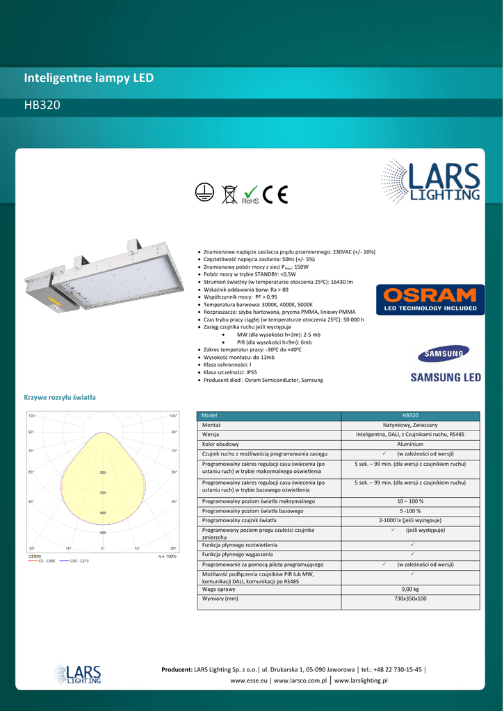 Inteligentne lampy LED HB320 Znamionowe napięcie zasilacza prądu przemiennego: 230VAC (+/- 10%) Częstotliwość napięcia zasilania: 50Hz (+/- 5%) Znamionowy pobór mocy z sieci Pmax: 150W Pobór mocy w trybie STANDBY: <0,5W Strumień świetlny (w temperaturze otoczenia 250C): 16430 lm Wskaźnik oddawania barw: Ra > 80 Współczynnik mocy: PF > 0,95 Temperatura barwowa: 3000K, 4000K, 5000K Rozpraszacze: szyba hartowana, pryzma PMMA, liniowy PMMA Czas trybu pracy ciągłej (w temperaturze otoczenia 250C): 50 000 h Zasięg czujnika ruchu jeśli występuje MW (dla wysokości h=3m): 2-5 mb PIR (dla wysokości h=9m): 6mb Zakres temperatur pracy: -300C do +400C Wysokość montażu: do 13mb Klasa ochronności: I Klasa szczelności: IP55 Producent diod : Osram Semiconductor, Samsung Krzywe rozsyłu światła Model HB320 Montaż Natynkowy, Zwieszany Wersja Inteligentna, DALI, z Czujnikami ruchu, RS485 Kolor obudowy Czujnik ruchu z możliwością programowania zasięgu Aluminium (w zależności od wersji) Programowalny zakres regulacji casu świecenia (po ustaniu ruch) w trybie maksymalnego oświetlenia 5 sek. – 99 min. (dla wersji z czujnikiem ruchu) Programowalny zakres regulacji casu świecenia (po ustaniu ruch) w trybie bazowego oświetlenia 5 sek. – 99 min. (dla wersji z czujnikiem ruchu) Programowalny poziom światła maksymalnego 10 – 100 % Programowalny poziom światła bazowego Programowalny czujnik światła 5 -100 % 2-1000 lx (jeśli występuje) Programowany poziom progu czułości czujnika zmierzchu Funkcja płynnego rozświetlenia Funkcja płynnego wygaszenia Programowanie za pomocą pilota programującego (jeśli występuje) Możliwość podłączenia czujników PIR lub MW, komunikacji DALI, komunikacji po RS485 Waga oprawy Wymiary (mm) (w zależności od wersji) 9,00 kg 730x350x100 Producent: LARS Lighting Sp. z o.o.│ ul. Drukarska 1, 05-090 Jaworowa │ tel.: +48 22 730-15-45 │ www.esse.eu │ www.larsco.com.pl │ www.larslighting.pl
