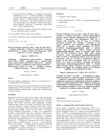 C 194/4 PL Dziennik Urzędowy Unii Europejskiej — ustanowiła klauzulę niezgodną z obowiązkiem przejrzystości przewidzianym w art. 2 wskazanej dyrektywy, przewidując warunek, wedle którego oferenci powinni dochować „kryteriów trwałości zakupów i odpowiedzialności społecznej przedsię biorstw” oraz wskazać, w jaki sposób spełniają owe kryteria i jak „przyczyniają się do polepszenia trwałości rynku kawy i ekotechnologicznej, społecznej i ekonomicznej odpowiedzial ności w zakresie produkcji kawy”, 30.6.2012 Sentencja 1) Odwołanie zostaje oddalone. 2) Helena Rubinstein SNC i L’Oréal SA zostają obciążone kosztami postępowania. (1) Dz.U. C 145 z 14.5.2011. Królestwo Niderlandów uchybiło zobowiązaniom ciążącym na nim na mocy wskazanych powyżej przepisów. 2) W pozostałym zakresie skarga zostaje oddalona. 3) Królestwo Niderlandów zostaje obciążone kosztami postępowania. (1) Dz.U. C 328 z 4.12.2010. Wyrok Trybunału (pierwsza izba) z dnia 10 maja 2012 r. — Helena Rubinstein, L'Oréal SA przeciwko Urzędowi Harmonizacji w ramach Rynku Wewnętrznego (znaki towarowe i wzory), Allergan Inc. (Sprawa C-100/11 P) (1) (Odwołanie — Wspólnotowy znak towarowy — Rozporzą dzenie (WE) nr 40/94 — Artykuł 8 ust. 5 — Słowne wspól notowe znaki towarowe BOTOLIST i BOTOCYL — Słowne i graficzne, krajowe i wspólnotowe znaki towarowe BOTOX — Unieważnienie prawa do znaku — Względne podstawy odmowy rejestracji — Naruszenie renomy) (2012/C 194/05) Język postępowania: angielski Strony Wnoszący odwołanie: Rubinstein, L'Oréal SA (przedstawiciel: A. von Mühlendahl, Rechtsanwalt) Druga strona postępowania: Urząd Harmonizacji w ramach Rynku Wewnętrznego (znaki towarowe i wzory) (przedstawiciel: A. Folliard-Monguiral, pełnomocnik), Allergan Inc. (przedstawiciel: F. Clark, barrister) Wyrok Trybunału (trzecia izba) z dnia 10 maja 2012 r. (wnioski o wydanie orzeczenia w trybie prejudycjalnym złożone przez Tribunal administratif de Montreuil — Francja) — Santander Asset Management SGIIC SA w imieniu FIM Santander Top 25 Euro Fi (C-338/11) przeciwko Directeur des résidents à l’étranger et des services généraux oraz Santander Asset Management SGIIC SA w imieniu Cartera Mobiliaria SA SICAV (C-339/11), Kapitalanlagegesellschaft mbH w imieniu d’Alltri Inka (C-340/11), Allianz Global Investors Kapitalanlagegesellschaft mbH w imieniu DBI Fonds APT no 737 (C-341/11), SICAV KBC Select Immo (C-342/11), SGSS Deutschland Kapitalanlagegesellschaft mbH (C-343/11), International Values Series of the DFA Investment Trust Co. (C-344/11), Continental Small Co. Series of the DFA Investment Trust Co. (C-345/11), SICAV GA Fund B (C-346/11), Generali Investments Deutschland Kapitalanlagegesellschaft mbH w imieniu AMB Generali Aktien Euroland (C-347/11) przeciwko Ministre du Budget, des Comptes publics, de la Fonction publique et de la Réforme de l’État (Sprawy połączone od C-338/11 do C-347/11) (1) (Artykuły 63 TFUE i 65 TFUE — Przedsiębiorstwa zbioro wego inwestowania w zbywalne papiery wartościowe (UCITS) — Odmienne traktowanie dywidend wypłacanych UCITS niebędącym rezydentami, podlegających potrąceniu podatku u źródła, i dywidend wypłacanych UCITS będącym rezydentami, niepodlegających takiemu potrąceniu — Konieczność uwzględ nienia sytuacji uczestników w celu oceny zgodności przepisów krajowych ze swobodą przepływu kapitału — Brak) (2012/C 194/06) Przedmiot Odwołanie od wyroku Sądu (trzecia izba) z dnia 16 grudnia 2010 r. w sprawach połączonych T-345/08 i T-357/08 Rubin stein i l’Oréal przeciwko OHIM — Allergan (Botolist i Botocyl), którym Sąd oddalił wniesioną przez właściciela słownego wspólnotowego znaku towarowego „BOTOLIST” dla towarów należących do klasy 3 skargę na decyzję R 863/2007-1 Pierw szej Izby Odwoławczej Urzędu Harmonizacji w ramach Rynku Wewnętrznego (OHIM) z dnia 28 maja 2008 r. uchylającą decyzję Wydziału Unieważnień, w której nie uwzględniono wniosku o unieważnienie prawa do rzeczonego znaku towaro wego, złożonego przez właściciela graficznych i słownych, wspólnotowych i krajowych znaków towarowych „BOTOX” dla towarów należących do klas 5 i 16 oraz usług należących do klasy 42 — Wykładnia i zastosowanie art. 8 ust. 4 rozporzą dzenia (WE) nr 40/94 (obecnie art. 8 ust. 4 rozporządzenia (WE) nr 207/2009) — Względne podstawy odmowy rejestracji — Naruszenie renomy — Wykładnia i zastosowanie art. 73 rozporządzenia nr 40/94 (obecnie art. 75 rozporządzenia nr 207/2009) — Obowiązek uzasadnienia Język postępowania: francuski Sąd krajowy Tribunal administratif de Montreuil Strony w postępowaniu przed sądem krajowym Strona skarżąca: Santander Asset Management SGIIC SA w imieniu FIM Santander Top 25 Euro Fi (C-338/11), Santander Asset Management SGIIC SA w imieniu Cartera Mobiliaria SA SICAV (C-339/11), Kapitalanlagegesellschaft mbH w imieniu d’Alltri Inka (C-340/11), Allianz Global Investors Kapitalanlage gesellschaft mbH w imieniu DBI Fonds APT no 737 (C-341/11), SICAV KBC Select Immo (C-342/11), SGSS Deutschland Kapi talanlagegesellschaft mbH (C-343/11), International Values Series of the DFA Investment Trust Co. (C-344/11), Continental Small Co. Series of the DFA Investment Trust Co. (C-345/11), SICAV GA Fund B (C-346/11), Generali Investments Deutsch land Kapitalanlagegesellschaft mbH w imieniu AMB Generali Aktien Euroland (C-347/11)