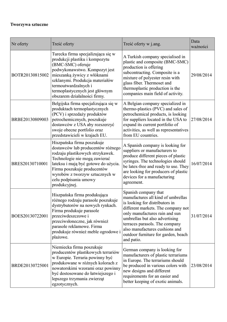 Tworzywa sztuczne Nr oferty Treść oferty Treść oferty w j.ang. Data ważności Turecka firma specjalizująca się w produkcji plastiku i kompozytu (BMC-SMC) oferuje podwykonawstwo. Kompozyt jest BOTR20130815002 mieszanką żywicy z włóknami szklanymi. Produkcja materiałów termoutwardzalnych i termoplastycznych jest głównym obszarem działalności firmy. A Turkish company specialised in plastic and composite (BMC-SMC) production is offering subcontracting. Composite is a 29/08/2014 mixture of polyester resin with glass fiber. Thermoset and thermoplastic production is the companies main field of activity. Belgijska firma specjalizująca się w produktach termoplastycznych (PCV) i sprzedaży produktów BRBE20130809003 petrochemicznych, poszukuje dostawców z USA aby rozszerzyć swoje obecne portfolio oraz przedstawicieli w krajach EU. A Belgian company specialized in thermo-plastics (PVC) and sales of petrochemical products, is looking for suppliers located in the USA to 27/08/2014 expand its current portfolio of activities, as well as representatives from EU countries. Hiszpańska firma poszukuje dostawców lub producentów różnego rodzaju plastikowych strzykawek. Technologie nie mogą zawierać BRES20130710001 lateksu i mają być gotowe do użycia. Firma poszukuje producentów wyrobów z tworzyw sztucznych w celu podpisania umowy produkcyjnej. A Spanish company is looking for suppliers or manufacturers to produce different pieces of plastic syringes. The technologies should 16/07/2014 be latex-free and ready to use. They are looking for producers of plastic devices for a manufacturing agreement. Hiszpańska firma produkująca różnego rodzaju parasole poszukuje dystrybutorów na nowych rynkach. Firma produkuje parasole BOES20130722001 przeciwdeszczowe i przeciwsłoneczne, jak również parasole reklamowe. Firma produkuje również meble ogrodowe i plażowe. Spanish company that manufactures all kind of umbrellas is looking for distributors in different markets. The company not only manufactures rain and sun 31/07/2014 umbrellas but also advertising terraces parasols. The company also manufactures cushions and outdoor furniture for garden, beach and patio. Niemiecka firma poszukuje producentów plastikowych terrariów w Europie. Terraria powinny być produkowane w różnych kolorach z BRDE20130725001 nowatorskimi wzorami oraz powinny być dostosowane do łatwiejszego i lepszego trzymania zwierząt egzotycznych. German company is looking for manufacturers of plastic terrariums in Europe. The terrariums should be produced in various colors with 23/08/2014 new designs and different requirements for an easier and better keeping of exotic animals.