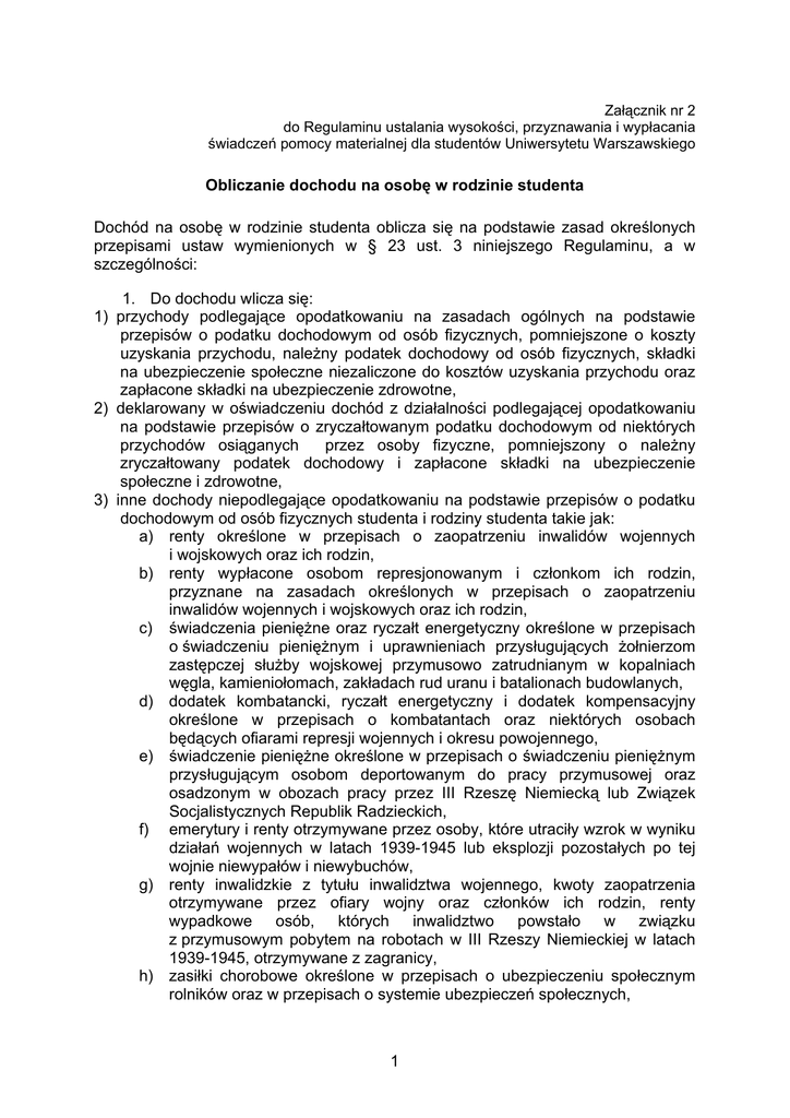 Załącznik nr 2 do Regulaminu ustalania wysokości, przyznawania i wypłacania świadczeń pomocy materialnej dla studentów Uniwersytetu Warszawskiego Obliczanie dochodu na osobę w rodzinie studenta Dochód na osobę w rodzinie studenta oblicza się na podstawie zasad określonych przepisami ustaw wymienionych w § 23 ust. 3 niniejszego Regulaminu, a w szczególności: 1. Do dochodu wlicza się: 1) przychody podlegające opodatkowaniu na zasadach ogólnych na podstawie przepisów o podatku dochodowym od osób fizycznych, pomniejszone o koszty uzyskania przychodu, należny podatek dochodowy od osób fizycznych, składki na ubezpieczenie społeczne niezaliczone do kosztów uzyskania przychodu oraz zapłacone składki na ubezpieczenie zdrowotne, 2) deklarowany w oświadczeniu dochód z działalności podlegającej opodatkowaniu na podstawie przepisów o zryczałtowanym podatku dochodowym od niektórych przychodów osiąganych przez osoby fizyczne, pomniejszony o należny zryczałtowany podatek dochodowy i zapłacone składki na ubezpieczenie społeczne i zdrowotne, 3) inne dochody niepodlegające opodatkowaniu na podstawie przepisów o podatku dochodowym od osób fizycznych studenta i rodziny studenta takie jak: a) renty określone w przepisach o zaopatrzeniu inwalidów wojennych i wojskowych oraz ich rodzin, b) renty wypłacone osobom represjonowanym i członkom ich rodzin, przyznane na zasadach określonych w przepisach o zaopatrzeniu inwalidów wojennych i wojskowych oraz ich rodzin, c) świadczenia pieniężne oraz ryczałt energetyczny określone w przepisach o świadczeniu pieniężnym i uprawnieniach przysługujących żołnierzom zastępczej służby wojskowej przymusowo zatrudnianym w kopalniach węgla, kamieniołomach, zakładach rud uranu i batalionach budowlanych, d) dodatek kombatancki, ryczałt energetyczny i dodatek kompensacyjny określone w przepisach o kombatantach oraz niektórych osobach będących ofiarami represji wojennych i okresu powojennego, e) świadczenie pieniężne określone w przepisach o świadczeniu pieniężnym przysługującym osobom deportowanym do pracy przymusowej oraz osadzonym w obozach pracy przez III Rzeszę Niemiecką lub Związek Socjalistycznych Republik Radzieckich, f) emerytury i renty otrzymywane przez osoby, które utraciły wzrok w wyniku działań wojennych w latach 1939-1945 lub eksplozji pozostałych po tej wojnie niewypałów i niewybuchów, g) renty inwalidzkie z tytułu inwalidztwa wojennego, kwoty zaopatrzenia otrzymywane przez ofiary wojny oraz członków ich rodzin, renty wypadkowe osób, których inwalidztwo powstało w związku z przymusowym pobytem na robotach w III Rzeszy Niemieckiej w latach 1939-1945, otrzymywane z zagranicy, h) zasiłki chorobowe określone w przepisach o ubezpieczeniu społecznym rolników oraz w przepisach o systemie ubezpieczeń społecznych, 1 i) j) k) l) m) n) o) p) q) r) s) t) środki bezzwrotnej pomocy zagranicznej otrzymywane od rządów państw obcych, organizacji międzynarodowych lub międzynarodowych instytucji finansowych, pochodzące ze środków bezzwrotnej pomocy przyznanych na podstawie jednostronnej deklaracji lub umów zawartych z tymi państwami, organizacjami lub instytucjami przez Radę Ministrów, właściwego ministra lub agencje rządowe, w tym również w przypadkach, gdy przekazanie tych środków jest dokonywane za pośrednictwem podmiotu upoważnionego do rozdzielania środków bezzwrotnej pomocy zagranicznej na rzecz podmiotów, którym służyć ma ta pomoc, należności ze stosunku pracy lub z tytułu stypendium osób fizycznych mających miejsce zamieszkania na terytorium Rzeczypospolitej Polskiej, przebywających czasowo za granicą – w wysokości odpowiadającej równowartości diet z tytułu podróży służbowej poza granicami kraju ustalonych dla pracowników zatrudnionych w państwowych lub samorządowych jednostkach sfery budżetowej na podstawie ustawy z dnia 26 czerwca 1974 r. – Kodeks pracy (Dz. U. z 1998 r. Nr 21, poz. 94, z późn. zm.), należności pieniężne wypłacone policjantom, żołnierzom, celnikom i pracownikom jednostek wojskowych i jednostek policyjnych użytych poza granicami państwa w celu udziału w konflikcie zbrojnym lub wzmocnienia sił państwa albo państw sojuszniczych, misji pokojowej, akcji zapobieżenia aktom terroryzmu lub ich skutkom, a także należności pieniężne wypłacone żołnierzom, policjantom, celnikom i pracownikom pełniącym funkcje obserwatorów w misjach pokojowych organizacji międzynarodowych i sił wielonarodowych, należności pieniężne ze stosunku służbowego otrzymywane w czasie służby kandydackiej przez funkcjonariuszy Policji, Państwowej Straży Pożarnej, Straży Granicznej i Biura Ochrony Rządu, obliczone za okres, w którym osoby te uzyskały dochód, wynagrodzenia członków rolniczych spółdzielni produkcyjnych z tytułu użytkowania przez spółdzielnię wniesionych wkładów gruntowych, dochody członków rolniczych spółdzielni produkcyjnych z tytułu członkostwa rolniczej spółdzielni produkcyjnej, alimenty na rzecz dzieci, stypendia określone w przepisach o stopniach naukowych i tytule naukowym oraz o stopniach i tytule w zakresie sztuki, a także inne stypendia przyznawane uczniom lub studentom, kwoty diet nieopodatkowane podatkiem dochodowym od osób fizycznych, otrzymywane przez osoby wykonujące czynności związane z pełnieniem obowiązków społecznych i obywatelskich, należności pieniężne otrzymywane z tytułu wynajmu pokoi gościnnych w budynkach mieszkalnych położonych na terenach wiejskich w gospodarstwie rolnym osobom przebywającym na wypoczynku oraz uzyskane z tytułu wyżywienia tych osób, dodatki za tajne nauczanie określone w ustawie z dnia 26 stycznia 1982 r. – Karta Nauczyciela (Dz. U. z 2003 r. Nr 118, poz. 1112, Nr 137, poz. 1304, Nr 203, poz. 1966 i Nr 213, poz. 2081), dochody uzyskane z działalności gospodarczej prowadzonej na podstawie zezwolenia n
