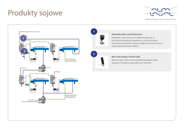 Produkty sojowe alfalaval.pl/spozywczeprocesyprzetworcze 1 Jednostka Alfa Laval Rotacheck+ Niezależne i samouczące się urządzenie zapewnia, że cykl mycia wykonany jest poprawnie, co jest istotne przy wytwarzaniu produktów sojowych, gdyż myte powierzchnie są często pokryte kulturami bakterii. 1 2 2 Alfa Laval Unique Control LKB Metoda ‘włącz i pracuj’ eliminuje błędy popełniane przez operatora i zmniejsza liczbę fałszywych alarmów.