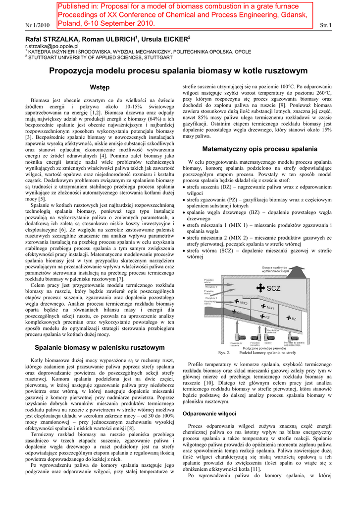 Nr 1/2010 Published in: Proposal for a model of biomass combustion in a grate furnace Proceedings of XX Conference of Chemical and Process Engineering, Gdansk, Poland, 6-10 September 2010. I APARATURA CHEMICZNA INŻYNIERIA Str.1 Rafal STRZALKA, Roman ULBRICH1, Ursula EICKER2 [email protected] 1 2 KATEDRA INŻYNIERII ŚRODOWISKA, WYDZIAŁ MECHANICZNY, POLITECHNIKA OPOLSKA, OPOLE STUTTGART UNIVERSITY OF APPLIED SCIENCES, STUTTGART Propozycja modelu procesu spalania biomasy w kotle rusztowym Wstęp Biomasa jest obecnie czwartym co do wielkości na świecie źródłem energii i pokrywa około 10-15% światowego zapotrzebowania na energię [1,2]. Biomasa drzewna oraz odpady mają największy udział w produkcji energii z biomasy (64%) a ich bezposrednie spalanie jest obecnie najważniejszym i najbardziej rozpowszechnionym sposobem wykorzystania potencjalu biomasy [3]. Bezpośrednie spalanie biomasy w nowoczesnych instalacjach zapewnia wysoką efektywność, niskie emisje substancji szkodliwych oraz stanowi opłacalną ekonomicznie możliwość wytwarzania energii ze źródeł odnawialnych [4]. Pomimo zalet biomasy jako nośnika energii istnieje nadal wiele problemów technicznych wynikających ze zmiennych właściwości paliwa takich jak zawartość wilgoci, wartość opałowa oraz niejednorodność rozmiaru i kształtu cząstek. Dodatkowym problemem związanym ze spalaniem biomasy są trudności z utrzymaniem stabilnego przebiegu procesu spalania wynikające ze złożoności automatycznego sterowania kotłami dużej mocy [5]. Spalanie w kotłach rusztowych jest najbardziej rozpowszechnioną technologią spalania biomasy, ponieważ tego typu instalacje pozwalają na wykorzystanie paliwa o zmiennych parametrach, a dodatkową ich zaletą są stosunkowo niskie koszty inwestycyjne i eksploatacyjne [6]. Ze względu na szerokie zastosowanie palenisk rusztowych szczególne znaczenie ma analiza wpływu parametrów sterowania instalacją na przebieg procesu spalania w celu uzyskania stabilnego przebiegu procesu spalania a tym samym zwiększenia efektywności pracy instalacji. Matematyczne modelowanie procesów spalania biomasy jest w tym przypadku skutecznym narzędziem pozwalającym na przeanalizowanie wpływu właściwości paliwa oraz parametrów sterowania instalacją na przebieg procesu termicznego rozkładu biomasy w palenisku rusztowym [7]. Celem pracy jest przygotowanie modelu termicznego rozkładu biomasy na ruszcie, który będzie zawierał opis poszczególnych etapów procesu: suszenia, zgazowania oraz dopalenia pozostałego węgla drzewnego. Analiza procesu termicznego rozkładu biomasy oparta będzie na równaniach bilansu masy i energii dla poszczególnych sekcji rusztu, co pozwala na uproszczenie analizy kompleksowych przemian oraz wykorzystanie powstałego w ten sposób modelu do optymalizacji strategii sterowania przebiegiem procesu spalania w kotłach dużej mocy. strefie suszenia utzymującej się na poziomie 100°C. Po odparowaniu wilgoci następuje szybki wzrost temperatury do poziomu 260°C, przy którym rozpoczyna się proces zgazowania biomasy oraz dochodzi do zapłonu paliwa na ruszcie [9]. Ponieważ biomasa zawiera stosunkowo dużą ilość substancji lotnych, znaczna jej część, nawet 85% masy paliwa ulega termicznemu rozkładowi w czasie gazyfikacji. Ostatnim etapem termicznego rozkładu biomasy jest dopalenie pozostałego węgla drzewnego, który stanowi około 15% masy paliwa. Matematyczny opis procesu spalania W celu przygotowania matematycznego modelu procesu spalania biomasy, komorę spalania podzielono na strefy odpowiadające poszczególym etapom procesu. Powstały w ten sposób model procesu spalania będzie składał się z sześciu stref: strefa suszenia (DZ) – nagrzewanie paliwa wraz z odparowaniem wilgoci strefa zgazowania (PZ) – gazyfikacja biomasy wraz z częściowym spaleniem substancji lotnych spalanie węgla drzewnego (BZ) – dopalenie powstałego węgla drzewnego strefa mieszania 1 (MIX 1) – mieszanie produktów zgazowania i spalania węgla strefa mieszania 2 (MIX 2) – mieszanie produktów gazowych ze strefy pierwotnej, początek spalania w strefie wtórnej strefa wtórna (SCZ) – dopalenie mieszanki gazowej w strefie wtórnej Spalanie biomasy w palenisku rusztowym Rys. 2. Kotły biomasowe dużej mocy wyposażone są w ruchomy ruszt, którego zadaniem jest przesuwanie paliwa poprzez strefy spalania oraz doprowadzanie powietrza do poszczególnych sekcji strefy rusztowej. Komora spalania podzielona jest na dwie części, pierwotną, w której następuje zgazowanie paliwa przy niedoborze powietrza oraz wtórną, w której następuje dopalenie mieszanki gazowej z komory pierwotnej przy nadmiarze powietrza. Poprzez uzyskanie dobrych warunków mieszania produktów termicznego rozkładu paliwa na ruszcie z powietrzem w strefie wtórnej możliwa jest eksploatacja układu w szerokim zakresie mocy – od 30 do 100% mocy znamionowej – przy jednoczesnym zachowaniu wysokiej efektywności spalania i niskich wartości emisji [8]. Termiczny rozkład biomasy na ruszcie paleniska przebiega zasadniczo w trzech etapach: suszenie, zgazowanie paliwa i dopalenie węgla drzewnego a ruszt podzielony jest na strefy odpowiadające poszczególnym etapom spalania z regulowaną ilością powietrza doprowadzanego do każdej z nich. Po wprowadzeniu paliwa do komory spalania następuje jego podgrzanie oraz odparowanie wilgoci, przy stałej temperaturze w Podział komory spalania na strefy Profile temperatury w komorze spalania, szybkość termicznego rozkładu biomasy oraz skład mieszanki gazowej zależy przy tym w głównej mierze od przebiegu termicznego rozkładu biomasy na ruszczie [10]. Dlatego też głównym celem pracy jest analiza termicznego rozkładu biomasy w strefie pierwotnej, która stanowić będzie podstawę do dalszej analizy procesu spalania biomasy w palenisku rusztowym. Odparowanie wilgoci Proces odparowania wilgoci zużywa znaczną część energii che