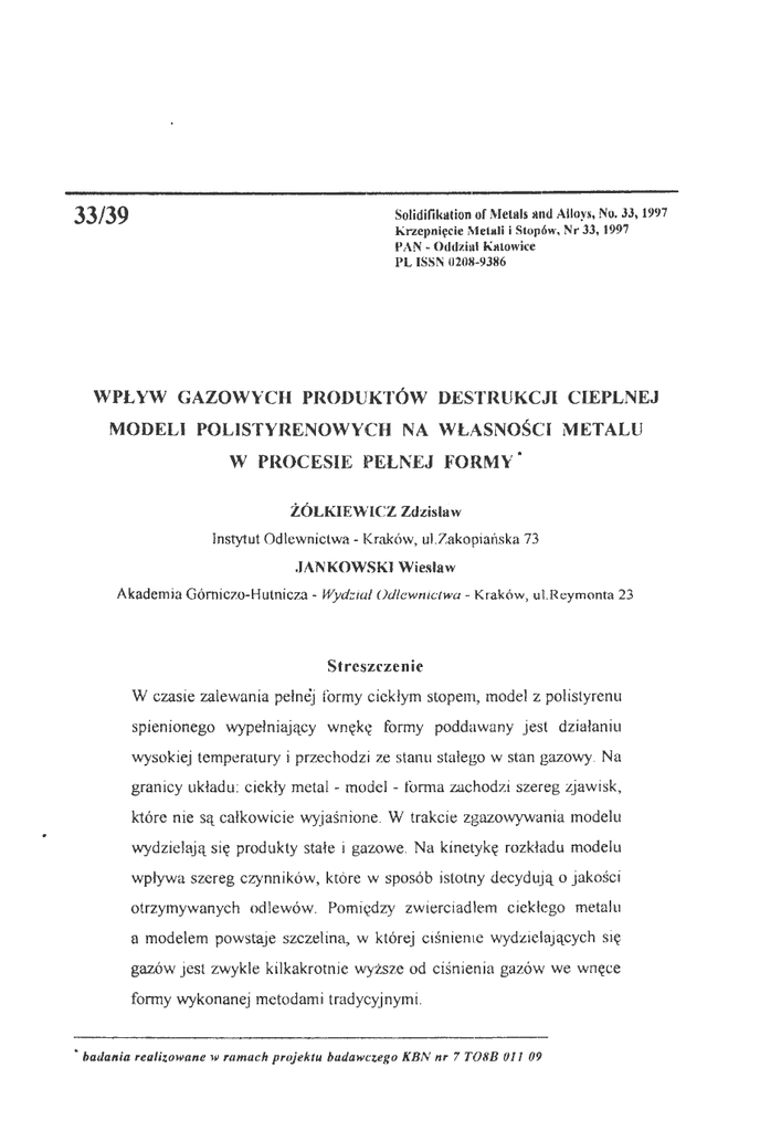 Solidinkation of Metais and Alłoys, No. 33,1997 Krzepnięcie Metali i Stopów, Nr 33, 1997 P AN - Oddzinl Katowice PL ISSN 0208-9386 33/39 WPŁ YW GAZOWYCH PRODUKTÓW DESTRUKCJI CIEPLNEJ MODELI POLISTYRENOWYCH NA WŁASNOŚCl METALU W PROCESIE PELNEJ FORMY. ŻÓLKIEWlCZ Zdzisław Instytut Odlewnictwa- Kraków, ul. Zakopiańska 73 JANKOWSKI Akademia Górniczo-Hutnicza- Wydział Wiesław Odlewnictwa- Kraków, ul. Reymonta 23 Streszezell i e W czasie zalewania pełnej formy ciekłym stopem, model z polistyrenu spienionego wypełniający wnękę formy poddawany jest stałego wysokiej temperatury i przechodzi ze stanu granicy układu : ciekły które nie wpływa w stan gazowy. Na metal - model - forma zachodzi szereg zjawisk, są całkowicie wyjaśnione wydzielają się działaniu produkty stałe W trakcie zgazowywania modelu i gazowe. Na kinetykę rozkładu szereg czynników, które w sposób istotny otrzymywanych odlewów. decydują o jakości Pomiędzy zwierciadłem ciekłego a modelem powstaje szczelina, w której gazów jest zwykle kilkakrotnie wyższe modelu metalu ciśnienie wydzielających się od ciśnienia gazów we formy wykonanej metodami tradycyjnymi . ·badania realizowane w ramach projektu badawczego KBN nr 7 TOSB 011 09 wnęce 279 Wprowadzenie pełnej Proces formy polega na umieszczeniu modelu z polistyrenu spienionego (styropianu) - na którego powierzchnię naniesiona jest powłoka ogniotrwała w skrzynce formierskiej oraz zasypaniu modelu odlewu i układu wlewowego suchym piaskiem kwarcowym, który następnie zwartości metal wlany do fonny zgazowuje model styropianowy, i gęstości . Ciekły odtwarzając zagęszczany jest przechodzą przez powłokę ogniotrwałą Technologie odlewnicze, dobnych tworzyw wykorzystujące osiągnięcia powstałe go doskonale w postaci odlewu. Gazy cieplnej modelu do maksymalnej w wyniku destrukcji i piasek na zewnątrz formy. modele z polistyrenu spienionego i po- charakteryzują się niewątpliwie wieloma zaletami, przede wszyst- kim technologicznymi, ekonomicznymi i ekologicznymi, z których główne to [ l, 5, 9]: • możliwość otrzymywania odlewów o złożonych i skomplikowanych ksztahach; • możliwość wytwarzania odlewów z otworami i wymiarach; skomplikowanych otworów wnękami, szczególnie o przepływowych, małych a nawet otworów z gwintem, bez stosowania rdzeni i obróbki skrawaniem; wynikających • brak na odlewach naddatków technologicznych, pochyleń z odlewniczych; • możliwość wytwarzania odlewów o założonej dokładności wymtaroweJ; • ograniczenie do minimum oczyszczania i obróbki skrawaniem gotowych odlewów z uwagi na prawie powierzdmie podziału sferoidalnego, brak zalewek (przeważnie nie występują modeli i tonny); • dla wielu stopów nie stosuje żeliwa zupełny się nadlewów na odlewach (np. dla żeliwa ciągliwego), co zdecydowanie żeliwa szarego, zwiększa uzysk metalu; • obniżone koszty wytwarzania odlewów w stosunku do innych technologii; w porównaniu z formami piaskowymi zalewanymi na wilgotno koszty te o Dzięki około 20 %. stosowanemu coraz w fonnie podczas zalewania i wzrost maleją wytrzymałości częścieJ w stygnięcia proceste pełnej formy odlewu [6], uzyskuje formy, a z drugiej - ułatwienie się podciśnieniu z jednej strony lokalizacji (wychwytywania) 280 gazowych produktów destrukcji cieplnej modeli, co daje na przykład poprzez spalanie katalityczne, czy absorbcję możliwość przez węgiel ich neutralizacji aktywny. Dzięki temu proces zyskuje walory ekologiczne i polepszenia warunków pracy. Modele z polistyrenu spienionego wykorzystuje zarówno ze stopów metali o dokładności nieżelaznych, jak i stopów wymiarowej, porównywalnej z się do wykonywania odlewów żelaza. dokładnością Otrzymuje się odlewy odlewów wykonanych metodami: odlewania grawitacyjnego do kokil, formowania skorupowego, jak również wytapianych modeli . Jakość modelu polistyrenowego, lat powierzchni odlewów odpowiada ściśle osiemdziesiątych kilkadziesiąt amerykańskich, i Dlatego też już powierzchni od drugiej połowy odlewn i, a obecnie ponad sto, przede wszystkim: angielskich, francuskich , ukraińskich rosyjskich, odwzorowując . go jakości włoskich , stosuje japońskich , różne kanadyjskich, niemieckich, odmiany procesu pełnej formy do produkcji odlewów: maszynowych, motoryzacyjnych, artystycznych i innych. Szersze omówienie pełnej ważniejszych czynników technologicznych, występujących w procesie formy, autorzy referatu przedstawili w pracy [3]. Istota zagadnienia Przechodzenie modelu polistyrenowego ze stanu oddziaływania ciepła ciekłego w wyniku procesem złożonym. szybkości mają wpływ następujące lub w stan gazowy, wypełniającego wnękę Zgazowywanie (odparowywanie) modelu zować szybkością liniową, objętościową tej metalu stałego masową można formy, jest scharaktery- tego procesu (V). Na wartość czynniki: + powierzchnia styku ciekłego metalu z modelem, + stosunek powierzchni styku model - ciekły metal do powierzchni przekroju poprzecznego modelu, + własności tworzywa modelu, w tym gęstość materiału modelu, + konfiguracja modelu, + temperatura ciekłego metalu, + przepuszczalność formy (przede wszystkim ogniotrwałej), przepuszczalność ceramicznej powloki 281 własności • tennofizyczne fonny, • temperatura fonny, ł różnice ciśnień Kinetykę we wnęce działanie można procesu zgazowywania modelu z polistyrenu spienionego przedstawić następującymi * fonny, w fonnie i na zewnątrz formy. etapami [2, 7, 10]: promieniowania z lustra ciekłego powierzchnię metalu na styku metal - model; * promieniowanie z lustra ciekłego metalu do fazy cieklej modelu i powstawanie Jazy gazowej ; • przewodzenie ciepła przez fazę gazową do fazy ciekłej i stałej modelu; • konwekcja ciepła w szczelinie gazowej. Ciepło dostarczone przez polistyrenowego ze stanu przepuszczalności ciekły stałego się zapewnić transfonnację w
