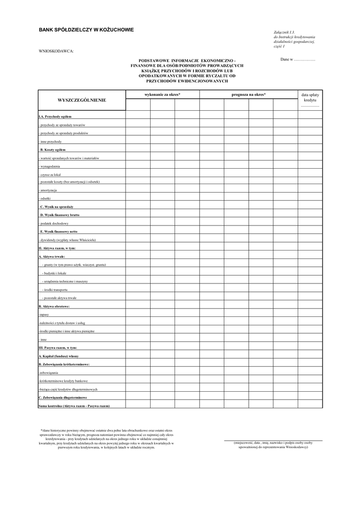 BANK SPÓŁDZIELCZY W KOŻUCHOWIE Załącznik I.3. do Instrukcji kredytowania działalności gospodarczej, część I WNIOSKODAWCA: PODSTAWOWE INFORMACJE EKONOMICZNO FINANSOWE DLA OSÓB/PODMIOTÓW PROWADZĄCYCH KSIĄŻKĘ PRZYCHODÓW I ROZCHODÓW LUB OPODATKOWANYCH W FORMIE RYCZAŁTU OD PRZYCHODÓW EWIDENCJONOWANYCH wykonanie za okres* WYSZCZEGÓLNIENIE prognoza na okres* Dane w ……………. data spłaty kredytu .................. I.A. Przychody ogółem - przychody ze sprzedaży towarów - przychody ze sprzedaży produktów - inne przychody B. Koszty ogółem - wartość sprzedanych towarów i materiałów - wynagodzenia - czynsz za lokal - pozostałe koszty (bez amortyzacji i odsetek) - amortyzacja - odsetki C. Wynik na sprzedaży D. Wynik finansowy brutto - podatek dochodowy E. Wynik finansowy netto - dywidendy (wypłaty własne Właściciela) II. Aktywa razem, w tym: A. Aktywa trwałe: - grunty (w tym prawo użytk. wieczyst. gruntu) - budynki i lokale - urządzenia techniczne i maszyny - środki transportu - pozostałe aktywa trwałe B. Aktywa obrotowe: -zapasy -należności z tytułu dostaw i usług -środki pieniężne i inne aktywa pieniężne - inne III. Pasywa razem, w tym: A. Kapitał (fundusz) własny B. Zobowiązania krótkoterminowe: -zobowiązania -krótkoterminowe kredyty bankowe -bieżąca część kredytów długoterminowych C. Zobowiązania długoterminowe Suma kontrolna (Aktywa razem - Pasywa razem) */dane historyczne powinny obejmować ostatnie dwa pełne lata obrachunkowe oraz ostatni okres sprawozdawczy w roku bieżącym, prognoza natomiast powinna obejmować co najmniej cały okres krerdytowania - przy kredytach udzielanych na okres jednego roku w układzie conajmniej kwartalnym, przy kredytach udzielanych na okres powyżej jednego roku w okresach kwartalnych w pierwszym roku kredytowania, w kolejnych latach w układzie rocznym. (miejscowość, data , imię, nazwisko i podpis osoby osoby upoważnionej do reprezentowania Wnioskodawcy) BANK SPÓŁDZIELCZY W KOŻUCHOWIE Załącznik I.3. do Instrukcji kredytowania działalności gospodarczej, część I WNIOSKODAWCA: Dane w ……………. PRZEPŁYWY ŚRODKÓW PIENIĘŻNYCH (książka przychodów i rozchodów, ryczłt od przychodów ewidencjonowanych) A. B. C. D. E. wykonanie za okres* prognoza na okres* data spłaty kredytu .................. I. PRZYCHODY Przychody - gotówkowe - z należności Sprzedaż składników majątkowych Kredyty obrotowe Kredyty inwestycyjny Inne przychody RAZEM PRZYCHODY II. WYDATKI Zakupy - gotówkowe - spłata zobowiązań Płace i narzuty na płace Czynsze Energia (ciepło, elektr., gaz) Ubezpieczenia Transport i załadunki Reklama Usługi obce Naprawy i remonty Podatek VAT Opłaty dzierżawne i leasing Prowizje i opłaty bankowe Odsetki od kredytu wnioskowanego Odsetki od innych kredytów Cła i inne podatki Wypłaty dla właściciela Inne wydatki inwestycyjne Inne wydatki nie wymienione wyżej Spłaty kredytu wnioskowanego Spłaty innych kredytów RAZEM WYDATKI WARTOŚĆ + GOTÓWKI (A-B) GOTÓWKA + NA POCZĄTEK OKRESU GOTÓWKA + KOŃCOWA (C+D) GOTÓWKA SKUMULOWANA ZADŁUŻENIE */dane historyczne powinny obejmować ostatnie dwa pełne lata obrachunkowe oraz ostatni okres sprawozdawczy w roku bieżącym, prognoza natomiast powinna obejmować co najmniej cały okres krerdytowania - przy kredytach udzielanych na okres jednego roku w układzie conajmniej kwartalnym, przy kredytach udzielanych na okres powyżej jednego roku w okresach kwartalnych w pierwszym roku kredytowania, w kolejnych latach w układzie rocznym. (miejscowość, data , imię, nazwisko i podpis osoby osoby upoważnionej do reprezentowania Wnioskodawcy) BANK SPÓŁDZIELCZY W KOŻUCHOWIE Załącznik I.3. do Instrukcji kredytowania działalności gospodarczej, część I WNIOSKODAWCA: Dane w ……………. PODSTAWOWE INFORMACJE EKONOMICZNO FINANSOWE DLA OSÓB OPODATKOWANYCH W FORMIE KARTY PODATKOWEJ wykonanie za okres* WYSZCZEGÓLNIENIE prognoza na okres* data spłaty kredytu .................. A. Przychody z prowadzonej działalności Przychody ze sprzedaży towarów i produktów Pozostałe przychody B. Koszty ogółem wartość sprzedanych towarów i materiałów wynagrodzenia czynsz za lokal pozostałe koszty C. Wynik na sprzedaży odsetki D. Wynik finansowy brutto -wysokość podatku określona przez Urząd Skarbowy E. Wynik finansowy netto wypłaty własne Właściciela F. Posiadane środki trwałe: - budynki, budowle, grunty - urządzenia techniczne i maszyny - środki transportu - pozostałe aktywa trwałe G. Posiadane środki obrotowe: - zapasy - należności z tytułu dostaw i usług - środki pieniężne - inne H. Kapitał (fundusz własny) I. Zobowiąznia krótkoterminowe - zobowiązania - krótkoterminowe kredyty bankowe - bieżąca cześć kredytów długoterminowych J. Zobowiązania długoterminowe */dane historyczne powinny obejmować ostatnie dwa pełne lata obrachunkowe oraz ostatni okres sprawozdawczy w roku bieżącym, prognoza natomiast powinna obejmować co najmniej cały okres krerdytowania - przy kredytach udzielanych na okres jednego roku w układzie conajmniej kwartalnym, przy kredytach udzielanych na okres powyżej jednego roku w okresach kwartalnych w pierwszym roku kredytowania, w kolejnych latach w układzie rocznym. (miejscowość, data , imię, nazwisko i podpis osoby osoby upoważnionej do reprezentowania Wnioskodawcy) BANK SPÓŁDZIELCZY W KOŻUCHOWIE Załącznik I.3. do Instrukcji kredytowania działalności gospodarczej, część I WNIOSKODAWCA: Dane w ……………. wykonanie za okres* PRZEPŁYWY ŚRODKÓW PIENIĘŻNYCH (karta podatkowa) A. B. C. D. E. prognoza na okres* data spłaty kredytu .................. I. PRZYCHODY Przychody -gotówkowe - z należności - kredyty RAZEM PRZYCHODY II. WYDADKI Zakupy - gotówkowe - spłata zobowiązań Płace i narzuty na płace Czynsze Energia (ciepło, elektr., gaz) Ubezpieczenia Transport i załadunki Reklama Usługi obce Naprawy i remonty O
