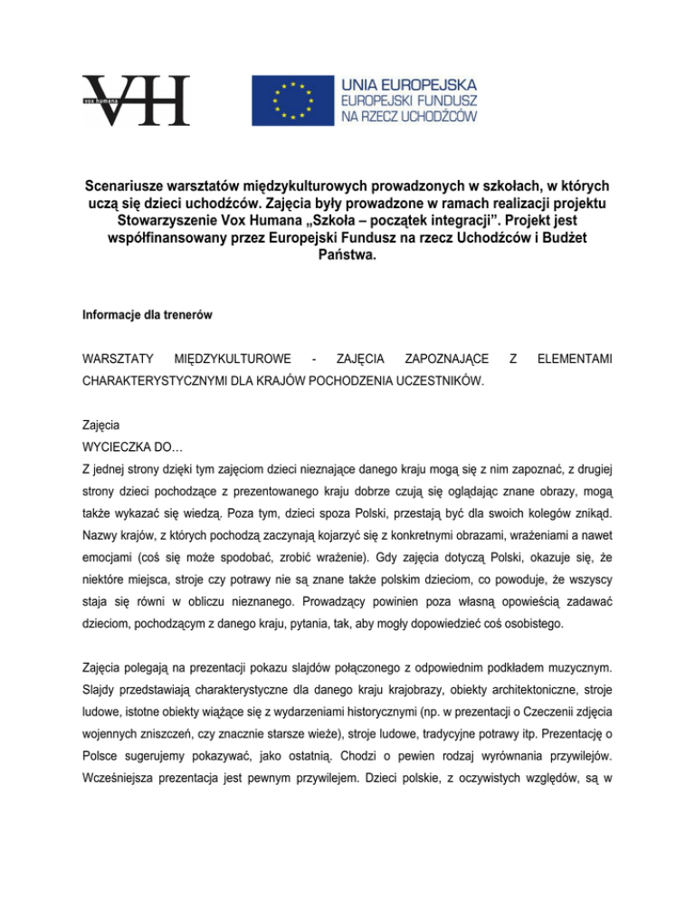 Scenariusze warsztatów międzykulturowych prowadzonych w szkołach, w których uczą się dzieci uchodźców. Zajęcia były prowadzone w ramach realizacji projektu Stowarzyszenie Vox Humana „Szkoła – początek integracji”. Projekt jest współfinansowany przez Europejski Fundusz na rzecz Uchodźców i Budżet Państwa. Informacje dla trenerów WARSZTATY MIĘDZYKULTUROWE - ZAJĘCIA ZAPOZNAJĄCE Z ELEMENTAMI CHARAKTERYSTYCZNYMI DLA KRAJÓW POCHODZENIA UCZESTNIKÓW. Zajęcia WYCIECZKA DO… Z jednej strony dzięki tym zajęciom dzieci nieznające danego kraju mogą się z nim zapoznać, z drugiej strony dzieci pochodzące z prezentowanego kraju dobrze czują się oglądając znane obrazy, mogą także wykazać się wiedzą. Poza tym, dzieci spoza Polski, przestają być dla swoich kolegów znikąd. Nazwy krajów, z których pochodzą zaczynają kojarzyć się z konkretnymi obrazami, wrażeniami a nawet emocjami (coś się może spodobać, zrobić wrażenie). Gdy zajęcia dotyczą Polski, okazuje się, że niektóre miejsca, stroje czy potrawy nie są znane także polskim dzieciom, co powoduje, że wszyscy staja się równi w obliczu nieznanego. Prowadzący powinien poza własną opowieścią zadawać dzieciom, pochodzącym z danego kraju, pytania, tak, aby mogły dopowiedzieć coś osobistego. Zajęcia polegają na prezentacji pokazu slajdów połączonego z odpowiednim podkładem muzycznym. Slajdy przedstawiają charakterystyczne dla danego kraju krajobrazy, obiekty architektoniczne, stroje ludowe, istotne obiekty wiążące się z wydarzeniami historycznymi (np. w prezentacji o Czeczenii zdjęcia wojennych zniszczeń, czy znacznie starsze wieże), stroje ludowe, tradycyjne potrawy itp. Prezentację o Polsce sugerujemy pokazywać, jako ostatnią. Chodzi o pewien rodzaj wyrównania przywilejów. Wcześniejsza prezentacja jest pewnym przywilejem. Dzieci polskie, z oczywistych względów, są w pozycji uprzywilejowanej, wobec kolegów z innych krajów. Tam gdzie można, dobrze jest dawać przywileje (dla wyrównania) obcokrajowcom. 1-sza część – pokaz slajdów Potrzebne – prezentacja, aparatura umożliwiająca jej odtworzenie, ewentualnie: globus, mapa obejmująca zarówno Polskę jak i kraje, z których pochodzą dzieci uchodźców. Przebieg – ustawiamy krzesła tak, aby dzieci dobrze widziały ekran, na którym będą pokazywane zdjęcia. Jeśli mamy globus i mapy to pokazujemy dzieciom gdzie jest kraj, o którym będzie opowieść, jak daleko jest z niego do Polski, można opowiedzieć gdzie są góry, gdzie główna rzeka, gdzie stolica – ta wiedza przyda się w kolejnej części zajęć. Warto zwrócić uwagę, że np. na oficjalnych mapach nie znajdziemy zaznaczonych granic Czeczenii. Należy wyjaśnić dzieciom, dlaczego. To również dobra okazja do wytłumaczenia, dlaczego uchodźcy uciekli ze swojego kraju i dlaczego Polska ich przyjmuje. Potem dzieci tworzą pociąg i „jadą” do kraju o, o którym opowiadamy. Po długiej podróży siadają na krzesełkach i oglądają pokaz. Prowadzący musi być przygotowany, aby opowiadać dzieciom, co widzą na slajdach np. charakterystyczne dla Kaukazu wieże kamienne, zniszczenia wojenne w Czeczenii, torne – gruziński piec do chleba lawasz itd. Bardzo wskazane jest również korzystanie z wiedzy dzieci pochodzących z danego kraju. Po pierwsze mogą opowiedzieć coś ciekawego np. o obyczajach, po drugie mogą się wykazać swoją kompetencją, co zawsze jest cenne, bo nie często mają po temu okazję, po trzecie w oczach kolegów zyskują kontekst kulturowy, nie są już „z nikąd” kojarzą się z czymś konkretnym – krajobrazem, obyczajem, strojem itp. 2-ga część – zabawy plastyczne Potrzebne – bardzo duży karton, kredki, flamastry, plastelina, farby, mogą być małe wydrukowane zdjęcia z prezentacji, w tym przypadku potrzebny będzie również klej. Przebieg – Na leżącym na podłodze, kartonie rysujemy jak największy kontur kraju, w którym byliśmy „na wycieczce”. Zadaniem dzieci jest narysowanie (namalowanie, wylepienie plasteliną) mapy kraju wraz z elementami zapamiętanymi z pokazu. Na mapie zaznaczamy największe rzeki, główne miasta, góry itd. Dzieci mogą przykleić we właściwych miejscach wcześniej przygotowane małe zdjęcia, ulepić z plasteliny wieże i umieścić je na mapie itd. Ważne jest, aby dzieci pracowały razem i wzajemnie szanowały swoją pracę. Wspomaga to integrację grupy. Aby uszanować pracę dzieci i ich miejsca pochodzenia warto mapę powiesić w klasie, czy na korytarzu. Zajęcia NASZ HERB Zajęcia związane z poznawaniem herbów państw pochodzenia dzieci z grupy z jednej strony służą poszerzeniu wiedzy dzieci, z drugiej są dobrym pretekstem do zadań integrujących. Wprowadzeniem do zajęć jest prezentacja herbów. Można to zrobić w ten sposób, że jedne zajęcia będą dotyczyły jednego herbu, albo na tych samych zajęciach zapoznać dzieci ze wszystkimi herbami krajów pochodzenia uczestników – oczywiście to, jakie herby prezentujemy zależy od składu etnicznego grupy. Elementem niezmiennym jest herb Polski, bo w tym kraju się znajdujemy. Poniżej opisujemy jedno kilka wariantów jednego ćwiczenia. Jednak zabawy związane z herbami i tworzenie herbu grupy można potraktować, jako dwa osobne ćwiczenia i poświęcić na nie dwa kolejne zajęcia. Wtedy za drugim razem pomijamy część dotyczącą prezentowania herbów. Możemy zabawić się przypomnienie, czy dzieci pamiętają jak poszczególne herby wyglądały. Przygotowując zajęcia trzeba zwrócić uwagę na zróżnicowanie herbów Czeczenii na oficjalny uznawany przez władze prorosyjskie i nieoficjalny herb Czeczeńskiej Republiki Iczkerii (wolnej Czeczenii) uznawany przez ogromną większość uchodźców. Na naszych zajęciach pracujemy z herbem Iczkerii, ponieważ to z nim utożsamiają się dzieci uchodźców. Ćwiczenie Poznajemy herb Czeczenii, herb Dagestanu i herb 