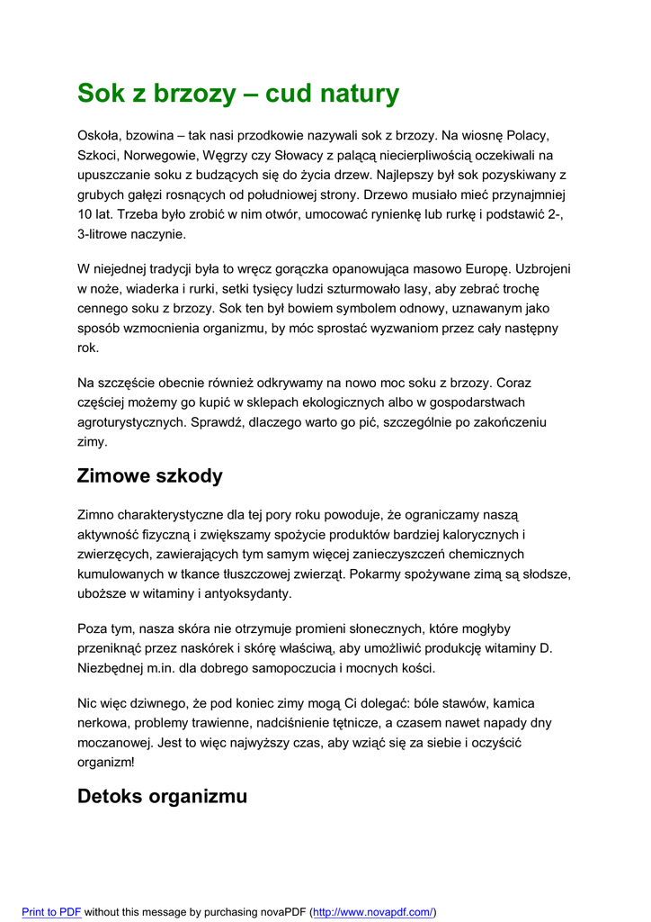 Sok z brzozy – cud natury Oskoła, bzowina – tak nasi przodkowie nazywali sok z brzozy. Na wiosnę Polacy, Szkoci, Norwegowie, Węgrzy czy Słowacy z palącą niecierpliwością oczekiwali na upuszczanie soku z budzących się do życia drzew. Najlepszy był sok pozyskiwany z grubych gałęzi rosnących od południowej strony. Drzewo musiało mieć przynajmniej 10 lat. Trzeba było zrobić w nim otwór, umocować rynienkę lub rurkę i podstawić 2-, 3-litrowe naczynie. W niejednej tradycji była to wręcz gorączka opanowująca masowo Europę. Uzbrojeni w noże, wiaderka i rurki, setki tysięcy ludzi szturmowało lasy, aby zebrać trochę cennego soku z brzozy. Sok ten był bowiem symbolem odnowy, uznawanym jako sposób wzmocnienia organizmu, by móc sprostać wyzwaniom przez cały następny rok. Na szczęście obecnie również odkrywamy na nowo moc soku z brzozy. Coraz częściej możemy go kupić w sklepach ekologicznych albo w gospodarstwach agroturystycznych. Sprawdź, dlaczego warto go pić, szczególnie po zakończeniu zimy. Zimowe szkody Zimno charakterystyczne dla tej pory roku powoduje, że ograniczamy naszą aktywność fizyczną i zwiększamy spożycie produktów bardziej kalorycznych i zwierzęcych, zawierających tym samym więcej zanieczyszczeń chemicznych kumulowanych w tkance tłuszczowej zwierząt. Pokarmy spożywane zimą są słodsze, uboższe w witaminy i antyoksydanty. Poza tym, nasza skóra nie otrzymuje promieni słonecznych, które mogłyby przeniknąć przez naskórek i skórę właściwą, aby umożliwić produkcję witaminy D. Niezbędnej m.in. dla dobrego samopoczucia i mocnych kości. Nic więc dziwnego, że pod koniec zimy mogą Ci dolegać: bóle stawów, kamica nerkowa, problemy trawienne, nadciśnienie tętnicze, a czasem nawet napady dny moczanowej. Jest to więc najwyższy czas, aby wziąć się za siebie i oczyścić organizm! Detoks organizmu Print to PDF without this message by purchasing novaPDF (http://www.novapdf.com/) Naturopaci zwracają uwagę na to, że ciało ludzkie wyposażone jest w narządy pełniące rolę filtrów oczyszczających: wątroba, jelita, nerki, płuca i skóra. Jednak zimą są one przeciążone z uwagi na spożywanie w nadmiarze przetworzonej żywności. Dodatkowo dochodzą: siedzący tryb życia, brak pocenia się, zanieczyszczenia środowiska i stres. Proces „sprzątania” jest wyczerpujący. Następuje obciążenie zanieczyszczeniami oraz spowolnienie metabolizmu. Pod koniec zimy jest to szczególnie zauważalne, a zmęczenie jest pierwszym objawem, często odczuwanym w tym okresie. Dlatego też naturopaci zalecają, aby na zakończenie zimy uwolnić organizm od wszystkiego, co go obciąża: zredukować tłuszcz, który skumulował pestycydy, produkty chemiczne i inne zanieczyszczenia, oczyścić wątrobę, jelita i nerki. Doradzają, aby nie czekać, bo nasze organy wraz z nadejściem pierwszych promyków słońca mogą się „zbuntować”. Egzema, łuszczyca i różnego rodzaju alergie przypisywane rzekomo działaniu słońca to właśnie oznaki wewnętrznego zanieczyszczenia. Sok z brzozy – cenny eliksir Natura obdarzyła nas wyjątkowym i cennym eliksirem do tego wielkiego „sprzątania”: sokiem brzozowym. W dzisiejszych czasach, niemal zupełnie zniknął zwyczaj picia tego soku wraz z nadejściem wiosny. Spośród soków z drzew, ludzie najbardziej znają kanadyjski syrop klonowy, bardzo słodki. Rosjanie rozwijali produkcję soku z brzozy aż do czasów upadku muru berlińskiego. W danym okresie ostatnia butelka zarezerwowana była dla prawosławnego księdza, wiejskiego. Dostępne są nawet zaskakujące zdjęcia zrobione w NRD w latach 80, na których można zobaczyć dziesiątki osób podczas takich leśnych zbiorów przy brzozach. Na Łotwie sok z brzozy do dziś uchodzi na prawdziwy skarb narodowy1. Obecnie w Polsce na nowo go odkrywamy. Dlaczego? Sok z brzozy zawiera naturalne składniki, których sposób działania nie jest jeszcze do końca znany: witaminę C, flawonoidy o właściwościach przeciwutleniających (jak kwercetyna), taniny, kwas chlorogenowy. Jest bogaty również w wapń, magnez, siarkę, sód i potas. Świeży sok zawiera dodatkowo oligoelementy natychmiastowo bioprzyswajalne – takie jak miedź, żelazo, mangan i cynk – tak rzadko występujące w naszym pożywieniu. Posiada także śluzy roślinne, 17 aminokwasów – w tym kwas Print to PDF without this message by purchasing novaPDF (http://www.novapdf.com/) glutaminowy, który działa ożywczo i pobudzająco oraz cukry w postaci fruktozy od 0,5 do 0,2%. Sok z brzozy ma również dwa glikozydy: betulozyd i monotropitozyd, które poprzez hydrolizę enzymatyczną uwalniają salicylan metylu, skutecznie uśmierzający ból, działający przeciwzapalnie i moczopędnie. Zaskakujące właściwości Aż do drugiej wojny światowej praktycznie w całej Europie centralnej i północnej, we wszystkich klasach społecznych, bzowinę podawano dzieciom jako pokarm uzupełniający mleko matki. Wykorzystywano go, aby pobudzać wzrost dzieci i nastolatków. Dorośli pili sok, aby dodać sobie energii uszczuplonej przez mroźne zimy, a ludzie starsi – dla witalności i uśmierzenia bólów reumatycznych. Odwieczna tradycja Brzozę nazywano kiedyś „drzewem mądrości”, a także „drzewem na schorzenia nerek”, z uwagi na jej właściwości lecznicze. Słynny arabski podróżnik Ahmad Ibn Fadlan już w roku 941 pisał, że ludność żyjąca na terenach wzdłuż rzeki Wołgi pijała sok z brzozy. Niemiecki uczony Conrad de Megenberg (XIV wiek) wspomina, że używano go jako napoju orzeźwiającego. Geograf perski Rashid-al-Din dowodzi, że ludność plemion Uriankhai z Syberii ścinała brzozy i zbierała sok, który spożywała zamiast wody. W 1565 roku Matthéole, medyk ze Sieny, pisał: Jeśli wwierci się w pień brzozy, wypływa stamtąd wielka ilość wody o dużych właściwościach rozbijania kamieni, zarówno tych w nerk