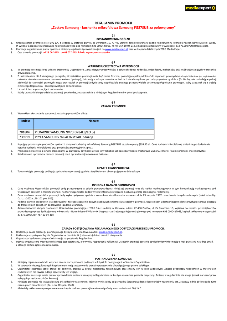 REGULAMIN PROMOCJI „Zestaw Samsung - kuchenka mikrofalowa Samsung FG87SUB za połowę ceny” §1 POSTANOWIENIA OGÓLNE 1. 2. 3. Organizatorem promocji jest TERG S.A. z siedzibą w Złotowie przy ul. Za Dworcem 1D, 77-400 Złotów, zarejestrowaną w Sądzie Rejonowym w Poznaniu Poznań Nowe Miasto i Wilda, IX Wydział Gospodarczy Krajowego Rejestru Sądowego pod numerem KRS 0000427063, nr NIP 767-10-04-218, o kapitale zakładowym w wysokości 37.875.000 PLN,(Organizator). Promocja organizowana jest w oparciu o niniejszy regulamin i prowadzona jest na www.mediaexpert.pl oraz w sklepach detalicznych TERG Media Expert. Czas trwania promocji: od 23.06.2015r. do 08.07.2015r lub do wyczerpania zapasów. §2 WARUNKI UCZESTNICTWA W PROMOCJI 1. 2. 3. 4. W promocji nie mogą brać udziału pracownicy Organizatora. Zakaz dotyczy pracowników a także ich dzieci, rodziców, rodzeństwa, małżonków oraz osób pozostających w stosunku przysposobienia. Z zastrzeżeniem pkt.1 niniejszego paragrafu, Uczestnikiem promocji może być osoba fizyczna, posiadająca pełną zdolność do czynności prawnych (ukończyła 18 lat i nie jest częściowo lub całkowicie ubezwłasnowolniona w rozumieniu Kodeksu Cywilnego), dokonująca zakupu towarów w ilościach detalicznych na potrzeby prywatne zgodnie z §3. Osoby, nie posiadające pełnej zdolności do czynności prawnych mogą brać udział w promocji jedynie przy współudziale swojego przedstawiciela ustawowego/opiekuna prawnego, który zapoznał się z treścią niniejszego Regulaminu i zaakceptował jego postanowienia. Uczestnictwo w promocji jest dobrowolne. Każdy Uczestnik biorący udział w promocji potwierdza, że zapoznał się z niniejszym Regulaminem i w pełni go akceptuje. §3 ZASADY PROMOCJI 1. Warunkiem skorzystania z promocji jest zakup produktów z listy: Index: 781804 736919 2. 3. 4. Nazwa: PIEKARNIK SAMSUNG NV70F3784EB/EO (-) PŁYTA SAMSUNG NZ64F3NM1AB indukcja Kupujący przy zakupie produktów z pkt nr 1. otrzyma kuchenkę mikrofalową Samsung FG87SUB za połowę ceny (399,50 zł). Cena kuchenki mikrofalowej zmieni się po dodaniu do koszyka kuchenki mikrofalowej oraz produktów promocyjnych z pkt 1. Promocja nie łączy się z innymi promocjami. W przypadku gdy Klient uzyska inny rabat na Sali sprzedaży będzie miał prawo wyboru, z której finalnie promocji chce skorzystać. Każdorazowo sprzedaż w ramach promocji musi być ewidencjonowana na fakturze. §4 OPŁATY TRANSPORTOWE 1. Towary objęte promocją podlegają opłacie transportowej zgodnie z taryfikatorem obowiązującym w dniu zakupu. §5 OCHRONA DANYCH OSOBOWYCH 1. 2. 3. 4. Dane osobowe Uczestników promocji będą przetwarzane w celach przeprowadzenia niniejszej promocji oraz dla celów marketingowych w tym komunikację marketingową pod wskazanym adresem e-mail i telefonem, na który Organizator będzie wysyłał informacje związane z aktualną ofertą promocyjno-reklamową. Dane osobowe uczestników promocji będą wykorzystywane zgodnie z warunkami określonymi w ustawie z dnia 29 sierpnia 1997r. o ochronie danych osobowych (tekst jednolity: Dz. U. z 2002 r., Nr 101 poz. 926). Podanie danych osobowych jest dobrowolne. Nie udostępnienie danych osobowych uniemożliwia udział w promocji. Uczestnikom udostępniającym dane przysługuje prawo dostępu do treści swoich danych ich poprawiania i żądania usunięcia. Administratorem danych osobowych Uczestników promocji jest TERG S.A z siedzibą w Złotowie, adres: 77-400 Złotów, ul. Za Dworcem 1D, wpisana do rejestru przedsiębiorców prowadzonego przez Sąd Rejonowy w Poznaniu - Nowe Miasto i Wilda – IX Gospodarczy Krajowego Rejestru Sądowego pod numerem KRS 0000427063, kapitał zakładowy w wysokości 37 875.000 zł, NIP 767-10-04-218. §6 ZASADY POSTĘPOWANIA REKLAMACYJNEGO DOTYCZĄCE PRZEBIEGU PROMOCJI. 1. 2. 3. 4. Reklamacje co do przebiegu promocji mogą być zgłaszane mailowo na adres [email protected]. Reklamacje rozpatrywać będzie Organizator w terminie 14 (czternastu) dni od dnia ich otrzymania. Organizator będzie rozpatrywać reklamacje na podstawie Regulaminu. Decyzja Organizatora w sprawie reklamacji jest ostateczna, a o wyniku rozpatrzenia reklamacji Uczestnik promocji zostanie powiadomiony informacją e-mail przesłaną na adres email, z którego została zgłoszona reklamacja. §7 POSTANOWIENIA KOŃCOWE 1. 2. 3. 4. 5. 6. Niniejszy regulamin wchodzi w życie z dniem startu promocji podanym w §1 pkt.3 i dostępny jest w Sklepach Organizatora. W sprawach nieuregulowanych Regulaminem mają zastosowanie przepisy powszechnie obowiązującego prawa polskiego. Organizator zastrzega sobie prawo do pomyłek, błędów w druku materiałów reklamowych oraz zmiany cen w nich widocznych. Zdjęcia produktów widocznych w materiałach reklamowych nie zawsze oddają rzeczywisty ich wygląd. Organizator zastrzega sobie prawo wprowadzenia zmian w niniejszym Regulaminie, w każdym czasie bez podania przyczyny. Zmiany w regulaminie nie mogą jednak naruszać praw nabytych przez Uczestników Promocji. Niniejsza promocja nie jest grą losową ani zakładem wzajemnym, których wynik zależy od przypadku (przeprowadzenie losowania) w rozumieniu art. 2 ustawy z dnia 19 listopada 2009 roku o grach hazardowych (Dz. U. Nr 201 poz. 1540). Materiały reklamowe wyeksponowane na sklepie podczas promocji nie stanowią oferty w rozumieniu art.66§ 1K.C.