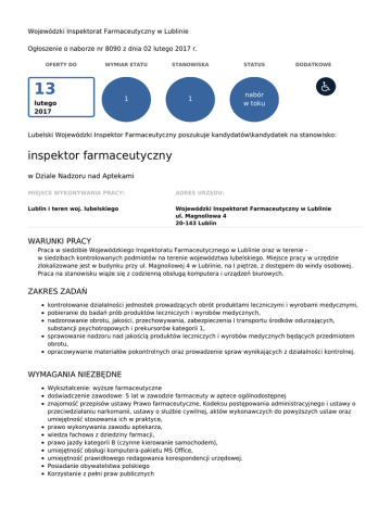 Wojewódzki Inspektorat Farmaceutyczny w Lublinie Ogłoszenie o naborze nr 8090 z dnia 02 lutego 2017 r. OFERTY DO WYMIAR ETATU STANOWISKA STATUS 1 1 nabór w toku 13 lutego 2017 DODATKOWE Lubelski Wojewódzki Inspektor Farmaceutyczny poszukuje kandydatów\kandydatek na stanowisko: inspektor farmaceutyczny w Dziale Nadzoru nad Aptekami MIEJSCE WYKONYWANIA PRACY: ADRES URZĘDU: Lublin i teren woj. lubelskiego Wojewódzki Inspektorat Farmaceutyczny w Lublinie ul. Magnoliowa 4 20-143 Lublin WARUNKI PRACY Praca w siedzibie Wojewódzkiego Inspektoratu Farmaceutycznego w Lublinie oraz w terenie – w siedzibach kontrolowanych podmiotów na terenie województwa lubelskiego. Miejsce pracy w urzędzie zlokalizowane jest w budynku przy ul. Magnoliowej 4 w Lublinie, na I piętrze, z dostępem do windy osobowej. Praca na stanowisku wiąże się z codzienną obsługą komputera i urządzeń biurowych. ZAKRES ZADAŃ kontrolowanie działalności jednostek prowadzących obrót produktami leczniczymi i wyrobami medycznymi, pobieranie do badań prób produktów leczniczych i wyrobów medycznych, nadzorowanie obrotu, jakości, przechowywania, zabezpieczenia i transportu środków odurzających, substancji psychotropowych i prekursorów kategorii 1, sprawowanie nadzoru nad jakością produktów leczniczych i wyrobów medycznych będących przedmiotem obrotu, opracowywanie materiałów pokontrolnych oraz prowadzenie spraw wynikających z działalności kontrolnej. WYMAGANIA NIEZBĘDNE Wykształcenie: wyższe farmaceutyczne doświadczenie zawodowe: 5 lat w zawodzie farmaceuty w aptece ogólnodostępnej znajomość przepisów ustawy Prawo farmaceutyczne, Kodeksu postępowania administracyjnego i ustawy o przeciwdziałaniu narkomanii, ustawy o służbie cywilnej, aktów wykonawczych do powyższych ustaw oraz umiejętność stosowania ich w praktyce, prawo wykonywania zawodu aptekarza, wiedza fachowa z dziedziny farmacji, prawo jazdy kategorii B (czynne kierowanie samochodem), umiejętność obsługi komputera-pakietu MS Office, umiejętność prawidłowego redagowania korespondencji urzędowej. Posiadanie obywatelstwa polskiego Korzystanie z pełni praw publicznych Nieskazanie prawomocnym wyrokiem za umyślne przestępstwo lub umyślne przestępstwo skarbowe WYMAGANIA DODATKOWE posiadanie specjalizacji aptecznej, znajomość języka angielskiego w stopniu umożliwiającym konwersację, komunikatywność, umiejętności analityczne, umiejętność pracy w zespole, samodzielność w wykonywaniu powierzonych obowiązków. DOKUMENTY I OŚWIADCZENIA NIEZBĘDNE Życiorys/CV i list motywacyjny Kopie dokumentów potwierdzających spełnienie wymagania niezbędnego w zakresie wykształcenia Kopie dokumentów potwierdzających spełnienie wymagania niezbędnego w zakresie doświadczenia zawodowego / stażu pracy kopia dokumentu potwierdzającego posiadanie prawa wykonywania zawodu aptekarza, kopia dokumentu potwierdzającego posiadanie prawa jazdy kategorii B, Oświadczenie o posiadaniu obywatelstwa polskiego albo kopia dokumentu potwierdzającego posiadanie polskiego obywatelstwa Oświadczenie o wyrażeniu zgody na przetwarzanie danych osobowych do celów naboru Oświadczenie o korzystaniu z pełni praw publicznych Oświadczenie o nieskazaniu prawomocnym wyrokiem za umyślne przestępstwo lub umyślne przestępstwo skarbowe DOKUMENTY I OŚWIADCZENIA DODATKOWE kopia dokumentu potwierdzającego niepełnosprawność - w przypadku kandydatek/kandydatów, zamierzających skorzystać z pierwszeństwa w zatrudnieniu w przypadku, gdy znajdą się w gronie najlepszych kandydatek/kandydatów kopia dokumentu potwierdzającego posiadanie specjalizacji aptecznej TERMINY I MIEJSCE SKŁADANIA DOKUMENTÓW Dokumenty należy złożyć do: 13 lutego 2017 r. Decyduje data: stempla pocztowego / osobistego dostarczenia oferty do urzędu Miejsce składania dokumentów: Wojewódzki Inspektorat Farmaceutyczny w Lublinie ul. Magnoliowa 4 20-143 Lublin INNE INFORMACJE: W miesiącu poprzedzającym datę upublicznienia ogłoszenia wskaźnik zatrudnienia osób niepełnosprawnych w urzędzie, w rozumieniu przepisów o rehabilitacji zawodowej i społecznej oraz zatrudnianiu osób niepełnosprawnych, nie wynosi co najmniej 6%. Dokumenty należy składać w zamkniętych kopertach z napisem „OFERTA PRACY – LUBLIN – INSPEKTOR FARMACEUTYCZNY” do dnia 13.02.2017 r. Oferty otrzymane po terminie nie będą rozpatrywane (decyduje data stempla pocztowego). Kandydaci zakwalifikowani do kolejnego etapu naboru zostaną powiadomieni o jego terminie. Oferty niewykorzystane zostaną zniszczone po upływie 3 miesięcy od zakończenia naboru. Dodatkowe informacje można uzyskać pod numerem telefonu 81/53-222-18. Informacja o wynikach naboru zostanie opublikowana na stronach internetowych: http://bip.kprm.gov.pl, http://bip.wif.lublin.pl oraz udostępniona na tablicy ogłoszeń w Wojewódzkim Inspektoracie Farmaceutycznym w Lublinie. Legenda Pierwszeństwo dla osób z niepełnosprawnościami Ogłoszenie z tym symbolem oznacza, że pierwszeństwo w zatrudnieniu mają osoby z niepełnosprawnościami, które spełniają wszystkie następujące warunki: • złożyły w terminie ofertę wraz z dokumentem potwierdzającym niepełnosprawność, • spełniają warunki wymienione w ogłoszeniu, • po rekrutacji znalazły się w gronie najlepszych kandydatów. Zastępstwo Ogłoszenie z tym symbolem oznacza, że urząd poszukuje kandydatów do pracy na czas przewidywanej nieobecności swojego pracownika. Jeśli w ogłoszeniu nie wskazano okresu zastępstwa, możesz o to spytać w urzędzie. Osoba zatrudniona na zastępstwo jest członkiem korpusu służby cywilnej. Nabór otwarty dla cudzoziemców Ogłoszenie z tym symbolem oznacza, że o stanowisko mogą starać się, poza polskimi obywatelami, również cudzoziemcy. Kandydaci muszą spełniać następujące warunki: • są obywatelami państwa Unii Europejskiej lub innego państwa, którego obywatelom na podstawie u