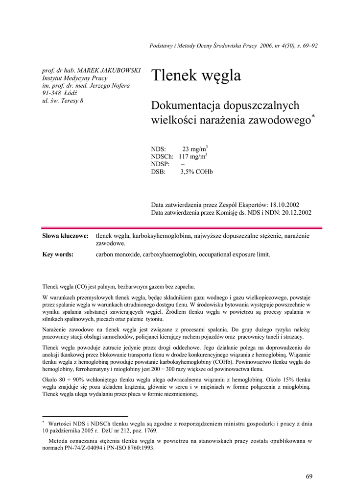 Podstawy i Metody Oceny Środowiska Pracy 2006, nr 4(50), s. 69–92 prof. dr hab. MAREK JAKUBOWSKI Instytut Medycyny Pracy im. prof. dr. med. Jerzego Nofera 91-348 Łódź ul. św. Teresy 8 Tlenek węgla Dokumentacja dopuszczalnych wielkości narażenia zawodowego NDS: 23 mg/m3 NDSCh: 117 mg/m3 NDSP: – DSB: 3,5% COHb Data zatwierdzenia przez Zespół Ekspertów: 18.10.2002 Data zatwierdzenia przez Komisję ds. NDS i NDN: 20.12.2002 Słowa kluczowe: tlenek węgla, karboksyhemoglobina, najwyższe dopuszczalne stężenie, narażenie zawodowe. Key words: carbon monoxide, carboxyhaemoglobin, occupational exposure limit. Tlenek węgla (CO) jest palnym, bezbarwnym gazem bez zapachu. W warunkach przemysłowych tlenek węgla, będąc składnikiem gazu wodnego i gazu wielkopiecowego, powstaje przez spalanie węgla w warunkach utrudnionego dostępu tlenu. W środowisku bytowania występuje powszechnie w wyniku spalania substancji zawierających węgiel. Źródłem tlenku węgla w powietrzu są procesy spalania w silnikach spalinowych, piecach oraz palenie tytoniu. Narażenie zawodowe na tlenek węgla jest związane z procesami spalania. Do grup dużego ryzyka należą: pracownicy stacji obsługi samochodów, policjanci kierujący ruchem pojazdów oraz pracownicy tuneli i strażacy. Tlenek węgla powoduje zatrucie jedynie przez drogi oddechowe. Jego działanie polega na doprowadzeniu do anoksji tkankowej przez blokowanie transportu tlenu w drodze konkurencyjnego wiązania z hemoglobiną. Wiązanie tlenku węgla z hemoglobiną powoduje powstanie karboksyhemoglobiny (COHb). Powinowactwo tlenku węgla do hemoglobiny, ferrohematyny i mioglobiny jest 200 ÷ 300 razy większe od powinowactwa tlenu. Około 80 ÷ 90% wchłoniętego tlenku węgla ulega odwracalnemu wiązaniu z hemoglobiną. Około 15% tlenku węgla znajduje się poza układem krążenia, głównie w sercu i w mięśniach w formie połączenia z mioglobiną. Tlenek węgla ulega wydalaniu przez płuca w formie niezmienionej. Wartości NDS i NDSCh tlenku węgla są zgodne z rozporządzeniem ministra gospodarki i p racy z dnia 10 października 2005 r. DzU nr 212, poz. 1769. Metoda oznaczania stężenia tlenku węgla w powietrzu na stanowiskach pracy została opublikowana w normach PN-74/Z-04094 i PN-ISO 8760:1993. 69 W trakcie narażenia na tlenek węgla o stałym stężeniu szybko wzrasta stężenie karboksyhemoglobiny na początku narażenia, osiągając stan równowagi po około 5 h. Wzrost stężenia karboksyhemoglobiny podczas narażenia na tlenek węgla opisuje równanie Coburna-Fostera-Kane (równanie CFK) opracowane przy uwzględnieniu takich znanych zmiennych fizjologicznych, jak: wytwarzanie endogennego tlenku węgla, dyfuzja w płucach, wentylacja pęcherzykowa, objętość krwi, ciśnienie atmosferyczne, ciśnienie parcjalne tlenku węgla i tlenu w płucach. Biologiczny okres półtrwania karboksyhemoglobiny wynosi średnio 320 min (128 ÷ 409 min) i nie jest zależny od czasu trwania narażenia, liczby narażeń i stężenia tlenku węgla we wdychanym powietrzu. Wiązanie tlenku węgla z hemoglobiną zmniejsza możliwość transportu tlenu do narządów i tkanek oraz wywołuje zaburzenia procesów oksydacyjnych wewnątrz komórki, co powoduje niedotlenienie tkanek w stopniu proporcjonalnym do stopnia wysycenia krwi karboksyhemoglobiny oraz zapotrzebowania danej tkanki na tlen. Skutki działania tlenku węgla są najbardziej nasilone w takich silnie ukrwionych tkankach i narządach, jak: mózg, układ sercowo-naczyniowy, mięśnie oraz płód. Istnieje zależność między wielkością stężenia karboksyhemoglobiny we krwi i występowaniem skutków działania tlenku węgla. Dane dotyczące występowania wczesnych skutków działania tlenku węgla na układ sercowo-naczyniowy i ośrodkowy układ nerwowy u ludzi wskazują, że mogą się one pojawiać, gdy stężenia karboksyhemoglobiny są większe niż 5%. Wydaje się, że utrzymywanie na poziomie poniżej 3,5% stężeń karboksyhemoglobiny u niepalących ludzi narażonych w ciągu 8 h może zapobiegać wystąpieniu szkodliwych skutków działania tlenku węgla. Dotyczy to szczególnie osób z chorobami układu sercowo-naczyniowego oraz narażenia w niekorzystnych warunkach (wysoka temperatura, hałas czy duże obciążenie wysiłkiem). Stężeniu 3,5% karboksyhemoglobiny odpowiada, zgodnie z równaniem Coburna-Fostera-Cane, narażenie na tlenek węgla o stężeniu około 30 mg/m3 w ciągu 8 h. Przyjęto więc wartość najwyższego dopuszczalnego stężenia (NDS) tlenku węgla równą 23 mg/m3 (20 ppm), co odpowiada wartości NDS zaproponowanej przez Komitet Naukowy (SCOEL) w Unii Europejskiej. Wartość najwyższego dopuszczalnego stężenia chwilowego (NDSCh) tlenku węgla powinna zapobiegać nadmiernemu przekraczaniu stężenia karboksyhemoglobiny 3,5% w okresach 15-minutowego narażenia. Według SCOEL wartość ta wynosi 117 mg/m3 (100 ppm). Zgodnie z danymi ACGIH, osiągnięcie stężenia karboksyhemoglobiny równego 3,5 mg/m3 przy tym stężeniu tlenku węgla w powietrzu wymaga 39 min podczas umiarkowanego obciążenia pracą. Można oczekiwać, że w ciągu 15 min stężenie karboksyhemoglobiny może wzrosnąć w tych warunkach o około 1,5% do łącznej wartości około 5%. Nie powinno to stanowić zagrożenia dla osób zdrowych. Prawidłowy poziom karboksyhemoglobiny związany z procesami fizjologicznymi wynosi u osób zdrowych 0,4 ÷ 0,7%. U osób palących papierosy stężenia karboksyhemoglobiny mogą dochodzić do 10%. Biorąc po uwagę możliwe skutki działania tlenku węgla, szczególnie u osób z chorobą niedokrwienną serca i u osób wykonujących prace wymagające szczególnej koncentracji, wartość dopuszczalnego stężenia w materiale biologicznym (DSB) powinna wynosić 3,5% karboksyhemoglobiny. Wartość ta dotyczy wyłącznie osób niepalących. CHARAKTERYSTYKA SUBSTANCJI, ZASTOSOWANIE, NARAŻENIE ZAWODOWE Ogólna charakterystyka substancji Ogólne infor