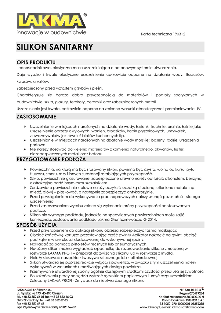 Karta techniczna 190312 SILIKON SANITARNY OPIS PRODUKTU Jednoskładnikowa, elastyczna masa uszczelniająca o octanowym systemie utwardzania. Daje wysoko i trwale elastyczne uszczelnienie całkowicie odporne na działanie wody, tłuszczów, kwasów, alkaliów. Zabezpieczony przed wzrostem grzybów i pleśni. Charakteryzuje się bardzo dobra przyczepnością do materiałów i podłoży spotykanych w budownictwie: szkła, glazury, terakoty, ceramiki oraz zabezpieczonych metali. Uszczelnienie jest trwałe, całkowicie odporne na zmienne warunki atmosferyczne i promieniowanie UV. ZASTOSOWANIE Uszczelnianie w miejscach narażonych na działanie wody: łazienki, kuchnie, pralnie, łaźnie jako uszczelnienie obrzeży akrylowych: wanien, brodzików, kabin prysznicowych, umywalek, zlewozmywaków jak również blatów kuchennych itp. Uszczelnianie w miejscach narażonych na działanie wody morskiej: baseny, łodzie, urządzenia portowe. Nie należy stosować do klejenia materiałów z kamienia naturalnego, akwariów, luster, niezabezpieczonych metali oraz betonu PRZYGOTOWANIE PODŁOŻA Powierzchnia, na którą ma być stosowany silikon, powinna być czysta, wolna od kurzu, pyłu, tłuszczu, smaru, rdzy i innych substancji osłabiających przyczepność. Szkło, powierzchnie glazurowane, zabezpieczone drewno należy odtłuścić alkoholem, benzyną ekstrakcyjną bądź innym rozpuszczalnikiem. Zardzewiałe powierzchnie stalowe należy oczyścić szczotką drucianą, utlenione metale (np. miedź, ołów) – piaskować, a następnie zabezpieczyć antykorozyjnie. Przed przystąpieniem do wykonywania prac naprawczych należy usunąć pozostałości starego uszczelnienia. Przed zastosowaniem wyrobu zaleca się wykonanie próby przyczepności na stosowanym podłożu. Silikon nie wymaga podkładu, jednakże na specyficznych powierzchniach może zajść konieczność zastosowania podkładu Lakma Gruntozmywacza G 2014. SPOSÓB UŻYCIA Przed przystąpieniem do aplikacji silikonu obrzeża zabezpieczyć taśmą maskującą. Obciąć końcówkę kartusza pozostawiając część gwintu Aplikator nakręcić na gwint, obciąć pod kątem w szerokości dostosowanej do wykonywanej spoiny. Nakładać za pomocą pistoletów ręcznych lub pneumatycznych. Nałożony silikon można wygładzać szpachelką do rozprowadzania silikonu zmoczoną w roztworze LAKMA PROFI – preparat do zwilżania silikonu lub w roztworze z mydła. Należy stosować narzędzia z tworzywa sztucznego lub stali nierdzewnej. Silikon utwardza się poprzez reakcję wilgoci z powietrza, w związku z tym uszczelnienia należy wykonywać w warunkach umożliwiających dostęp powietrza. Przemywanie utwardzonej spoiny ogólnie dostępnymi środkami czystości przedłuża jej żywotność Po zakończeniu pracy narzędzia wytrzeć ręcznikiem papierowym i umyć rozpuszczalnikiem. Zalecany LAKMA PROFI - Zmywacz do nieutwardzonego silikonu 1 Karta techniczna 190312 DANE TECHNICZNE Typ utwardzania System utwardzania Czas obróbki Czas pełnego utwardzenia Temperatura aplikacji (stosowania) Odporność termiczna (utwardzonego produktu) Poprzeczny moduł rozciągający w temp. 23°C [N/mm²]wg ISO 8339 Twardość Shore A Gęstość Wydłużenie przy zerwaniu wg ISO 8339 Wydajność Kolorystyka Przechowywanie i transport jednokomponentowy – sieciuje wilgocią z powietrza Octan ok 25min 2mm/24h przy zachowaniu wilgotności względnej 55% +5° do +40°C -40° do +180°C 0,36 ok. 18 0,98 – 1,05g/cm3 150% Z kartusza 300ml uzyskuje się ok. 18mb spoiny o wymiarach 4x4mm Biały, bezbarwny, brązowy, beżowy, szary (paleta kolorów RAL na zamówienie specjalne) W oryginalnie zamkniętych opakowaniach w suchych i chłodnych pomieszczeniach przez okres 18 miesięcy od dnia produkcji w temperaturach od +5° do +35°C INFORMACJE LOGISTYCZNE Pojemność opakowania jednostkowego Ilość sztuk w opakowaniu zbiorczym Ilość opakowań na palecie 300ml 15 1260 600ml 20 960 BHP I OSTRZEŻENIA S2 Chronić przed dziećmi. DOPUSZCZENIA, ATESTY, NORMY Karta Charakterystyki Aktualizacja 19.03.2012 Powyższe dane, zalecenia i wskazówki opierają się na naszej najlepszej wiedzy, badaniach oraz doświadczeniach i zostały udzielone w dobrej wierze zgodnie z zasadami obowiązującymi w naszej firmie i u naszych dostawców. W razie nie zastosowania się do zaleceń dotyczących sposobu stosowania masy, firma LAKMA SAT nie ponosi odpowiedzialności, za jakość uszczelnienia. 2