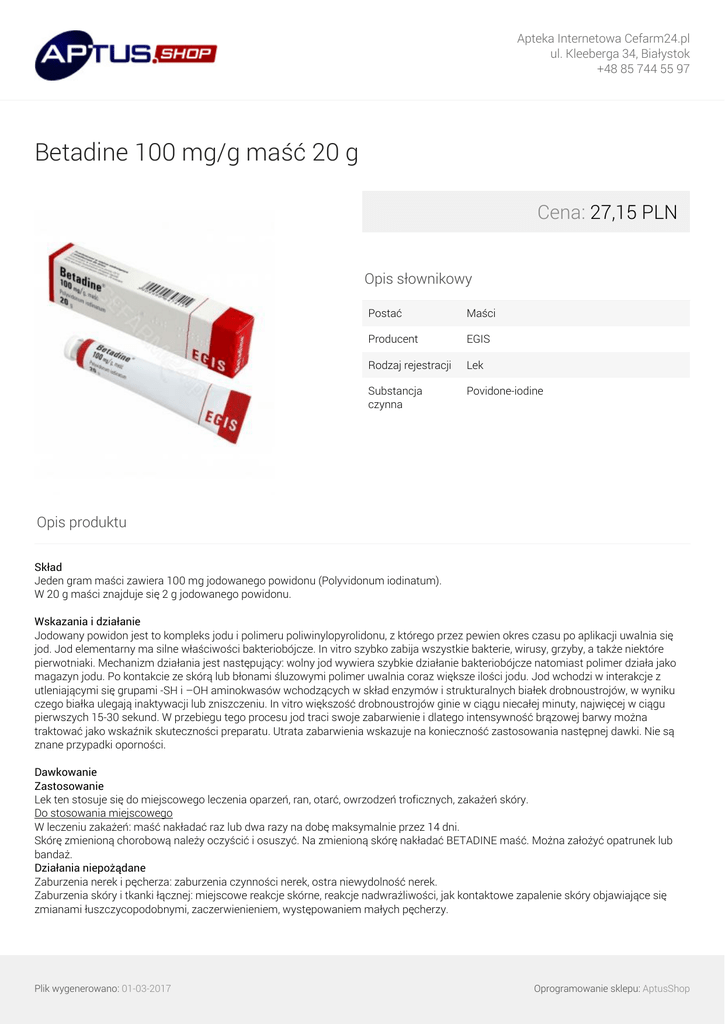 Apteka Internetowa Cefarm24.pl ul. Kleeberga 34, Białystok +48 85 744 55 97 Betadine 100 mg/g maść 20 g Cena: 27,15 PLN Opis słownikowy Postać Maści Producent EGIS Rodzaj rejestracji Lek Substancja czynna Povidone-iodine Opis produktu Skład Jeden gram maści zawiera 100 mg jodowanego powidonu (Polyvidonum iodinatum). W 20 g maści znajduje się 2 g jodowanego powidonu. Wskazania i działanie Jodowany powidon jest to kompleks jodu i polimeru poliwinylopyrolidonu, z którego przez pewien okres czasu po aplikacji uwalnia się jod. Jod elementarny ma silne właściwości bakteriobójcze. In vitro szybko zabija wszystkie bakterie, wirusy, grzyby, a także niektóre pierwotniaki. Mechanizm działania jest następujący: wolny jod wywiera szybkie działanie bakteriobójcze natomiast polimer działa jako magazyn jodu. Po kontakcie ze skórą lub błonami śluzowymi polimer uwalnia coraz większe ilości jodu. Jod wchodzi w interakcje z utleniającymi się grupami -SH i –OH aminokwasów wchodzących w skład enzymów i strukturalnych białek drobnoustrojów, w wyniku czego białka ulegają inaktywacji lub zniszczeniu. In vitro większość drobnoustrojów ginie w ciągu niecałej minuty, najwięcej w ciągu pierwszych 15-30 sekund. W przebiegu tego procesu jod traci swoje zabarwienie i dlatego intensywność brązowej barwy można traktować jako wskaźnik skuteczności preparatu. Utrata zabarwienia wskazuje na konieczność zastosowania następnej dawki. Nie są znane przypadki oporności. Dawkowanie Zastosowanie Lek ten stosuje się do miejscowego leczenia oparzeń, ran, otarć, owrzodzeń troficznych, zakażeń skóry. Do stosowania miejscowego W leczeniu zakażeń: maść nakładać raz lub dwa razy na dobę maksymalnie przez 14 dni. Skórę zmienioną chorobową należy oczyścić i osuszyć. Na zmienioną skórę nakładać BETADINE maść. Można założyć opatrunek lub bandaż. Działania niepożądane Zaburzenia nerek i pęcherza: zaburzenia czynności nerek, ostra niewydolność nerek. Zaburzenia skóry i tkanki łącznej: miejscowe reakcje skórne, reakcje nadwrażliwości, jak kontaktowe zapalenie skóry objawiające się zmianami łuszczycopodobnymi, zaczerwienieniem, występowaniem małych pęcherzy. Plik wygenerowano: 01-03-2017 Oprogramowanie sklepu: AptusShop Apteka Internetowa Cefarm24.pl ul. Kleeberga 34, Białystok +48 85 744 55 97 Zaburzenia endokrynologiczne: długotrwałe stosowanie jodowanego powidonu może zwiększoną absorpcje jodu. Może wystąpić nadczynność tarczycy, szczególnie u pacjentów z chorobami tarczycy w wywiadzie Interakcje Jodowany powidon działa przeciwbakteryjne przy pH w zakresie 2-7. Reakcje z białkami i nienasyconymi związkami organicznymi mogą osłabić skuteczność preparatu. Jednoczesne stosowanie BETADINE maść z enzymatycznymi maściami do leczenia ran może zmniejszyć skuteczność obu preparatów. Środki zawierające rtęć, srebro, nadtlenek wodoru, kwas benzoesowy lub taurolidyna mogą wchodzić w interakcje z kompleksem powidon-jod w związku z czym należy unikać ich jednoczesnego stosowania. Uwaga! Ze względu na utleniające właściwości preparatu, w przypadku niektórych testów na wykrywanie krwi utajonej w kale lub wykrywanie krwi lub glukozy w moczu, zanieczyszczenie jodowanym powidononem może dać wyniki fałszywie dodatnie. Podczas stosowania jodowanego powidonu może zmniejszyć się wychwyt jodu przez tarczycę, co z kolei może utrudniać przeprowadzenie niektórych badań diagnostycznych (np. scyntygrafia tarczycy, oznaczanie jodu związanego z białkiem, badania z zastosowaniem jodu radioaktywnego) lub uniemożliwiać leczenie chorób tarczycy jodem. Aby uzyskać niezafałszowane wyniki zaleca się zachowanie 1-2 tygodniowego odstępu czasu między zakończeniem terapii jodowanym powidonem a scyntygrafią tarczycy. Środki ostrożności Preparat jest przeznaczony wyłącznie do stosowania miejscowego. Długotrwałe stosowanie może spowodować podrażnienie skóry, a w rzadkich przypadkach, ciężkie odczyny skórne. Jeśli wystąpi podrażnienie lub nadwrażliwość należy zaprzestać stosowania preparatu. U pacjentów z chorobami tarczycy przyjęcie dużej ilości jodu może wywołać nadczynność tarczycy (np. wole guzkowe koloidowe, wole endemiczne). U tych osób stosowanie BETADINE maść powinno być ograniczone, gdy chodzi o w czas, jak również wielkość obszaru skóry, na który stosowana jest maść. W czasie długotrwałego stosowania na duże powierzchnie skóry może wystąpić wychwyt jodu przez tarczycę co może spowodować nadczynność tarczycy u pacjentów z chorobami tarczycy w wywiadzie. U tych pacjentów maść może być stosowana średnio na nie więcej niż 10% powierzchni ciała lub nie dłużej niż 14 dni. Ze względu na osobnicze różnice w stopniu wychwytu jodu, należy monitorować czynność tarczycy i leczenie dobierać indywidualnie dla każdego pacjenta. Jeśli po leczeniu wystąpią objawy wskazujące na nadczynność tarczycy należy przeprowadzić badania czynności tarczycy Należy unikać stosowania dużych ilości jodu u noworodków i małych dzieci ze względu na większą przepuszczalność skóry i większą wrażliwość na jod u tych pacjentów, w związku z czym ryzyko wystąpienia nadczynności tarczycy w tych przypadkach jest zwiększone. U noworodków i małych dzieci jodowany powidon należy stosować w jak najmniejszej dawce. W razie konieczności należy przeprowadzić badania czynności tarczycy. Szczególną ostrożność należy zachować w razie regularnego stosowania preparatu u pacjentów ze współistniejącą niewydolnością nerek. Należy unikać regularnego stosowania BETADINE maść u pacjentów aktualnie leczonych litem. Prowadzenie pojazdów Stosowanie maści BETADINE nie wpływa na zdolność prowadzenia pojazdów i obsługiwania urządzeń mechanicznych w ruchu. Przedawkowanie Objawy ostrego zatrucia jodem są następujące: Met