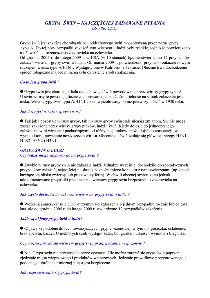 GRYPA ŚWIŃ – NAJCZĘŚCIEJ ZADAWANE PYTANIA (Źródło: CDC) Grypa świń jest zakaźną chorobą układu oddechowego świń, wywoływaną przez wirus grypy typu A. Do tej pory przypadki zakażeń tym wirusem u ludzi były rzadkie, jednakże potwierdzono możliwość ich przenoszenia z człowieka na człowieka. Od grudnia 2005 r. do lutego 2009 r. w USA (w 10 stanach) łącznie stwierdzono 12 przypadków zakażeń wirusem grypy świń u ludzi.. Od marca 2009 r. potwierdzono przypadki zakażeń nowym szczepem wirusa typu A/H1N1. Wystąpiły one w Kalifornii i Teksasie. Obecnie trwa dochodzenie epidemiologiczne mające m.in. na celu określenie źródła zakażenia. Co to jest grypa świń ? Grypa świń jest chorobą układu oddechowego świń powodowaną przez wirusy grypy typu A. U świń wirusy te powodują liczne zachorowania,jednakże śmiertelność na skutek zakażenia jest niska. Wirus grypy świń typu A/H1N1 został wyizolowany po raz pierwszy u świń w 1930 roku. Jak dużo jest wirusów grypy świń ? Tak jak i pozostałe wirusy grypy, tak i wirusy grypy świń stale ulegają zmianom. Świnie mogą zostać zakażone przez wirusy grypy ptaków, ludzi i świń. Kiedy dojdzie do jednoczesnego zakażenia świni wirusami pochodzącymi od różnych gatunków, może dojść do reasortacji, w wyniku której powstanie nowy szczep wirusa. Obecnie od świń izoluje się głównie szczepy H1N1, H1N2, H3N2 i H3N1 . GRYPA ŚWIŃ U LUDZI Czy ludzie mogą zachorować na grypę świń ? Zwykle wirusy grypy świń nie zakażają ludzi. Jednakże wcześniej dochodziło do sporadycznych przypadków zakażeń, najczęściej na skutek bezpośredniego kontaktu z tymi zwierzętami (np. dzieci bawiące się blisko zwierząt lub pracownicy ferm). W chwili obecnej stwierdzono jednak udokumentowane przypadki przeniesienia wirusów grypy świń bezpośrednio z człowieka na człowieka. Jak często dochodzi do zakażenia wirusem grypy świń u ludzi ? Wcześniej amerykańskie CDC otrzymywało zgłoszenia o jednym przypadku rocznie lub co dwa lata, ale od grudnia 2005 r. do lutego 2009 r. stwierdzono 12 przypadków zakażenia. Jakie są objawy grypy świń u ludzi? Objawy są podobne do tych towarzyszących grypie sezonowej, w tym np. gorączka, osłabienie, brak apetytu, kaszel. U niektórych osób wystąpił katar, ból gardła, nudności, wymioty i biegunka. Czy można zarazić się wirusem grypy świń przez zjedzenie wieprzowiny? Nie. Grypa świń nie przenosi się przez żywność. Nie można zarazić się grypą świń poprzez zjedzenie mięsa wieprzowego i produktów wieprzowych. Jedzenie prawidłowo przygotowanego i poddanego obróbce termicznej mięsa jest bezpieczne. Jak rozprzestrzenia się grypa świń? Grypa może przenosić się bezpośrednio ze świń na ludzi i z ludzi na świnie. Do zakażenia ludzi dochodzi najczęściej poprzez bliski kontakt z zakażonymi zwierzętami. Może również dochodzić do przeniesienia wirusa z człowieka na człowieka. Jakie leki są skuteczne w terapii grypy świń u ludzi? Wyizolowane w USA i Meksyku wirusy grypy świń typu A/H1N1 są oporne na amantadynę i rimantadynę, natomiast są wrażliwe na oseltamiwir i zanamiwir. Czy wirus grypy świń H1N1 jest tym samym wirusem H1N1 krążącym u ludzi? Nie. Wirus grypy świń H1N1 różni się genetycznie od wirusa ludzkiego i dlatego też szczepionki przeciwko grypie sezonowej mogą nie zapewnić pełnej ochrony przed zakażeniem wirusem odzwierzęcym. INFORMACJA GŁÓWNEGO INSPEKTORATU SANITARNEGO DLA OSÓB UDAJĄCYCH SIĘ DO KRAJÓW, W KTÓRYCH STWIERDZONO PRZYPADKI ZAKAŻEŃ WIRUSEM GRYPY ŚWIŃ TYPU A/H1N1 U LUDZI Należy bezwzględnie stosować się do wszelkich zaleceń miejscowej służby zdrowia ściśle przestrzegać reżimu sanitarnego, a w szczególności: unikaj bliskiego kontaktu z osobami wykazującymi objawy grypopodobne. Kiedy sam jesteś chory zachowuj odpowiednią odległość od innych osób, tak aby chronić je przed zachorowaniem, jeśli wystąpią u Ciebie objawy grypopodobne (np. podwyższona temperatura ciała, osłabienie, kaszel, brak apetytu, katar, ból gardła), pozostań w domu, kiedy kaszlesz i kichasz przykrywaj usta i nos chusteczką. To pomoże zapobiec zakażeniu wirusem innych osób, myj często ręce wodą z mydłem, unikaj dotykania oczu, nosa i ust (wirusy i bakterie często rozprzestrzeniają się gdy ludzie dotykają skażonych powierzchni, a potem oczu, nosa i ust). Ponadto zaleca się: w przypadku wystąpienia objawów chorobowych (np. podwyższona temperatura ciała, osłabienie, kaszel, brak apetytu, katar, ból gardła) – natychmiast skontaktuj się z lekarzem. INFORMACJA GŁÓWNEGO INSPEKTORATU SANITARNEGO DLA OSÓB POWRACAJĄCYCH Z KRAJÓW, W KTÓRYCH STWIERDZONO PRZYPADKI ZAKAŻEŃ WIRUSEM GRYPY ŚWIŃ TYPU A/H1N1 U LUDZI W przypadku wystąpienia w okresie około 10 dni od powrotu do kraju objawów chorobowych (np. podwyższona temperatura ciała, osłabienie, kaszel, brak apetytu, katar, ból gardła) należy niezwłocznie udać się do lekarza POZ, najbliższego szpitala zakaźnego lub innej placówki leczniczej i poinformować o historii podróży.