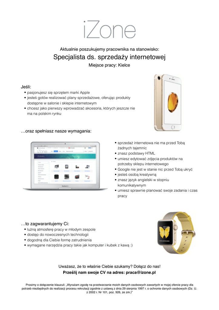 Aktualnie poszukujemy pracownika na stanowisko: Specjalista ds. sprzedaży internetowej Miejsce pracy: Kielce Jeśli: • pasjonujesz się sprzętem marki Apple • jesteś gotów realizować plany sprzedażowe, oferując produkty dostępne w salonie i sklepie internetowym • chcesz jako pierwszy wprowadzać akcesoria, których jeszcze nie ma na polskim rynku …oraz spełniasz nasze wymagania: • sprzedaż internetowa nie ma przed Tobą żadnych tajemnic • znasz podstawy HTML • umiesz edytować zdjęcia produktów na potrzeby sklepu internetowego • Google nie jest w stanie nic przed Tobą ukryć • jesteś osobą kreatywną • znasz język angielski w stopniu komunikatywnym • umiesz sprawnie planować swoje zadania i czas pracy …to zagwarantujemy Ci: • • • • luźną atmosferę pracy w młodym zespole dostęp do nowoczesnych technologii dogodną dla Ciebie formę zatrudnienia wymagane narzędzia pracy takie jak komputer i kubek z kawą :) Uważasz, że to właśnie Ciebie szukamy? Dołącz do nas! Prześlij nam swoje CV na adres: [email protected] Prosimy o dołączenie klauzuli: „Wyrażam zgodę na przetwarzanie moich danych osobowych zawartych w mojej ofercie pracy dla potrzeb niezbędnych do realizacji procesu rekrutacji zgodnie z ustawą z dnia 29 sierpnia 1997 r. o ochronie danych osobowych (Dz. U. z 2002 r. Nr 101, poz. 926, ze zm.)”