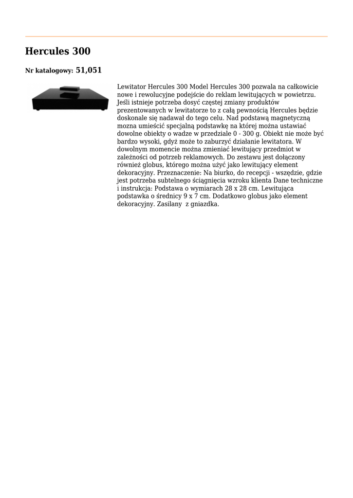 Hercules 300 Nr katalogowy: 51,051 Lewitator Hercules 300 Model Hercules 300 pozwala na całkowicie nowe i rewolucyjne podejście do reklam lewitujących w powietrzu. Jeśli istnieje potrzeba dosyć częstej zmiany produktów prezentowanych w lewitatorze to z całą pewnością Hercules będzie doskonale się nadawał do tego celu. Nad podstawą magnetyczną mozna umieścić specjalną podstawkę na której można ustawiać dowolne obiekty o wadze w przedziale 0 - 300 g. Obiekt nie może być bardzo wysoki, gdyż może to zaburzyć działanie lewitatora. W dowolnym momencie można zmieniać lewitujący przedmiot w zależności od potrzeb reklamowych. Do zestawu jest dołączony również globus, którego można użyć jako lewitujący element dekoracyjny. Przeznaczenie: Na biurko, do recepcji - wszędzie, gdzie jest potrzeba subtelnego ściągnięcia wzroku klienta Dane techniczne i instrukcja: Podstawa o wymiarach 28 x 28 cm. Lewitująca podstawka o średnicy 9 x 7 cm. Dodatkowo globus jako element dekoracyjny. Zasilany z gniazdka.