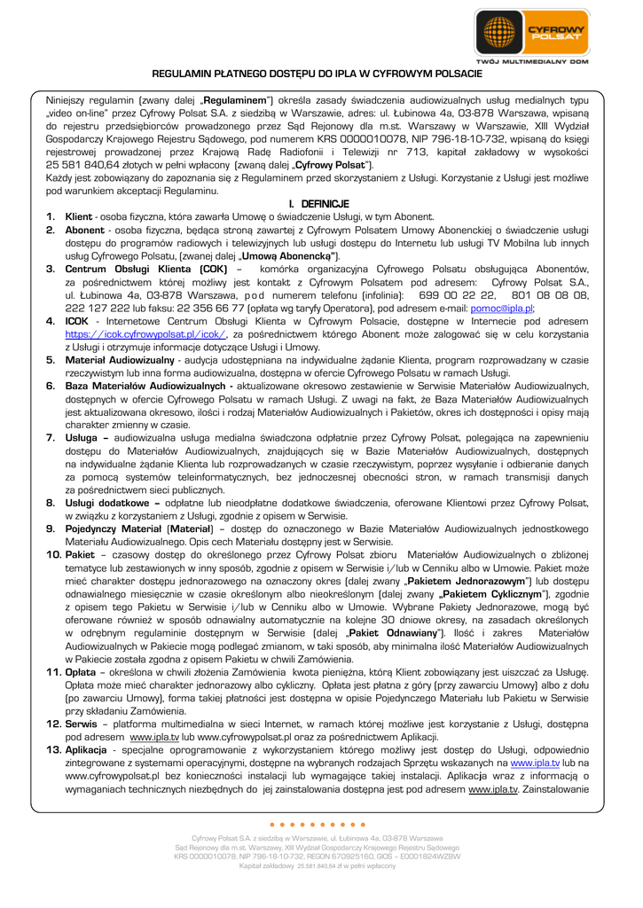 REGULAMIN PŁATNEGO DOSTĘPU DO IPLA W CYFROWYM POLSACIE Niniejszy regulamin (zwany dalej „Regulaminem”) określa zasady świadczenia audiowizualnych usług medialnych typu „video on-line” przez Cyfrowy Polsat S.A. z siedzibą w Warszawie, adres: ul. Łubinowa 4a, 03-878 Warszawa, wpisaną do rejestru przedsiębiorców prowadzonego przez Sąd Rejonowy dla m.st. Warszawy w Warszawie, XIII Wydział Gospodarczy Krajowego Rejestru Sądowego, pod numerem KRS 0000010078, NIP 796-18-10-732, wpisaną do księgi rejestrowej prowadzonej przez Krajową Radę Radiofonii i Telewizji nr 713, kapitał zakładowy w wysokości 25 581 840,64 złotych w pełni wpłacony (zwaną dalej „Cyfrowy Polsat”). Każdy jest zobowiązany do zapoznania się z Regulaminem przed skorzystaniem z Usługi. Korzystanie z Usługi jest możliwe pod warunkiem akceptacji Regulaminu. I. DEFINICJE 1. Klient - osoba fizyczna, która zawarła Umowę o świadczenie Usługi, w tym Abonent. 2. Abonent - osoba fizyczna, będąca stroną zawartej z Cyfrowym Polsatem Umowy Abonenckiej o świadczenie usługi dostępu do programów radiowych i telewizyjnych lub usługi dostępu do Internetu lub usługi TV Mobilna lub innych usług Cyfrowego Polsatu, (zwanej dalej „Umową Abonencką”). 3. Centrum Obsługi Klienta (COK) – komórka organizacyjna Cyfrowego Polsatu obsługująca Abonentów, za pośrednictwem której możliwy jest kontakt z Cyfrowym Polsatem pod adresem: Cyfrowy Polsat S.A., ul. Łubinowa 4a, 03-878 Warszawa, p o d numerem telefonu (infolinia): 699 00 22 22, 801 08 08 08, 222 127 222 lub faksu: 22 356 66 77 (opłata wg taryfy Operatora), pod adresem e-mail: [email protected]; 4. ICOK - Internetowe Centrum Obsługi Klienta w Cyfrowym Polsacie, dostępne w Internecie pod adresem https://icok.cyfrowypolsat.pl/icok/, za pośrednictwem którego Abonent może zalogować się w celu korzystania z Usługi i otrzymuje informacje dotyczące Usługi i Umowy. 5. Materiał Audiowizualny - audycja udostępniana na indywidualne żądanie Klienta, program rozprowadzany w czasie rzeczywistym lub inna forma audiowizualna, dostępna w ofercie Cyfrowego Polsatu w ramach Usługi. 6. Baza Materiałów Audiowizualnych - aktualizowane okresowo zestawienie w Serwisie Materiałów Audiowizualnych, dostępnych w ofercie Cyfrowego Polsatu w ramach Usługi. Z uwagi na fakt, że Baza Materiałów Audiowizualnych jest aktualizowana okresowo, ilości i rodzaj Materiałów Audiowizualnych i Pakietów, okres ich dostępności i opisy mają charakter zmienny w czasie. 7. Usługa – audiowizualna usługa medialna świadczona odpłatnie przez Cyfrowy Polsat, polegająca na zapewnieniu dostępu do Materiałów Audiowizualnych, znajdujących się w Bazie Materiałów Audiowizualnych, dostępnych na indywidualne żądanie Klienta lub rozprowadzanych w czasie rzeczywistym, poprzez wysyłanie i odbieranie danych za pomocą systemów teleinformatycznych, bez jednoczesnej obecności stron, w ramach transmisji danych za pośrednictwem sieci publicznych. 8. Usługi dodatkowe – odpłatne lub nieodpłatne dodatkowe świadczenia, oferowane Klientowi przez Cyfrowy Polsat, w związku z korzystaniem z Usługi, zgodnie z opisem w Serwisie. 9. Pojedynczy Materiał (Materiał) – dostęp do oznaczonego w Bazie Materiałów Audiowizualnych jednostkowego Materiału Audiowizualnego. Opis cech Materiału dostępny jest w Serwisie. 10. Pakiet – czasowy dostęp do określonego przez Cyfrowy Polsat zbioru Materiałów Audiowizualnych o zbliżonej tematyce lub zestawionych w inny sposób, zgodnie z opisem w Serwisie i/lub w Cenniku albo w Umowie. Pakiet może mieć charakter dostępu jednorazowego na oznaczony okres (dalej zwany „Pakietem Jednorazowym”) lub dostępu odnawialnego miesięcznie w czasie określonym albo nieokreślonym (dalej zwany „Pakietem Cyklicznym”), zgodnie z opisem tego Pakietu w Serwisie i/lub w Cenniku albo w Umowie. Wybrane Pakiety Jednorazowe, mogą być oferowane również w sposób odnawialny automatycznie na kolejne 30 dniowe okresy, na zasadach określonych w odrębnym regulaminie dostępnym w Serwisie (dalej „Pakiet Odnawiany”). Ilość i zakres Materiałów Audiowizualnych w Pakiecie mogą podlegać zmianom, w taki sposób, aby minimalna ilość Materiałów Audiowizualnych w Pakiecie została zgodna z opisem Pakietu w chwili Zamówienia. 11. Opłata – określona w chwili złożenia Zamówienia kwota pieniężna, którą Klient zobowiązany jest uiszczać za Usługę. Opłata może mieć charakter jednorazowy albo cykliczny. Opłata jest płatna z góry (przy zawarciu Umowy) albo z dołu (po zawarciu Umowy), forma takiej płatności jest dostępna w opisie Pojedynczego Materiału lub Pakietu w Serwisie przy składaniu Zamówienia. 12. Serwis – platforma multimedialna w sieci Internet, w ramach której możliwe jest korzystanie z Usługi, dostępna pod adresem www.ipla.tv lub www.cyfrowypolsat.pl oraz za pośrednictwem Aplikacji. 13. Aplikacja - specjalne oprogramowanie z wykorzystaniem którego możliwy jest dostęp do Usługi, odpowiednio zintegrowane z systemami operacyjnymi, dostępne na wybranych rodzajach Sprzętu wskazanych na www.ipla.tv lub na www.cyfrowypolsat.pl bez konieczności instalacji lub wymagające takiej instalacji. Aplikacja wraz z informacją o wymaganiach technicznych niezbędnych do jej zainstalowania dostępna jest pod adresem www.ipla.tv. Zainstalowanie •••••••••• Cyfrowy Polsat S.A. z siedzibą w Warszawie, ul. Łubinowa 4a, 03-878 Warszawa Sąd Rejonowy dla m.st. Warszawy, XIII Wydział Gospodarczy Krajowego Rejestru Sądowego KRS 0000010078, NIP 796-18-10-732, REGON 670925160, GIOŚ – E0001824WZBW Kapitał zakładowy 25.581.840,64 zł w pełni wpłacony 14. 15. 16. 17. 18. 19. 20. 21. Aplikacji wymaga zaakceptowanie przez Klienta warunków korzystania z Aplikacji (licencji) wskazanych przy dokonywaniu instalacji. Sprzęt - urządzenia spełniające określone w Regulaminie