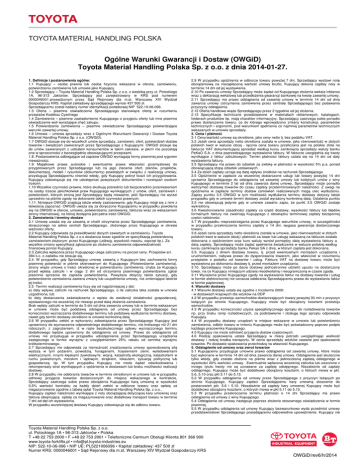 Ogólne Warunki Gwarancji i Dostaw (OWGiD) Toyota Material Handling Polska Sp. z o.o. z dnia 2014-01-27. 1. Definicje i postanowienia ogólne: 1.1 Kupujący – osoba prawna lub osoba fizyczna wskazana w ofercie, zamówieniu, potwierdzeniu zamówienia lub umowie jako Kupujący. 1.2 Sprzedający – Toyota Material Handling Polska Sp. z o.o. z siedzibą przy ul. Potockiego 1A, 96-313 Jaktorów. Sprzedający jest zarejestrowany w KRS pod numerem 0000046001 prowadzonym przez Sąd Rejonowy dla m.st. Warszawy XIV Wydział Gospodarczy KRS. Kapitał zakładowy sprzedającego wynosi 437 500 zł. Sprzedającemu został nadany numer identyfikacji podatkowej NIP 522-10-06-096. 1.3 Oferta – pisemne oświadczenie Sprzedającego stanowiące ofertę w rozumieniu przepisów Kodeksu Cywilnego 1.4 Zamówienie – pisemne zawiadomienie Kupującego o przyjęciu oferty lub inne pisemne oświadczenie woli wyrażające chęć zakupu. 1.5 Potwierdzenie zamówienia – pisemne oświadczenie Sprzedającego potwierdzające warunki zawartej umowy. 1.6 Umowa – umowa sprzedaży wraz z Ogólnymi Warunkami Gwarancji i Dostaw Toyota Material Handling Polska Sp. z o.o. (OWGiD). 1.7 OWGiD stosuje się do wszelkich umów sprzedaży, zamówień, ofert, potwierdzeń dostaw towarów i świadczeń zawieranych przez Sprzedającego z Kupującymi. OWGiD stosuje się do umów zawieranych z udziałem konsumentów w takim zakresie, w jakim nie pozostają one w sprzeczności z bezwzględnie obowiązującymi przepisami. 1.8. Postanowienia odbiegające od zapisów OWGiD wymagają formy pisemnej pod rygorem nieważności. 1.9 Majątkowe prawa autorskie i ewentualnie prawa własności przemysłowej do przygotowanych przez Sprzedającego lub na jego zlecenie ofert, planów, projektów, dokumentacji, modeli i rysunków (dokumenty) powstałych w związku z realizacją umowy, przysługują Sprzedającemu również wtedy, gdy Kupujący pokrył koszt ich przygotowania. Kupujący zobowiązuje się nie udostępniać powyższych dokumentów i rozwiązań osobom trzecim. 1.10 Wszelkie czynności prawne, które skutkują pośrednio lub bezpośrednio przeniesieniem na osoby trzecie jakichkolwiek praw Kupującego wynikających z umów, ofert, zamówień i potwierdzeń, których stroną jest Sprzedający będą nieważne, jeśli Sprzedający nie wyrazi uprzednio na piśmie zgody na dokonanie takich czynności prawnych. 1.11. Niniejsze OWGID znajdują także wtedy zastosowanie, gdy Kupujący mógł się z nimi z łatwością zapoznać. OWGID uważa się za doręczone Kupującemu w przypadku powołania się na OWGID w ofercie, umowie, potwierdzeniu zamówienia, fakturze wraz ze wskazaniem strony internetowej, na której dostępna jest pełna treść OWGID. 2. Zamówienia i terminy dostaw 2.1 Umowę uważa się za zawartą w chwili otrzymania przez Sprzedającego zamówienia, doręczonego na adres centrali Sprzedającego, złożonego przez Kupującego w okresie ważności oferty. 2.2 Kupujący odpowiada za prawidłowość danych zawartych w zamówieniu. Toyota Material Handling Polska Sp. z o.o dostarcza towar zgodnie ze specyfikacją potwierdzoną zamówieniem złożonym przez Kupującego (udźwig, wysokość masztu, osprzęt itp.). Za wszelkie zmiany specyfikacji zgłoszone po złożeniu zamówienia odpowiedzialność finansową ponosi Kupujący. 2.3 Zaliczka wpłacona przez Kupującego ulega zaliczeniu na poczet ceny. Przepisów art. 394 k.c. o zadatku nie stosuje się. 2.4. W przypadku, gdy Sprzedający umowę zawartą z Kupującym bez zachowania formy pisemnej potwierdzi w piśmie skierowanym do Kupującego (Potwierdzenie zamówienia), strony wiąże umowa o treści określonej w potwierdzeniu zamówienia, chyba że Kupujący przed wpłatą zaliczki i w ciągu 2 dni od otrzymania pisemnego potwierdzenia zgłosi pisemnie sprzeciw do zapisów potwierdzenia. Powyższe dotyczy także sytuacji, gdy potwierdzenie zamówienia zawiera zmiany lub uzupełnienia umowy, nie zmieniające istotnie jej treści. 2.5 Termin realizacji zamówienia liczy się od najpóźniejszej z dat: a) daty wpływu zaliczki na rachunek Sprzedającego, o ile zaliczka taka została w umowie uzgodniona, lub b) daty dostarczenia zaświadczenia o wpisie do ewidencji działalności gospodarczej, wystawionego nie wcześniej niż miesiąc przed datą złożenia zamówienia Brak wpłaty zaliczki w terminie do 5 dni od dnia zawarcia umowy lub w terminie wskazanym w umowie może być podstawą odstąpienia od umowy przez Sprzedającego bez konieczności wyznaczania dodatkowego terminu lub podstawą wydłużenia terminu dostawy, nawet gdy termin dostawy określono w umowie konkretną datą. 2.6 W przypadku zwłoki w wykonaniu zobowiązania przez Sprzedającego Kupujący jest uprawniony do wyznaczenia odpowiedniego dodatkowego terminu, nie krótszego niż 21 dni roboczych, z zagrożeniem, iż w razie bezskutecznego upływu wyznaczonego terminu dodatkowego będzie uprawniony do odstąpienia od umowy. Prawo do odstąpienia od umowy nie przysługuje w przypadku udostępnienia przez Sprzedającego urządzenia zastępczego w formie wynajmu z uwzględnieniem 25% rabatu od cennika wynajmu krótkoterminowego. 2.7 Sprzedający nie odpowiada za niemożność zrealizowania umowy spowodowaną siłą wyższą w tym pożarem, powodzią, huraganami, trzęsieniami ziemi, wyładowaniami elektrycznymi, innymi klęskami żywiołowymi, wojną, katastrofą ekologiczną, katastrofami w ruchu powietrznym, morskim i lądowym, strajkiem, lokautem, sytuacją polityczną lub gospodarczą, itp. W tym przypadku Kupujący nie może żądać odszkodowania i rekompensaty strat wynikających z opóźnienia w dostawach lub braku możliwości realizacji dostawy. 2.8 W przypadku nie odebrania towarów w terminie określonym w umowie lub w przypadku odmowy przyjęcia towarów dostarczonych do miejsca wskazanego w kontrakcie, Sprzedający zastrzega sobie prawo obciążenia Kupującego karą umowną w wysokości 0,5% wartości k