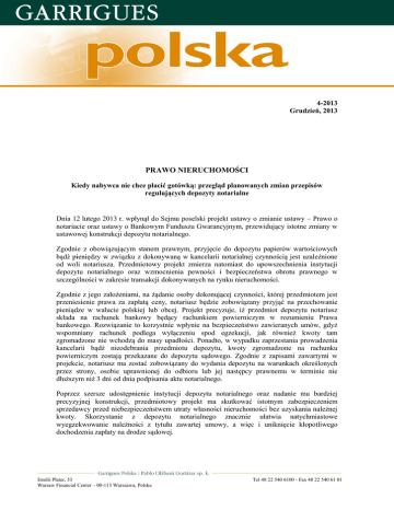 4-2013 Grudzień, 2013 PRAWO NIERUCHOMOŚCI Kiedy nabywca nie chce płacić gotówką: przegląd planowanych zmian przepisów regulujących depozyty notarialne Dnia 12 lutego 2013 r. wpłynął do Sejmu poselski projekt ustawy o zmianie ustawy – Prawo o notariacie oraz ustawy o Bankowym Funduszu Gwarancyjnym, przewidujący istotne zmiany w ustawowej konstrukcji depozytu notarialnego. Zgodnie z obowiązującym stanem prawnym, przyjęcie do depozytu papierów wartościowych bądź pieniędzy w związku z dokonywaną w kancelarii notarialnej czynnością jest uzależnione od woli notariusza. Przedmiotowy projekt zmierza natomiast do upowszechnienia instytucji depozytu notarialnego oraz wzmocnienia pewności i bezpieczeństwa obrotu prawnego w szczególności w zakresie transakcji dokonywanych na rynku nieruchomości. Zgodnie z jego założeniami, na żądanie osoby dokonującej czynności, której przedmiotem jest przeniesienie prawa za zapłatą ceny, notariusz będzie zobowiązany przyjąć na przechowanie pieniądze w walucie polskiej lub obcej. Projekt precyzuje, iż przedmiot depozytu notariusz składa na rachunek bankowy będący rachunkiem powierniczym w rozumieniu Prawa bankowego. Rozwiązanie to korzystnie wpłynie na bezpieczeństwo zawieranych umów, gdyż wspomniany rachunek podlega wyłączeniu spod egzekucji, jak również kwoty tam zgromadzone nie wchodzą do masy upadłości. Ponadto, w wypadku zaprzestania prowadzenia kancelarii bądź nieodebrania przedmiotu depozytu, kwoty zgromadzone na rachunku powierniczym zostają przekazane do depozytu sądowego. Zgodnie z zapisami zawartymi w projekcie, notariusz ma zostać zobowiązany do wydania depozytu na warunkach określonych przez strony, osobie uprawnionej do odbioru lub jej następcy prawnemu w terminie nie dłuższym niż 3 dni od dnia podpisania aktu notarialnego. Poprzez szersze udostępnienie instytucji depozytu notarialnego oraz nadanie mu bardziej precyzyjnej konstrukcji, przedmiotowy projekt ma skutkować istotnym zabezpieczeniem sprzedawcy przed niebezpieczeństwem utraty własności nieruchomości bez uzyskania należnej kwoty. Skorzystanie z depozytu notarialnego znacznie ułatwia natychmiastowe wyegzekwowanie należności z tytułu zawartej umowy, a więc i uniknięcie kłopotliwego dochodzenia zapłaty na drodze sądowej. Emilii Plater, 53 Warsaw Financial Center – 00-113 Warszawa, Polska Tel 48 22 540 6100 - Fax 48 22 540 61 01 Obecnie projekt jest już po pierwszym czytaniu w komisjach, ponadto w przedmiotowej sprawie wpłynęło również stanowisko rządu. Niestety, na tym etapie trudno jest określić, kiedy i w jakim kształcie nowelizacja zostanie uchwalona. Biorąc pod uwagę rosnącą popularność depozytu notarialnego pośród przedsiębiorców, można jedynie mieć nadzieję, iż omawiane zmiany nastąpią wkrótce. PRAWO KORPORACYJNE Zaskarżanie uchwał organów spółek kapitałowych W dniu 18 września 2013 Sąd Najwyższy (dalej „SN”) wydał uchwałę (sygn. akt III CZP 13/13; dalej „Uchwała”), w której rozstrzygnął istotne rozbieżności występujące w orzecznictwie polskich sądów w zakresie zaskarżania uchwał organów spółek kapitałowych. Kodeks Spółek Handlowych (dalej „KSH”) umożliwia zaskarżanie sprzecznych z prawem uchwał wspólników spółki z ograniczoną odpowiedzialnością oraz uchwał walnego zgromadzenia spółki akcyjnej w drodze powództwa o stwierdzenie ich nieważności. Zgodnie z opinią SN, wyrok wydany w rezultacie takiego powództwa należy uznać za konstytutywny. Oznacza to, że dopóki nie uprawomocni się wyrok stwierdzający nieważność takich uchwał, dopóty uchwały te wywołują skutki prawne. Za przyjęciem takiego stanowiska przemawia ochrona bezpieczeństwa i pewności obrotu gospodarczego, jak również stabilność stosunków korporacyjnych. Drugim z zagadnień rozstrzygniętych przez SN jest dopuszczalność zaskarżania uchwał zarządu i rady nadzorczej w spółkach kapitałowych, w tym komisji rewizyjnej w spółce z ograniczoną odpowiedzialnością. Jakkolwiek KSH milczy w tym zakresie, praktyka obrotu wskazuje na pilną potrzebę dopuszczenia takiej możliwości. SN przyjął w Uchwale, iż zaskarżanie uchwał powyższych organów spółek kapitałowych należy uznać za dopuszczalne w drodze regulowanego w Kodeksie Postępowania Cywilnego (dalej „KPC”) powództwa o ustalenie istnienia stosunku prawnego lub prawa. Zgodnie z odpowiednimi przepisami KPC, uprawnionym do wniesienia przedmiotowego powództwa jest każdy, kto ma w tym interes prawny. Wspierając tego rodzaju rozwiązanie, SN dał wyraz potrzebie szerokiej ochrony osób, które mogą być dotknięte wadliwymi uchwałami organów spółek kapitałowych. Przyjęcie jednoznacznego stanowiska przez SN powinno zakończyć rozbieżności w orzecznictwie dotyczącym przedmiotowych uchwał, a tym samym pozytywnie wpłynąć na stabilność obrotu. 2 Emilii Plater, 53 Warsaw Financial Center – 00-113 Warszawa, Polska Tel 48 22 540 6100 - Fax 48 22 540 61 01 PRAWO PRACY Zakaz stosowania weksli w stosunku pracy Do Sejmu wpłynął poselski projekt ustawy zmieniającej Kodeks pracy. Proponowana zmiana dotyczy wprowadzenia zakazu żądania przez pracodawców od pracowników oraz kandydatów na pracowników weksli, oświadczeń o poddaniu się egzekucji lub uznaniu długu, jako zabezpieczenia ewentualnych roszczeń pracodawców wynikających z istniejącego lub potencjalnego stosunku pracy. Niniejszy projekt aktualnie jest na etapie pierwszego czytania w Sejmie. Zgodnie z proponowanym rozwiązaniem, wystawienie weksla, złożenie oświadczenia przez pracownika o poddaniu się egzekucji bądź uznania długu, które mają na celu zabezpieczenie przyszłych roszczeń pracodawcy ze stosunku pracy będą nieważne. W konsekwencji, każdorazowy posiadacz takiego weksla nie będzie mógł dochodzić zaspokojenia swego roszczenia od pracownika. Jednocześnie, żądanie wys