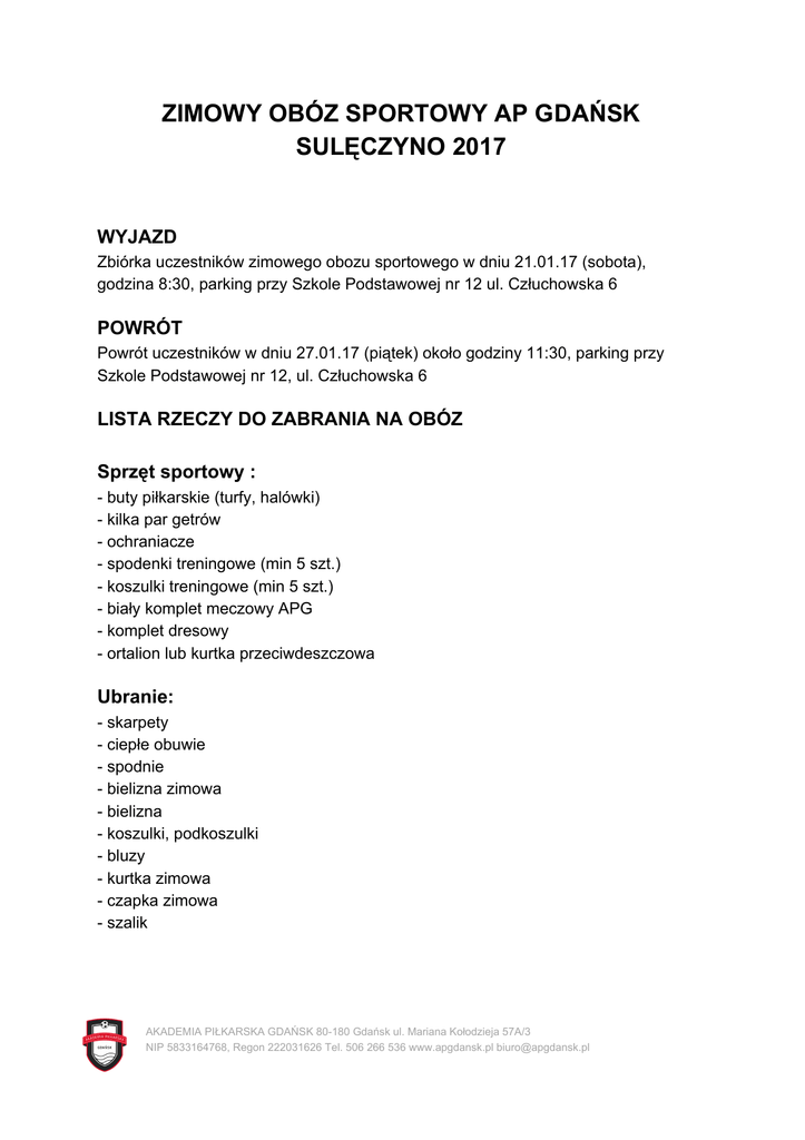 ZIMOWY OBÓZ SPORTOWY AP GDAŃSK SULĘCZYNO 2017 WYJAZD Zbiórka uczestników zimowego obozu sportowego w dniu 21.01.17 (sobota), godzina 8:30, parking przy Szkole Podstawowej nr 12 ul. Człuchowska 6 POWRÓT Powrót uczestników w dniu 27.01.17 (piątek) około godziny 11:30, parking przy Szkole Podstawowej nr 12, ul. Człuchowska 6 LISTA RZECZY DO ZABRANIA NA OBÓZ Sprzęt sportowy : - buty piłkarskie (turfy, halówki) - kilka par getrów - ochraniacze - spodenki treningowe (min 5 szt.) - koszulki treningowe (min 5 szt.) - biały komplet meczowy APG - komplet dresowy - ortalion lub kurtka przeciwdeszczowa Ubranie: - skarpety - ciepłe obuwie - spodnie - bielizna zimowa - bielizna - koszulki, podkoszulki - bluzy - kurtka zimowa - czapka zimowa - szalik AKADEMIA PIŁKARSKA GDAŃSK 80-180 Gdańsk ul. Mariana Kołodzieja 57A/3 NIP 5833164768, Regon 222031626 Tel. 506 266 536 www.apgdansk.pl [email protected] - rękawiczki (min 2 pary) - strój na basen, okulary, czepek Przybory toaletowe i inne: Piżama, klapki, 2 ręczniki, pasta do zębów, szczoteczka do zębów, mydło lub żel do mycia, szampon do włosów, prowiant na podróż, legitymacja szkolna, ewentualne lekarstwa (z upoważnieniem dla Trenera) MAKSYMALNA KWOTA KIESZONKOWEGO WYNOSI 10 PLN/DZIEŃ Prosimy, aby dzieci nie brały na obóz: - zapasu słodyczy na cały tydzień !!! - chipsów, paluszków słonych, orzeszków solonych, napojów gazowanych - łańcuszków, wisiorków, itp - drogiego sprzętu elektronicznego (nie odpowiadamy za rzeczy zgubione podczas obozu) Można zabrać TELEFONY KOMÓRKOWE W sprawach pilnych proszę o kontakt. Maliszewski Piotr tel. 506266536 AKADEMIA PIŁKARSKA GDAŃSK 80-180 Gdańsk ul. Mariana Kołodzieja 57A/3 NIP 5833164768, Regon 222031626 Tel. 506 266 536 www.apgdansk.pl [email protected]