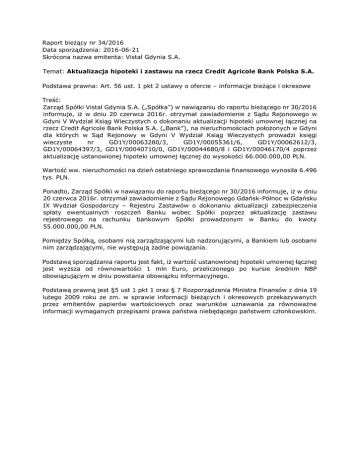 Raport bieżący nr 34/2016 Data sporządzenia: 2016-06-21 Skrócona nazwa emitenta: Vistal Gdynia S.A. Temat: Aktualizacja hipoteki i zastawu na rzecz Credit Agricole Bank Polska S.A. Podstawa prawna: Art. 56 ust. 1 pkt 2 ustawy o ofercie – informacje bieżące i okresowe Treść: Zarząd Spółki Vistal Gdynia S.A. („Spółka”) w nawiązaniu do raportu bieżącego nr 30/2016 informuje, iż w dniu 20 czerwca 2016r. otrzymał zawiadomienie z Sądu Rejonowego w Gdyni V Wydział Ksiąg Wieczystych o dokonaniu aktualizacji hipoteki umownej łącznej na rzecz Credit Agricole Bank Polska S.A. („Bank”), na nieruchomościach położonych w Gdyni dla których w Sąd Rejonowy w Gdyni V Wydział Ksiąg Wieczystych prowadzi księgi wieczyste nr GD1Y/00063280/3, GD1Y/00055361/6, GD1Y/00062612/3, GD1Y/00064397/3, GD1Y/00040710/0, GD1Y/00044680/8 i GD1Y/00046170/4 poprzez aktualizację ustanowionej hipoteki umownej łącznej do wysokości 66.000.000,00 PLN. Wartość ww. nieruchomości na dzień ostatniego sprawozdania finansowego wynosiła 6.496 tys. PLN. Ponadto, Zarząd Spółki w nawiązaniu do raportu bieżącego nr 30/2016 informuje, iż w dniu 20 czerwca 2016r. otrzymał zawiadomienie z Sądu Rejonowego Gdańsk-Północ w Gdańsku IX Wydział Gospodarczy – Rejestru Zastawów o dokonaniu aktualizacji zabezpieczenia spłaty ewentualnych roszczeń Banku wobec Spółki poprzez aktualizację zastawu rejestrowego na rachunku bankowym Spółki prowadzonym w Banku do kwoty 55.000.000,00 PLN. Pomiędzy Spółką, osobami nią zarządzającymi lub nadzorującymi, a Bankiem lub osobami nim zarządzającymi, nie występują żadne powiązania. Podstawą sporządzania raportu jest fakt, iż wartość ustanowionej hipoteki umownej łącznej jest wyższa od równowartości 1 mln Euro, przeliczonego po kursie średnim NBP obowiązującym w dniu powstania obowiązku informacyjnego. Podstawą prawną jest §5 ust 1 pkt 1 oraz § 7 Rozporządzenia Ministra Finansów z dnia 19 lutego 2009 roku ze zm. w sprawie informacji bieżących i okresowych przekazywanych przez emitentów papierów wartościowych oraz warunków uznawania za równoważne informacji wymaganych przepisami prawa państwa niebędącego państwem członkowskim.