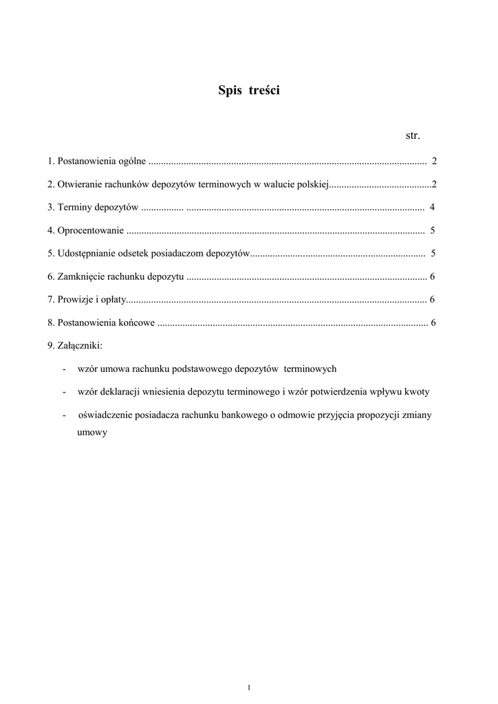 Spis treści str. 1. Postanowienia ogólne ............................................................................................................... 2 2. Otwieranie rachunków depozytów terminowych w walucie polskiej.........................................2 3. Terminy depozytów ................. ............................................................................................... 4 4. Oprocentowanie ....................................................................................................................... 5 5. Udostępnianie odsetek posiadaczom depozytów...................................................................... 5 6. Zamknięcie rachunku depozytu ................................................................................................ 6 7. Prowizje i opłaty........................................................................................................................ 6 8. Postanowienia końcowe ............................................................................................................ 6 9. Załączniki: - wzór umowa rachunku podstawowego depozytów terminowych - wzór deklaracji wniesienia depozytu terminowego i wzór potwierdzenia wpływu kwoty - oświadczenie posiadacza rachunku bankowego o odmowie przyjęcia propozycji zmiany umowy 1 Postanowienia ogólne §1 Regulamin określa zasady otwierania i prowadzenia rachunku podstawowego depozytów terminowych w walucie polskiej przez jednostki organizacyjne Banku Spółdzielczego w Raszynie oraz w jego ramach rachunków depozytów terminowych dla klientów instytucjonalnych - rezydentów i nierezydentów. 2. Przez użyte w regulaminie określenia należy rozumieć: 1) Bank – jednostka organizacyjna Banku Spółdzielczego w Raszynie, 2) Uchwała - Uchwała Zarządu Banku Spółdzielczego w Raszynie w sprawie oprocentowania środków pieniężnych złotowych gromadzonych w BS w Raszynie i kredytów udzielanych przez BS w Raszynie, 3) Depozyt terminowy - deponowanie środków pieniężnych w Banku na warunkach określonych w Uchwale, 4) Dzień rozpoczęcia (wniesienia) lokaty – ustalony między Klientem i Bankiem dzień, w którym środki pieniężne zostają przekazane na rachunek lokat terminowych Klienta, a w stosunku do lokat odnawialnych pierwszy dzień po upływie zadeklarowanego okresu pierwotnego, 5) Dzień zakończenia depozytu - ustalony między Klientem i Bankiem dzień, w którym kwota lokaty wraz z odsetkami zostaje przekazana zgodnie z dyspozycją klienta zawartą w deklaracji wniesienia lokaty, 6) Istotne warunki lokaty – wskazane w § 5 ust. 2 pkt 1 Regulaminu warunki lokaty, 7) Waluta lokaty – waluta, w której składana jest lokata, 8) Rezydent – w rozumieniu Ustawy Prawo dewizowe, 9) Nierezydent – w rozumieniu Ustawy Prawo dewizowe, 10) Umowa – umowa rachunku depozytów terminowych w walucie polskiej, 11) Posiadacz depozytu (klient instytucjonalny) – osoby prawne oraz jednostki organizacyjne nie posiadające osobowości prawnej o ile mają zdolność prawną, osoby fizyczne, które zawodowo we własnym imieniu podejmują i wykonują działalność gospodarczą, osoby fizyczne osiągające dochody z najmu lub dzierżawy oraz inne osoby fizyczne w szczególności reprezentujące ciała społeczne i wykonujące wolne zawody, 1. §2 Rachunki depozytów terminowych otwierane są dla klientów instytucjonalnych, zwanych dalej „Posiadaczami depozytów”. §3 Minimalna kwota depozytu terminowego wynosi 1 000 złotych. Otwieranie rachunków depozytów terminowych w walucie polskiej §4 1. Otwarcie rachunku podstawowego depozytów terminowych następuje w Banku na podstawie umowy stanowiącej załącznik nr 1 do niniejszego Regulaminu. Przy zawieraniu umów stosuje się odpowiednio zasady określone w przepisach Banku o otwieraniu i prowadzeniu rachunków bankowych. 2. Podmiot nie posiadający w Banku rachunku bieżącego składa: 1) Rezydent: a) dokumenty określające jego status prawny, 2 b) kartę wzorów podpisów, w której wskazuje osoby upoważnione do dysponowania środkami pieniężnymi na rachunku podstawowym depozytów terminowych oraz odsetkami od tych środków, c) zawiadomienie o nadaniu numeru identyfikacyjnego dla celów statystycznych (REGON) oraz decyzję w sprawie nadania numeru identyfikacji podatkowej NIP. 2) Nierezydent: a) dokumenty określające jego status prawny i charakter działalności (odpis z zagranicznego rejestru firm lub inny dokument urzędowy zawierający podstawowe dane o nierezydencie), wydany w kraju siedziby (miejsca zamieszkania) nierezydenta, b) kartę wzorów podpisów, w której wskazuje osoby upoważnione do dysponowania środkami pieniężnymi na rachunku podstawowym depozytów terminowych w walutach wymienialnych oraz odsetkami od tych środków, c) inne dokumenty, jeżeli Bank uzna, że są niezbędne do zawarcia umowy. 3. Dokumenty, o których mowa w ust. 2 powinny być aktualne, tzn. okres od daty ich wystawienia nie powinien przekraczać 3 miesięcy. 4. Dokumenty, o których mowa w ust. 2 przedkładane są w oryginale lub w formie urzędowych odpisów lub poświadczonych notarialnie kopii. Pracownik banku potwierdza zgodność kserokopii z przedłożonymi oryginałami dokumentów składając czytelny podpis, odnotowując datę i parafując każdą stronę kserokopii. Oryginały dokumentów zwracane są Wnioskodawcy. 5. Dokumenty wystawione w językach obcych muszą być składane przez przedsiębiorców wraz z ich tłumaczeniem na język polski. 6. Tłumaczenie powinno być sporządzone przez polskiego tłumacza przysięgłego lub tłumacza zagranicznego. 7. Tłumaczenie dokumentów przez tłumacza zagranicznego musi być poświadczone przez właściwą ze względu na siedzibę nierezydenta polska placówkę dyplomatyczną lub konsularną. 8. W przypadku, gdy posiadacz depozytu posiada w Banku rachunek bieżący Bank może odstąpić od żądania złożenia dokumentów, które znajdują si