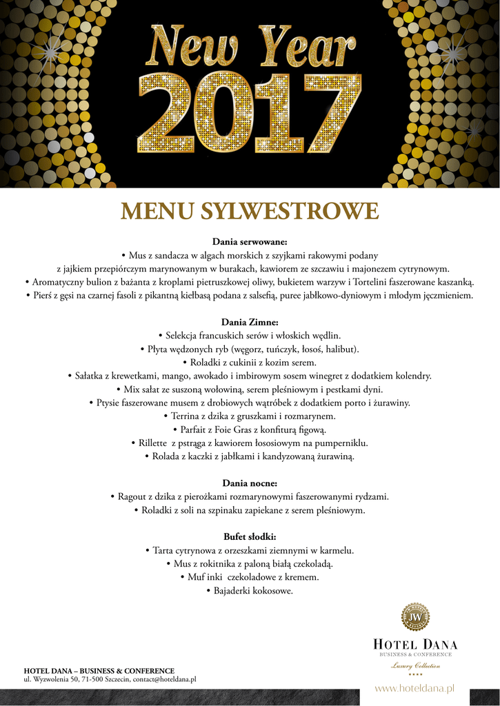 MENU SYLWESTROWE Dania serwowane: •Mus z sandacza w algach morskich z szyjkami rakowymi podany z jajkiem przepiórczym marynowanym w burakach, kawiorem ze szczawiu i majonezem cytrynowym. •Aromatyczny bulion z bażanta z kroplami pietruszkowej oliwy, bukietem warzyw i Tortelini faszerowane kaszanką. •Pierś z gęsi na czarnej fasoli z pikantną kiełbasą podana z salsefią, puree jabłkowo-dyniowym i młodym jęczmieniem. Dania Zimne: •Selekcja francuskich serów i włoskich wędlin. •Płyta wędzonych ryb (węgorz, tuńczyk, łosoś, halibut). •Roladki z cukinii z kozim serem. •Sałatka z krewetkami, mango, awokado i imbirowym sosem winegret z dodatkiem kolendry. •Mix sałat ze suszoną wołowiną, serem pleśniowym i pestkami dyni. •Ptysie faszerowane musem z drobiowych wątróbek z dodatkiem porto i żurawiny. •Terrina z dzika z gruszkami i rozmarynem. •Parfait z Foie Gras z konfiturą figową. •Rillette z pstrąga z kawiorem łososiowym na pumperniklu. •Rolada z kaczki z jabłkami i kandyzowaną żurawiną. Dania nocne: •Ragout z dzika z pierożkami rozmarynowymi faszerowanymi rydzami. •Roladki z soli na szpinaku zapiekane z serem pleśniowym. Bufet słodki: •Tarta cytrynowa z orzeszkami ziemnymi w karmelu. •Mus z rokitnika z paloną białą czekoladą. •Muf inki czekoladowe z kremem. •Bajaderki kokosowe. HOTEL DANA – BUSINESS & CONFERENCE ul. Wyzwolenia 50, 71-500 Szczecin, [email protected] www.hoteldana.pl