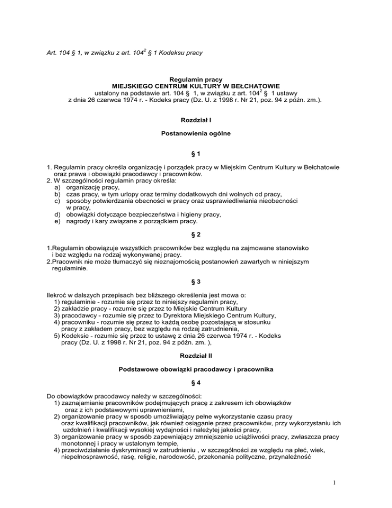 2 Art. 104 § 1, w związku z art. 104 § 1 Kodeksu pracy Regulamin pracy MIEJSKIEGO CENTRUM KULTURY W BEŁCHATOWIE 2 ustalony na podstawie art. 104 § 1, w związku z art. 104 § 1 ustawy z dnia 26 czerwca 1974 r. - Kodeks pracy (Dz. U. z 1998 r. Nr 21, poz. 94 z późn. zm.). Rozdział I Postanowienia ogólne §1 1. Regulamin pracy określa organizację i porządek pracy w Miejskim Centrum Kultury w Bełchatowie oraz prawa i obowiązki pracodawcy i pracowników. 2. W szczególności regulamin pracy określa: a) organizację pracy, b) czas pracy, w tym urlopy oraz terminy dodatkowych dni wolnych od pracy, c) sposoby potwierdzania obecności w pracy oraz usprawiedliwiania nieobecności w pracy, d) obowiązki dotyczące bezpieczeństwa i higieny pracy, e) nagrody i kary związane z porządkiem pracy. §2 1.Regulamin obowiązuje wszystkich pracowników bez względu na zajmowane stanowisko i bez względu na rodzaj wykonywanej pracy. 2.Pracownik nie moŜe tłumaczyć się nieznajomością postanowień zawartych w niniejszym regulaminie. §3 Ilekroć w dalszych przepisach bez bliŜszego określenia jest mowa o: 1) regulaminie - rozumie się przez to niniejszy regulamin pracy, 2) zakładzie pracy - rozumie się przez to Miejskie Centrum Kultury 3) pracodawcy - rozumie się przez to Dyrektora Miejskiego Centrum Kultury, 4) pracowniku - rozumie się przez to kaŜdą osobę pozostającą w stosunku pracy z zakładem pracy, bez względu na rodzaj zatrudnienia, 5) Kodeksie - rozumie się przez to ustawę z dnia 26 czerwca 1974 r. - Kodeks pracy (Dz. U. z 1998 r. Nr 21, poz. 94 z późn. zm. ), Rozdział II Podstawowe obowiązki pracodawcy i pracownika §4 Do obowiązków pracodawcy naleŜy w szczególności: 1) zaznajamianie pracowników podejmujących pracę z zakresem ich obowiązków oraz z ich podstawowymi uprawnieniami, 2) organizowanie pracy w sposób umoŜliwiający pełne wykorzystanie czasu pracy oraz kwalifikacji pracowników, jak równieŜ osiąganie przez pracowników, przy wykorzystaniu ich uzdolnień i kwalifikacji wysokiej wydajności i naleŜytej jakości pracy, 3) organizowanie pracy w sposób zapewniający zmniejszenie uciąŜliwości pracy, zwłaszcza pracy monotonnej i pracy w ustalonym tempie, 4) przeciwdziałanie dyskryminacji w zatrudnieniu , w szczególności ze względu na płeć, wiek, niepełnosprawność, rasę, religie, narodowość, przekonania polityczne, przynaleŜność 1 związkową, pochodzenie etniczne, wyznanie, orientacje seksualną, a takŜe ze względu na zatrudnienie na czas określony lub nie określony albo w pełnym lub niepełnym wymiarze czasu pracy, 5) ułatwianie podnoszenia kwalifikacji przez pracowników, 6) stwarzanie pracownikom podejmującym zatrudnienie po ukończeniu szkoły prowadzącej kształcenie zawodowe lub szkoły wyŜszej warunki sprzyjające przystosowaniu się do naleŜytego wykonywania pracy, 7) terminowe i prawidłowe wypłacanie wynagrodzenia, a na Ŝądanie pracownika takŜe udostępnianie dokumentacji, na podstawie której wynagrodzenie zostało obliczone, 8) zapewnianie bezpiecznych i higienicznych warunków pracy oraz prowadzenie systematycznych szkoleń w tym zakresie, 9) stosowanie obiektywnych i sprawiedliwych kryteriów oceny pracowników, 10) przeciwdziałanie mobbingowi, 11) prowadzenie dokumentacji w sprawach związanych ze stosunkiem pracy oraz akt osobowych pracowników. 12) zaspokajanie, w miarę posiadanych środków, socjalnych potrzeb pracowników, 13) wpływanie na kształtowanie w zakładzie pracy zasad współŜycia społecznego. §5 Do obowiązków pracownika naleŜy w szczególności: 1) sumienne i staranne wykonywanie pracy, 2) wykonywanie poleceń przełoŜonego, o ile nie są one sprzeczne z przepisami prawa lub umową o pracę, 3) przestrzeganie ustalonego czasu pracy, w tym punktualne rozpoczynanie pracy, 4) przestrzeganie przepisów oraz zasad bezpieczeństwa i higieny pracy, 5) dbanie o dobro zakładu pracy oraz ochrona jego mienia, 6) przestrzeganie tajemnicy państwowej i słuŜbowej, określonej w odrębnych przepisach, 7) przestrzeganie postanowień regulaminu, 8) przestrzeganie zasad współŜycia społecznego, 9) w przypadku rozwiązania stosunku pracy - rozliczenie się ze zobowiązań wobec zakładu pracy przed ustaniem stosunku pracy. Rozdział III Czas pracy § 6 Czas pracy to czas, w którym pracownik pozostaje w dyspozycji pracodawcy w zakładzie pracy lub w innym miejscu wyznaczonym do wykonywania pracy. §7 1. Czas pracy pracowników MCK wynosi 40 godzin tygodniowo w jednomiesięcznym okresie rozliczeniowym. Czas pracy pracowników zatrudnionych w niepełnym wymiarze czasu pracy ustalają indywidualne umowy o pracę. Kierowcy zatrudnieni są w wymiarze ryczałtowym i ich wymiar czasu pracy określa umowa o pracę 2. W stosunku do pracowników działów merytotycznych MCK ze względu na specyfikę pracy instytucji kultury mającej na celu zaspakajanie potrzeb kulturalnych społeczności lokalnej, a w szczególności organizowanie imprez kulturalnych odbywających się w róŜnych godzinach, prowadzenie popołudniowych zajęć z dziećmi, młodzieŜą i osobami dorosłymi, przygotowanie róŜnego rodzaju przedsięwzięć artystycznych itp., jest stosowany równowaŜny system czasu pracy. Przewiduje on wydłuŜenie czasu pracy do 12 godzin na dobę w niektórych dniach w tygodniu orazjednocześnie skrócenie dobowego wymiaru czasu pracy do 4 godzin na dobę w pozostałych dniach tygodnia pracy.Łączny czas pracy wynosi 40 godzin tygodniowo. 3. Godziny pracy ustalone są przez dyrektora MCK oddzielnym rozkładem (harmonogramem). 2 Godziny rozpoczynania i kończenia pracy pracowników zatrudnionych w niepełnym wymiarze czasu pracy ustala się indywidualnie. 4. Wszyscy pracownicy winni potwierdzić wpisem swoją obecność w pracy na liście obecności. 5. Czas pracy MCK podzielony jest na dwie zmiany: a) pierwsza zmiana rozpoczyna pracę od godz. 8.00 a kończy o godz. 16.00 lub trwa od 9,00 