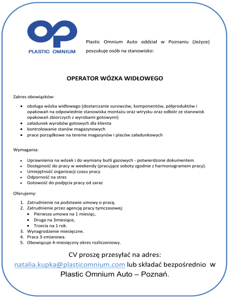 Plastic Omnium Auto oddział w Poznaniu (Jeżyce) poszukuje osób na stanowisko: OPERATOR WÓZKA WIDŁOWEGO Zakres obowiązków: obsługa wózka widłowego (dostarczanie surowców, komponentów, półproduktów i opakowań na odpowiednie stanowiska montażu oraz wtrysku oraz odbiór ze stanowisk opakowań zbiorczych z wyrobami gotowymi) załadunek wyrobów gotowych dla klienta kontrolowanie stanów magazynowych prace porządkowe na terenie magazynów i placów załadunkowych Wymagania: Uprawnienia na wózek i do wymiany butli gazowych - potwierdzone dokumentem Dostępność do pracy w weekendy (pracujące soboty zgodnie z harmonogramem pracy). Umiejętność organizacji czasu pracy Odporność na stres Gotowość do podjęcia pracy od zaraz Oferujemy: 1. Zatrudnienie na podstawie umowy o pracę. 2. Zatrudnienie przez agencję pracy tymczasowej: Pierwsza umowa na 1 miesiąc, Druga na 3miesiące, Trzecia na 1 rok. 3. Wynagrodzenie miesięczne. 4. Praca 3-zmianowa. 5. Obowiązuje 4-miesięczny okres rozliczeniowy. CV proszę przesyłać na adres: [email protected] lub składać bezpośrednio w Plastic Omnium Auto – Poznań.