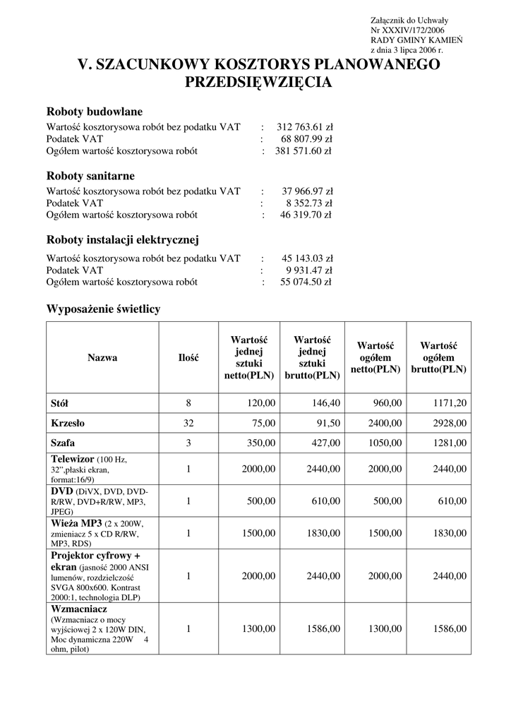 Załącznik do Uchwały Nr XXXIV/172/2006 RADY GMINY KAMIEŃ z dnia 3 lipca 2006 r. V. SZACUNKOWY KOSZTORYS PLANOWANEGO PRZEDSIĘWZIĘCIA Roboty budowlane Wartość kosztorysowa robót bez podatku VAT Podatek VAT Ogółem wartość kosztorysowa robót : : : 312 763.61 zł 68 807.99 zł 381 571.60 zł : : : 37 966.97 zł 8 352.73 zł 46 319.70 zł : : : 45 143.03 zł 9 931.47 zł 55 074.50 zł Roboty sanitarne Wartość kosztorysowa robót bez podatku VAT Podatek VAT Ogółem wartość kosztorysowa robót Roboty instalacji elektrycznej Wartość kosztorysowa robót bez podatku VAT Podatek VAT Ogółem wartość kosztorysowa robót Wyposażenie świetlicy Nazwa Ilość Wartość jednej sztuki netto(PLN) Wartość jednej sztuki brutto(PLN) Wartość ogółem netto(PLN) Wartość ogółem brutto(PLN) Stół 8 120,00 146,40 960,00 1171,20 Krzesło 32 75,00 91,50 2400,00 2928,00 Szafa 3 350,00 427,00 1050,00 1281,00 1 2000,00 2440,00 2000,00 2440,00 1 500,00 610,00 500,00 610,00 1 1500,00 1830,00 1500,00 1830,00 1 2000,00 2440,00 2000,00 2440,00 1 1300,00 1586,00 1300,00 1586,00 Telewizor (100 Hz, 32”,płaski ekran, format:16/9) DVD (DiVX, DVD, DVDR/RW, DVD+R/RW, MP3, JPEG) Wieża MP3 (2 x 200W, zmieniacz 5 x CD R/RW, MP3, RDS) Projektor cyfrowy + ekran (jasność 2000 ANSI lumenów, rozdzielczość SVGA 800x600. Kontrast 2000:1, technologia DLP) Wzmacniacz (Wzmacniacz o mocy wyjściowej 2 x 120W DIN, Moc dynamiczna 220W 4 ohm, pilot) Kolumny (100W) 2 700,00 854,00 1400,00 1708,00 Mikrofon 1 300,00 366,00 300,00 366,00 6 3400,00 4148,00 20400,00 24888,00 Drukarka laserowa monochromatyczna 1 800,00 976,00 800,00 976,00 Skaner 1 400,00 488,00 400,00 488,00 Biurko komputerowe 6 300,00 366,00 1800,00 2196,00 Krzesło obrotowe 6 150,00 183,00 900,00 1098,00 Stolik na telewizor i DVD 1 500,00 610,00 500,00 610,00 Stół do pig-ponga 1 700,00 854,00 700,00 854,00 Atlas do ćwiczeń 1 1500,00 1830,00 1500,00 1830,00 Alarm 1 3200,00 3904,00 3200,00 3904,00 Podłączenie pod Internet 1 1500,00 1830,00 1500,00 1830,00 RAZEM 76 21295,00 25979,90 45110,00 55034,20 (bezprzewodowy, stojak) Komputery (monitor LCD 17”, płyta FSB 800, grafika 128 MB, HDD 120GB procesor 3,0Ghz, RAM 1024,DVDRW,klawiatura, mysz, UPS obudowa ATX 400W , FDD, (system operacyjny Windows XP, program biurowy Office, program anty-wirusowy,) Koszt projektu brutto - 558740 PLN VI. HARMONOGRAM PLANOWANEGO PRZEDSIĘWZIĘCIA - REMONT I ROZBUDOWA ORAZ WYPOSAŻENIE BUDYNKU ŚWIETLICY WE WSI STRACHOSŁAW Projekt realizować będziemy w latach 2006-2007 i będzie dotyczył robót budowlanych, sanitarnych i elektrycznych oraz wyposażenie świetlicy w meble, komputery, sprzęt RTV: Luty 2006r. - sporządzona dokumentacja techniczna obejmująca roboty budowlane, sanitarne i elektryczne Marzec 2006 - złożenie wniosku o współfinansowanie projektu z SPO Restrukturyzacja i modernizacja sektora żywnościowego oraz rozwój obszarów wiejskich 20042006 w zakresie „Odnowy wsi oraz zachowania i ochrony dziedzictwa kulturowego" kwiecień 2007 r. - rozstrzygnięcie przetargu, maj 2007 r. - rozpoczęcie robót budowlanych, sanitarnych i elektrycznych, Wrzesień 2007 r. - zakończenie robót robót budowlanych, sanitarnych i elektrycznych, październik 2007 r. - wyposażenie świetlicy listopad 2007 r. - rozliczenie projektu - planowany termin rozpoczęcia zadania - 02.2006 r. - planowany termin zakończenia zadania - 10.2007 r. 26. Harmonogram realizacji projektu Zakres zadań Planowany Planowany termin planowanych termin zakończeni do wykonania rozpoczęcia a zadania w ramach zadania (miesiąc/ro etapu (miesiąc/rok) k) 1 2 3 Etap I Dokumentacja techniczna, przebudowa 02.2006 10.2007 sanitarna, roboty budowlane i instalacyjne, wyposażenie świetlicy Planowany termin złożenia wniosku o płatność (miesiąc/rok) 4 11.2007 Koszty projektu (w zł) VAT w Koszty kwalifikowan kosztach e ogółem kwalifikowanyc (w zł) h (w zł) 5 6 7 558740 558740 100756