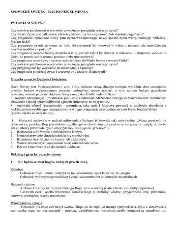SPOWIEDŹ ŚWIĘTA – RACHUNEK SUMIENIA PYTANIA WSTEPNE Czy jesteście przekonani o potrzebie poważnego przeglądu waszego życia? Czy wasze Życie jest całkowicie chrześcijańskie, czy tez częściowo, lub zupełnie pogańskie? Czy pragniecie opracować nowy plan życia wewnętrznego, nowy sposób życia wiarą, nadzieją! Miłością, życiem łaski? Czy pragniecie czynić to samo, co inni, ale staranniej by wytrwać w walce z mocami zła, prawdziwym wysiłku modlitwy i pokuty? Czy pragniecie uciszać hałasy dookoła was (a jest ich tyle!) by słuchać w milczeniu i skupieniu wezwań z Góry, bo pomóc sobie usunąć grożące niebezpieczeństwa? Czy pragniecie mieć żywe i szczere nabożeństwo do Matki Jezusa i waszej Matki? Czy jesteście przekonani o potrzebie poważnego przeglądu waszego życia? Czy przyjmujecie Jej wezwanie do umartwiania i pokuty? Czy pragniecie powrócić żywo i szczerze do Jezusa w Eucharystii? Grzechy przeciw Duchowi Świętemu Duch Święty jest Pocieszycielem i tym, który obdarza łaską, dlatego teologia wyróżnia dwa szczególne grzechy będące wykroczeniem przeciw teologalnej cnocie nadziei, a tym samym będące grzechami poważnej materii przeciw Duchowi Świętemu, jako Źródle nadziei. Są to: • rozpacz (desperacja) - rozumiana, jako stałe i całkowite odrzucenie Bożego miłosierdzia oraz możliwości zbawienia i Bożej sprawiedliwości (grzech śmiertelny ze swej natury) • zuchwała ufność (presumpcja) - rozumiana, jako stała i fałszywa pewność w zdobyciu zbawienia z wykluczeniem osobistego zaangażowania w jego osiągnięcie przy jednoczesnym braku bojaźni Bożej (grzech ciężki ze swej natury) . 1. Grzeszyć zuchwale w nadziei miłosierdzia Bożego. (Człowiek taki mówi sobie: „Mogę grzeszyć, ile tylko mi się podoba. Bóg jest miłosierny, dlatego w chwili śmierci przebaczy mi grzechy i pójdę do nieba jak ci, którzy przez całe życie «męczyli się», usiłując nie grzeszyć".) 2. Rozpaczać albo wątpić o miłosierdziu Bożym. 3. Uznanej prawdzie chrześcijańskiej się sprzeciwiać. 4. Bliźniemu łaski Bożej nie życzyć lub zazdrościć. 5. Wobec zbawiennych napomnień mieć zatwardziałe serce. 6. Pokutę i nawrócenie aż do śmierci odkładać. Dekalog i grzechy przeciw niemu 1. Nie będziesz miał bogów cudzych przede mną. Zabobon · Człowiek (myśli, mówi, wierzy) że np. sakramenty, cuda Boże itp. to „magia” · Człowiek wykorzystuje modlitwę i znaki sakramentalne do korzyści materialnych Bałwochwalstwo · Człowiek wierzy nie w prawdziwego Boga, lecz w różnej postaci bożki (np. kulty pogańskie) · Człowiek czci i wielbi stworzenie zamiast Boga tj. demony, władzę, przyjemność, rasę, przodków, państwo, pieniądze, rzeczy materialne. Wróżbiarstwo i magia · Człowiek nie chce zawierzyć swemu Bogu co do tego, co nastąpi (przyszłości), tylko z ciekawością sam szuka tego, co ma nastąpić - poprzez wróżbiarstwo, horoskopy, próby kontaktu ze zmarłymi itp. (pragnienie panowania nad czasem) Świętych Obcowanie - modlitwy do zmarłych będących w czyśćcu bądź w niebie są pożyteczne dla człowieka i są wielką łaską daną od Boga. Bezbożność · Zrzucanie na Boga wszelkich nieszczęść, które spotkały człowieka, pytania typu gdzie jest Bóg, czemu nie pomógł itp. Dlaczego Bóg nie zareaguje itp.; zuchwała rozmowa z Bogiem np. „Panie daj mi ….. a będę cię wielbił czy kochał - w domyśle jak mi nie dasz to nie będę cię wielbił itp.” · Niegodne traktowanie sakramentów (np. spowiedzi i innych) · Niegodne traktowanie rzeczy, osób, miejsc, czynności - liturgicznych i sakralnych, szczególnie ciężka jest profanacja Eucharystii · Człowiek, który wie (czuje) ze posiada dary, dobra duchowe pochodzące od Boga i tych darów nie wykorzystuje (darmo) dla dobra bliźnich, bądź wykorzystuje dla swoich partykularnych celów sprzecznych z nauka kościoła i wolą Bożą lub każe potrzebującym za te dary płacić dla własnego zysku. · Kuszenie Boga - wystawianie Boga na próbę (w słowach lub w uczynkach) Jego dobroci i wszechmocy. · Świętokradztwo - polega na profanowaniu lub niegodnym traktowaniu sakramentów i innych czynności liturgicznych, jak również osób, rzeczy i miejsc poświęconych Bogu. Świętokradztwo jest grzechem ciężkim, zwłaszcza, jeżeli jest popełnione przeciw Eucharystii, ponieważ w tym sakramencie jest obecne w sposób substancjalny Ciało samego Chrystusa (Por. KPK, kan. 1367; 1376). · Symonia - określana jest, jako nabywanie lub sprzedawanie rzeczywistości duchowych. Ateizm · Człowiek odrzuca lub neguje istnienie żywego Boga · Człowieka nie interesuje Życie wewnętrzne (duchowe) tj. nie chce utrzymywać wewnętrznej łączności z Bogiem lub wyraźnie ją odrzuca · Człowiek uważa, że jest sam sobie Panem i Bogiem i sam decyduje o swoim doczesnym i przyszłym życiu, interesuje go tylko to, co widzi, słyszy, czuje tj. materia · Człowiek zachwyca się i interesuje tylko budowaniem swej pozycji w życiu doczesnym, religie i wiarę w Boga uważa za ułudę (złudzenie) Agnostycyzm · Człowiek taki, jeżeli nawet nie neguje istnienia Boga to traktuje go, jako „byt” zbyt odległy człowiekowi i nie interesuje się nim (istnienie Boga nie możliwe do udowodnienia jak również do zanegowania) tj. całkowity brak wiary. 2. Nie będziesz brał imienia Boga twego nadaremno. Wymawianie imienia Bożego nadaremno · Człowiek wypowiada święte imię Boże lub imiona Świętych w celu innym niż czynienie dobra, w celu niezgodnym z wolą Bożą · Człowiek Nie wypowiada świętych imion z miłością w sercu, bez należytego szacunku i bojaźni · Człowiek przyzywa imienia Boga do spraw błahych i niegodnych tegoż wezwania oraz woła do Boga a nie ma w sobie szczerej chęci pragnienia zmiany swego życia · Człowiek używa Boskiego imienia do spraw magicznych itp. Nie jest [wymawiane] ‘na p