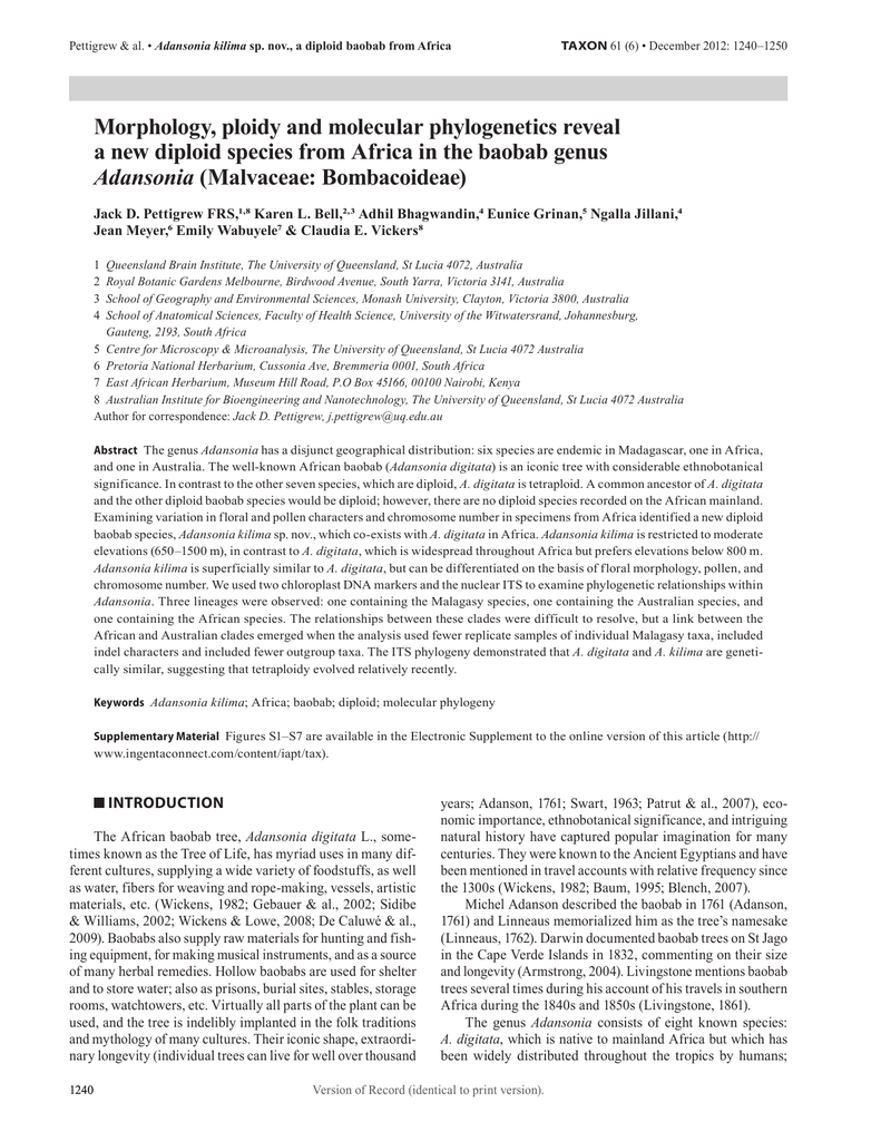 Pettigrew & al. • Adansonia kilima sp. nov., a diploid baobab from Africa TAXON 61 (6) • December 2012: 1240–1250 Morphology, ploidy and molecular phylogenetics reveal a new diploid species from Africa in the baobab genus Adansonia (Malvaceae: Bombacoideae) Jack D. Pettigrew FRS,1,8 Karen L. Bell,2,3 Adhil Bhagwandin,4 Eunice Grinan,5 Ngalla Jillani,4 Jean Meyer,6 Emily Wabuyele7 & Claudia E. Vickers8 1 Queensland Brain Institute, The University of Queensland, St Lucia 4072, Australia 2 Royal Botanic Gardens Melbourne, Birdwood Avenue, South Yarra, Victoria 3141, Australia 3 School of Geography and Environmental Sciences, Monash University, Clayton, Victoria 3800, Australia 4 School of Anatomical Sciences, Faculty of Health Science, University of the Witwatersrand, Johannesburg, Gauteng, 2193, South Africa 5 Centre for Microscopy & Microanalysis, The University of Queensland, St Lucia 4072 Australia 6 Pretoria National Herbarium, Cussonia Ave, Bremmeria 0001, South Africa 7 East African Herbarium, Museum Hill Road, P.O Box 45166, 00100 Nairobi, Kenya 8 Australian Institute for Bioengineering and Nanotechnology, The University of Queensland, St Lucia 4072 Australia Author for correspondence: Jack D. Pettigrew, [email protected] Abstract The genus Adansonia has a disjunct geographical distribution: six species are endemic in Madagascar, one in Africa, and one in Australia. The well-known African baobab (Adansonia digitata) is an iconic tree with considerable ethnobotanical significance. In contrast to the other seven species, which are diploid, A. digitata is tetraploid. A common ancestor of A. digitata and the other diploid baobab species would be diploid; however, there are no diploid species recorded on the African mainland. Examining variation in floral and pollen characters and chromosome number in specimens from Africa identified a new diploid baobab species, Adansonia kilima sp. nov., which co-exists with A. digitata in Africa. Adansonia kilima is restricted to moderate elevations (650–1500 m), in contrast to A. digitata, which is widespread throughout Africa but prefers elevations below 800 m. Adansonia kilima is superficially similar to A. digitata, but can be differentiated on the basis of floral morphology, pollen, and chromosome number. We used two chloroplast DNA markers and the nuclear ITS to examine phylogenetic relationships within Adansonia. Three lineages were observed: one containing the Malagasy species, one containing the Australian species, and one containing the African species. The relationships between these clades were difficult to resolve, but a link between the African and Australian clades emerged when the analysis used fewer replicate samples of individual Malagasy taxa, included indel characters and included fewer outgroup taxa. The ITS phylogeny demonstrated that A. digitata and A. kilima are genetically similar, suggesting that tetraploidy evolved relatively recently. Keywords Adansonia kilima; Africa; baobab; diploid; molecular phylogeny Supplementary Material Figures S1–S7 are available in the Electronic Supplement to the online version of this article (http:// www.ingentaconnect.com/content/iapt/tax). Introduction The African baobab tree, Adansonia digitata L., sometimes known as the Tree of Life, has myriad uses in many different cultures, supplying a wide variety of foodstuffs, as well as water, fibers for weaving and rope-making, vessels, artistic materials, etc. (Wickens, 1982; Gebauer & al., 2002; Sidibe & Williams, 2002; Wickens & Lowe, 2008; De Caluwé & al., 2009). Baobabs also supply raw materials for hunting and fishing equipment, for making musical instruments, and as a source of many herbal remedies. Hollow baobabs are used for shelter and to store water; also as prisons, burial sites, stables, storage rooms, watchtowers, etc. Virtually all parts of the plant can be used, and the tree is indelibly implanted in the folk traditions and mythology of many cultures. Their iconic shape, extraordinary longevity (individual trees can live for well over thousand 1240 years; Adanson, 1761; Swart, 1963; Patrut & al., 2007), economic importance, ethnobotanical significance, and intriguing natural history have captured popular imagination for many centuries. They were known to the Ancient Egyptians and have been mentioned in travel accounts with relative frequency since the 1300s (Wickens, 1982; Baum, 1995; Blench, 2007). Michel Adanson described the baobab in 1761 (Adanson, 1761) and Linneaus memorialized him as the tree’s namesake (Linneaus, 1762). Darwin documented baobab trees on St Jago in the Cape Verde Islands in 1832, commenting on their size and longevity (Armstrong, 2004). Livingstone mentions baobab trees several times during his account of his travels in southern Africa during the 1840s and 1850s (Livingstone, 1861). The genus Adansonia consists of eight known species: A. digitata, which is native to mainland Africa but which has been widely distributed throughout the tropics by humans; Version of Record (identical to print version). Pettigrew & al. • Adansonia kilima sp. nov., a diploid baobab from Africa TAXON 61 (6) • December 2012: 1240–1250 A. gregorii F. Muell., endemic to the Kimberley region of northwestern Australia; and six species (A. grandidieri Baill., A. suarezensis H. Perrier, A. rubrostipa Jum. & H. Perrier, A. za Baill., A. madagascariensis Baill., A. perrieri Capuron) which are endemic to Madagascar (Baum, 1995; Brummitt, 2004; Wickens & Lowe, 2008). Baobabs are divided into three sections according to floral morphology: A. sect. Adansonia (A. digitata L.), sect. Brevitubae Hochreutiner (two Malagasy species: A. grandidieri, A. suarezensis) and sect. Longitubae Hochreutiner (five species: the remaining four Malagasy species, and the Australian species A. gregorii) (Hochreutiner, 1908; Baum, 1995; Brummitt, 2004). The curious biogeography of Adansonia has caused much speculation (Armstrong, 1983; Wickens & Lo