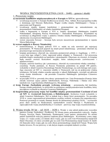 WOJNA TRZYDZIESTOLETNIA (1618 – 1648) – geneza i skutki 1. Przyczyny wojny a) narastanie konfliktów międzynarodowych w Europie w XVI w. spowodowane: rywalizacją mocarstw w Europie Środkowej na terenie: Prus, Inflant, Rzeczypospolitej (walka o dominację nad Morzem Bałtyckim), Węgier (walka między Habsburgami i Turcją o panowanie nad Węgrami) rywalizacja miedzy krajami katolickimi i protestanckimi np. uniezależnienie się protestanckich Niderlandów od władzy katolickiej Hiszpanii walka o hegemonię w Europie w XVI w. między dynastiami: Habsburgów (rządzili Niderlandami, Hiszpanią, Rzeszą Niemiecką) i francuskich Walezjuszy. Przykładem tej rywalizacji są długoletnie wojny o państwa włoskie miedzy Habsburgami a Walezjuszami, zakończone zwycięstwem Habsburgów. wzrost znaczenia Szwecji – Szwecja była nowym mocarstwem (protestanckim) w rejonie Morza Bałtyckiego b) wzrost napięcia w Rzeszy Niemieckiej kontrreformacja, w drugiej połowie XVI w. miała na celu nawrócić jak najwięcej protestantów. W Niemczech pojawił się strach przed rekatolizacją – protestanci obawiali się przymusowego nawracania na katolicyzm książęta protestanccy obawiali się, zniesienia postanowień pokoju w Augsburgu z 1555 r. („czyj kraj tego religia”), który zapewniał pokój religijny w Niemczech i był przyczyną podziału krajów niemieckich na katolickie i protestanckie. Obawiano się również, że książęta będą musieli zwrócić Kościołowi majątki, które sekularyzowano (zeświecczono i upaństwowiono). książęta, zarówno katoliccy jak i protestanccy, obawiali się wzmocnienia władzy centralnej – cesarskiej. Trzeba pamiętać, że Rzesza Niemiecka podzielona na ponad 100 państw, wchodziła w skład Cesarstwa Rzymskiego Narodu Niemieckiego, na czele którego stał cesarz. Jego znaczenie od XIV w. znaczenie osłabło w Niemczech; stał się on praktycznie władcą tytularnym. Od kiedy władza cesarska spoczęła w rękach Habsburgów, rozwijali oni głównie swoje ziemie dziedziczne – tak powstało Cesarstwo Habsburgów (późniejsze Cesarstwo Austriackie). na początku XVII w. powstały dwa obozy: protestancki tzw. Unia Protestancka (Francja, która chciała rozerwać sojusz państw habsburskich; Szwecja, Niderlandy i Dania) oraz obóz katolicki tzw. Liga Katolicka (Habsburgowie, Hiszpania) c) kraje Europy Zachodniej przyjęły wybraną orientację – protestancką lub katolicką. Europa została podzielona, co pozwoliło na późniejsze umiędzynarodowienie konfliktu, który początkowo wybuchł na obszarze Cesarstwa Habsburgów. d) bezpośrednią przyczyną wojny był konflikt między protestanckimi Czechami (Czesi od XIV w. wyznawali husytyzm), a Habsburgami.. Królestwo Czech wchodziło w skład Cesarstwa Habsburgów. Był to jednak kraj o dużej ilości protestantów. Na początku XVII w. cesarz zagwarantował protestantom czeskim wolność wyznania (list majestatyczny). Ponieważ gwarancje te zostały złamane doszło do defenestracji praskiej (1618) – wyrzucenia przez okno zamku na Hradczanach, namiestników cesarza Macieja I. Wydarzenie to zapoczątkowało wojnę antyhabsburską w Czechach – pierwszy etap wojny trzydziestoletniej. 2. Wojna trwała 30 lat – od 1618 – 1630 r. Wzięły w niej udział praktycznie wszystkie państwa Europy Zachodniej i Środkowej. Po stronie pastw protestanckich walczyły: Anglia, Francja, Szwecja, Dania, Niderlandy, Siedmiogród, część państw niemieckich. Po stronie państw katolickich walczyły państwa rządzone przez Habsburgów. Wyróżniamy cztery etapy wojny: (1) wojna czeska, (2) duński okres wojny, gdy na czele Unii Protestanckiej stanął król Danii Chrystian; (3) okres szwedzki gdy na czele Unii Protestanckiej stanął Gustaw II Adolf; (4) francuski okres wojny gdy na czele obozu protestanckiego stanął król Francji. Wojna była bardzo krwawa. Po raz pierwszy w tak dużym stopniu ucierpiała ludność cywilna. 1 3. Skutki wojny. a) Wojnę zakończył pokój westfalski w 1648 r. Podpisano wówczas traktaty pokojowe między Francją i Cesarstwem oraz między Szwecją, a Rzeszą Niemiecką: Traktaty westfalskie – dokładnie Pokój miedzy Francją a Uznano prawa Francji do 3 biskupstw: Metz, Toul, Verdun Habsburgowie zrzekali się na rzecz króla Francji praw Cesarstwem w Munster patrymonialnych do swych posiadłości w Alzacji (landgrafstwa 24.10.1648 Dolnej i Górnej Alzacji, 10 miast Rzeszy oraz miasta Brisach) Habsburgowie uznali prawa Francji do miejscowości Pignerol we Włoszech. Podział Pomorza: Szwecja uzyskała ujście Odry ze Szczecinem oraz Pokój w Osnabruck: Szwecja. Brandenburgia Wyspu Uznam Wolin i Rugię. Szwedzi otrzymali również biskupstwa (sekularyzowane) w Bremie i Verden oraz port w Wismarze (rekompensata za Pomorze Wschodnie) Elektorowi brandenburskiemu przypadła wschodnia część Pomorza z Kołobrzegiem oraz biskupstwa w Minden i Halberstadt oraz arcybiskupstwo w Magdeburgu (rekompensata za Pomorze Zachodnie) sprawy wewnętrzne Książęta uzyskali niemal pełną suwerenność – posiadali prawo cesarstwa i Rzeszy zawierania sojuszy i traktatów bez zgody cesarza Wszystkie zmiany stanu posiadania, które nastąpiły na skutek reformacji (do 1624 r.) będą utrzymane w mocy Zapewniono ludności swobodę wyznania, pod warunkiem wypełniania obowiązków wobec władcy (luteranie, kalwini, katolicy – tylko ich to dotyczy) Cesarz ogłosił amnestię i przywrócił posiadłości tym, którzy je utracili wskutek wojny Pokój w Hadze miedzy król Hiszpanii formalnie uznał niepodległość Zjednoczonych Prowincji Hiszpanią a Holandią 30.01. 1648 – został Zjednoczone Prowincje uzyskały nowe terytoria zdobyte podczas wojny: Brabant, Flandria, Limburgia ratyfikowany w Munster Ujście Skaldy pozostało zamknięte dla żeglugi – skazanie Antwerpii na upadek Uznano niezależność Konfederacji Szwajcarskiej - postanowienia dotyczące terytorium: Francja otrzyma