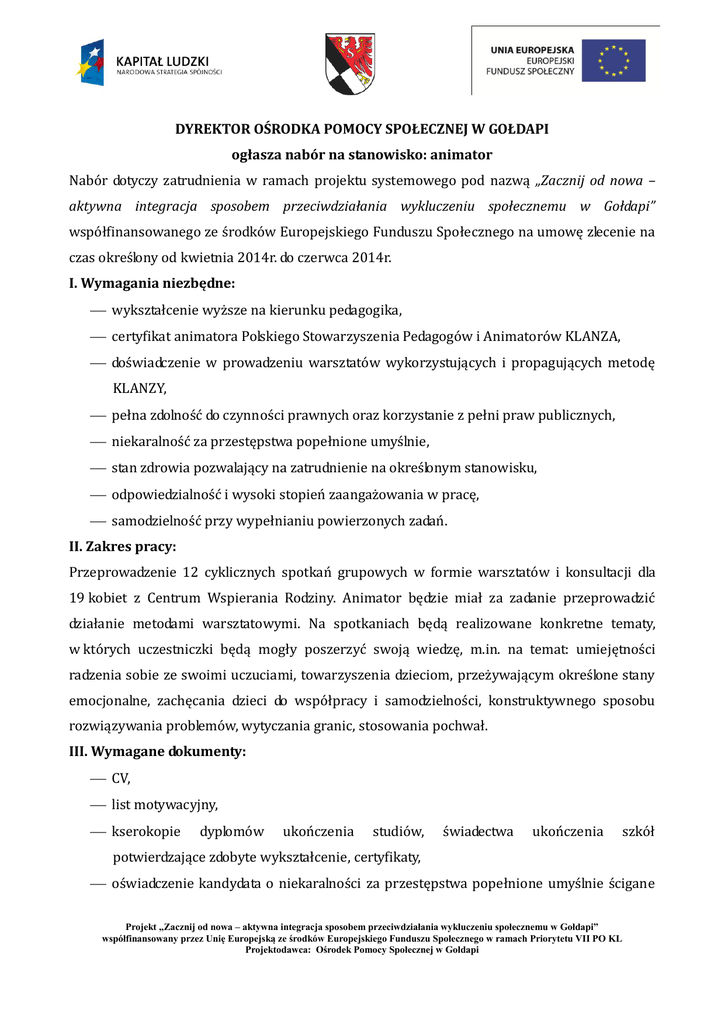 DYREKTOR OŚRODKA POMOCY SPOŁECZNEJ W GOŁDAPI ogłasza nabór na stanowisko: animator Nabór dotyczy zatrudnienia w ramach projektu systemowego pod nazwą „Zacznij od nowa – aktywna integracja sposobem przeciwdziałania wykluczeniu społecznemu w Gołdapi” współfinansowanego ze środków Europejskiego Funduszu Społecznego na umowę zlecenie na czas określony od kwietnia 2014r. do czerwca 2014r. I. Wymagania niezbędne: wykształcenie wyższe na kierunku pedagogika, certyfikat animatora Polskiego Stowarzyszenia Pedagogów i Animatorów KLANZA, doświadczenie w prowadzeniu warsztatów wykorzystujących i propagujących metodę KLANZY, pełna zdolność do czynności prawnych oraz korzystanie z pełni praw publicznych, niekaralność za przestępstwa popełnione umyślnie, stan zdrowia pozwalający na zatrudnienie na określonym stanowisku, odpowiedzialność i wysoki stopień zaangażowania w pracę, samodzielność przy wypełnianiu powierzonych zadań. II. Zakres pracy: Przeprowadzenie 12 cyklicznych spotkań grupowych w formie warsztatów i konsultacji dla 19 kobiet z Centrum Wspierania Rodziny. Animator będzie miał za zadanie przeprowadzić działanie metodami warsztatowymi. Na spotkaniach będą realizowane konkretne tematy, w których uczestniczki będą mogły poszerzyć swoją wiedzę, m.in. na temat: umiejętności radzenia sobie ze swoimi uczuciami, towarzyszenia dzieciom, przeżywającym określone stany emocjonalne, zachęcania dzieci do współpracy i samodzielności, konstruktywnego sposobu rozwiązywania problemów, wytyczania granic, stosowania pochwał. III. Wymagane dokumenty: CV, list motywacyjny, kserokopie dyplomów ukończenia studiów, świadectwa ukończenia szkół potwierdzające zdobyte wykształcenie, certyfikaty, oświadczenie kandydata o niekaralności za przestępstwa popełnione umyślnie ścigane Projekt „Zacznij od nowa – aktywna integracja sposobem przeciwdziałania wykluczeniu społecznemu w Gołdapi” współfinansowany przez Unię Europejską ze środków Europejskiego Funduszu Społecznego w ramach Priorytetu VII PO KL Projektodawca: Ośrodek Pomocy Społecznej w Gołdapi z oskarżenia publicznego lub umyślne przestępstwo skarbowe, oświadczenie o pełnej zdolności do czynności prawnych oraz korzystanie z pełni praw publicznych, oświadczenie, że stan zdrowia pozwala na zatrudnienie na wskazanym stanowisku. IV. Inne informacje: W lutym 2014r. wskaźnik zatrudnienia osób niepełnosprawnych w Ośrodku Pomocy Społecznej w Gołdapi w rozumieniu przepisów o rehabilitacji zawodowej i społecznej oraz zatrudnianiu osób niepełnosprawnych wyniósł powyżej 6%. Wymagane dokumenty: list motywacyjny i CV powinny być podpisane i opatrzone klauzulą: „Wyrażam zgodę na przetwarzanie moich danych osobowych zawartych w ofercie pracy dla potrzeb niezbędnych do realizacji procesu rekrutacji zgodnie z ustawą z dnia 29 sierpnia 1997r. o ochronie danych osobowych”(Dz. U. z 2002r., Nr 101, poz. 926 z późn. zm.). Dokumenty należy składać w zamkniętej kopercie z dopiskiem „Animator” w Sekretariacie Ośrodka Pomocy Społecznej w Gołdapi pokój nr 13 lub przesłać na adres: Ośrodek Pomocy Społecznej, ul. Jaćwieska 9, 19-500 Gołdap w terminie do 7 kwietnia 2014r. Dokumenty, które wpłyną po wyznaczonym terminie nie będą rozpatrywane (dla dokumentów wysłanych pocztą decyduje data faktycznego wpływu). Złożone oferty będą badane pod względem kompletności i spełniania przez kandydatów wymagań formalnych na wskazane stanowisko. Osoby, które spełnią wymagania formalne określone w ogłoszeniu zostaną zaproszone na rozmowę kwalifikacyjną. Informacja o wynikach naboru zostanie opublikowana w Biuletynie Informacji Publicznej pod adresem goldap.pl, na stronie internetowej opsgoldap.com.pl oraz na tablicy ogłoszeń Ośrodka Pomocy Społecznej w Gołdapi. Gołdap, 26 marca 2014r. Dyrektor Ośrodka Pomocy Społecznej w Gołdapi Agnieszka Iwanowska Projekt „Zacznij od nowa – aktywna integracja sposobem przeciwdziałania wykluczeniu społecznemu w Gołdapi” współfinansowany przez Unię Europejską ze środków Europejskiego Funduszu Społecznego w ramach Priorytetu VII PO KL Projektodawca: Ośrodek Pomocy Społecznej w Gołdapi