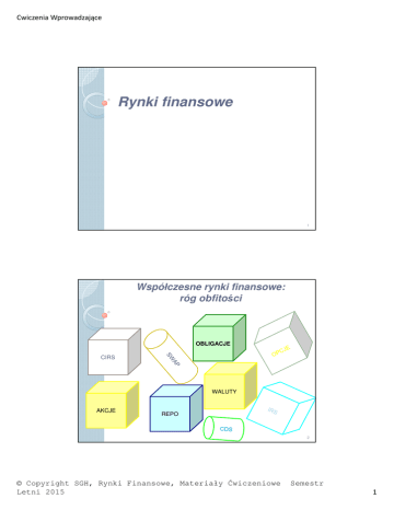 Cwiczenia Wprowadzające Rynki finansowe 1 Współczesne rynki finansowe: róg obfitości OBLIGACJE CIRS WALUTY AKCJE REPO 2 © Copyright SGH, Rynki Finansowe, Materiały Ćwiczeniowe Letni 2015 Semestr 1 Cwiczenia Wprowadzające Program Ćwiczeń Bloki tematyczne Rynek terminowy Rynek pieniężny Swapy: IRS i CIRS Opcje Pochodne Kredytowe Materiały: www.rynkifinansowe.pl Zaliczenie – wspólne dla wykładu i ćwiczeń (test) 3 Kontakt: [email protected] Dzisiejsze zajęcia – wspólny język Miejsce pochodnych w systemie finansowym Wartość pieniądza w czasie – klucz do wyceny Podstawowe pojęcia rynku stopy procentowej ◦ ◦ ◦ krzywa dochodowości obligacje, rentowność, duration, bpv WIBOR, Polonia, podstawy kwotowań Podstawowe pojęcia rynku walutowego ◦ ◦ ◦ Spekulacja, a arbitraż Pozycja walutowa Kwotowania na rynku walutowym 4 © Copyright SGH, Rynki Finansowe, Materiały Ćwiczeniowe Letni 2015 Semestr 2 Cwiczenia Wprowadzające Pochodne w systemie finansowym 5 Elementy systemu finansowego (1) Rynkowy system finansowy tworzą: Rynki na których dokonuje się transakcji instrumentami finansowymi: rynek pieniężny, rynek kapitałowy, rynek walutowy, rynek instrumentów pochodnych. Instytucje finansowe operujące na rynkach finansowych: banki (uniwersalne, inwestycyjne, spółdzielcze) i instytucje parabankowe (np. SKOK-i), instytucje wspólnego inwestowania – fundusze inwestycyjne, fundusze emerytalne, zakłady ubezpieczeń (majątkowych i na życie), firmy inwestycyjne (domy i biura maklerskie), 6 © Copyright SGH, Rynki Finansowe, Materiały Ćwiczeniowe Letni 2015 Semestr 3 Cwiczenia Wprowadzające Elementy systemu finansowego (2) firmy leasiangowe i firmy faktoringowe, fundusze private equity, hedge funds i sovereign wealth funds. Infrastruktura oraz regulacje i zasady dotyczące rynków i instytucji finansowych: systemy płatnicze (wysokokwotowe, detaliczne), giełdy i platformy obrotu instrumentami finansowymi, depozyty papierów wartościowych i izby rozliczeniowe (CCP), systemy gwarancyjne (np. BFG, UFG), agencje ratingowe i biura informacji kredytowej, nadzór finansowy, regulacje ostrożnościowe, prawo / regulacje krajowe i międzynarodowe (UE), regulaminy, kodeksy, zasady dobrych praktyk (…) 7 Transakcje (instrumenty) pochodne Klasyfikacja finansowych instrumentów pochodnych Finansowe instrumenty pochodne Podział wg rodzajów transakcji – transakcje terminowe (futures i forward) – transakcje zamiany (tzw. swapy) – opcje – kombinacje wyżej wymienionych Podział wg rodzaju instrumentu bazowego Podział wg sposobu rozliczenia transakcji – rozliczane poprzez fizyczną dostawę instrumentu bazowego – rozliczane różnicowo – walutowe instrumenty Podział wg sposobu pochodne organizacji handlu – instrumenty pochodne na stopy procentowe – giełdowe instrumenty – instrumenty pochodne, pochodne których wartość jest – pozagiełdowe uzależniona od cen akcji instrumenty – kredytowe instrumenty pochodne (OTC) pochodne – instrumenty pochodne, których wartość jest uzależniona od cen metali szlachetnych Źródło: opracowanie własne. 8 © Copyright SGH, Rynki Finansowe, Materiały Ćwiczeniowe Letni 2015 Semestr 4 Cwiczenia Wprowadzające Po co na rynek instrumentów pochodnych? Umożliwiają zabezpieczanie się przed ryzykiem finansowym (ang. hedging). Są wykorzystywane do spekulacji na rynkach finansowych (efekt dźwigni finansowej): • spekulacja stabilizująca • spekulacja destabilizująca Zwiększenie możliwości arbitrażu. Inwestowanie. 9 Inne zastosowania instrumentów pochodnych Stwarzają możliwość większego wyboru rodzaju podejmowanego ryzyka finansowego. Znacznie ułatwiają dywersyfikację aktywów. Umożliwiają lokowanie środków na wielu rynkach zagranicznych przy ograniczaniu ryzyka walutowego. Banki mogą transferować ryzyko kredytowe, a uwolnione w ten sposób kapitały pozwalają na podejmowanie dalszej akcji kredytowej. Umożliwiają obniżenie kosztów finansowania na tradycyjnym rynku finansowym. Płynne rynki instrumentów pochodnych dostarczają informacji o oczekiwaniach ich uczestników cen instrumentów bazowych itd. 10 © Copyright SGH, Rynki Finansowe, Materiały Ćwiczeniowe Letni 2015 Semestr 5 Cwiczenia Wprowadzające Wartość pieniądza w czasie 11 Wartość pieniądza w czasie (1) Ile jest warte dziś 100 złotych otrzymane w przyszłości? 100 80 po roku 60 po 2 latach 40 po 5 latach po 10 latach 20 0 1% 3% 5% 7% 9% 11% 13% 15% 17% 19% 12 © Copyright SGH, Rynki Finansowe, Materiały Ćwiczeniowe Letni 2015 Semestr 6 Cwiczenia Wprowadzające Wartość pieniądza w czasie (2) Wartość pieniądza w czasie maleje: • 100 zł otrzymane za rok jest dziś warte mniej niż 100 zł otrzymane jutro Malejąca wartość pieniądza w czasie jest wyrażona przez stopy procentowe, które stanowią cenę pieniądza: • oprocentowanie „wyrównuje” ubytek wartości pieniądza wynikający z upływu czasu Wartość przyszłych przepływów pieniężnych zazwyczaj maleje w rosnącym tempie • zarówno ryzyko, jak i koszt alternatywny rosną w tempie nieliniowym, coraz szybciej dla coraz odleglejszych terminów oraz coraz większych kwot, m.in. z uwagi na możliwość reinwestycji odsetek 13 Wartość pieniądza w czasie (3) Źródła malejącej wartości pieniądza w czasie: • ryzyko (pożyczający kapitał nie wie, czy otrzyma go z powrotem – im większa premia za to ryzyko, tym szybciej maleje wartość pieniądza w czasie) • koszt alternatywny (pożyczający kapitał na określony termin musi ograniczyć częściowo konsumpcję oraz inne inwestycje – odsetki stanowią formę rekompensaty za to wyrzeczenie) • inflacja (zwykle dodatnie tempo zmian cen w gospodarce sprawia, że dziś można za określoną kwotę nabyć więcej dóbr niż w przyszłości) 14 © Copyright SGH, Rynki Finansowe, Materiały Ćwiczeniowe Letni 2015 Semestr 7 Cwiczenia Wprowadzające Wartość pieniądz