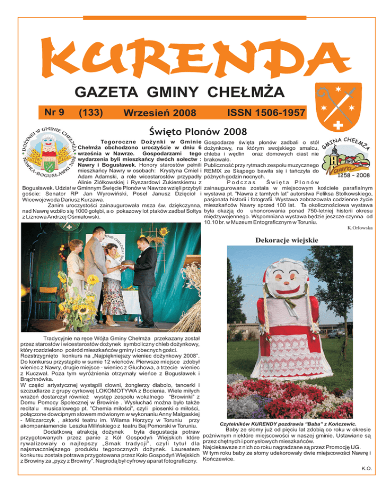 GAZETA GMINY CHEŁMŻA Nr 9 (133) Wrzesień 2008 ISSN 1506-1957 Święto Plonów 2008 Tegoroczne Dożynki w Gminie Chełmża obchodzono uroczyście w dniu 6 września w Nawrze. Gospodarzami tego wydarzenia byli mieszkańcy dwóch sołectw : Nawry i Bogusławek. Honory starostów pełnili mieszkańcy Nawry w osobach: Krystyna Cmiel i Adam Adamski, a role wicestarostów przypadły Alinie Ziółkowskiej i Ryszardowi Zukierskiemu z Bogusławek. Udział w Gminnym Święcie Plonów w Nawrze wzięli przybyli goście: Senator RP Jan Wyrowiński, Poseł Janusz Dzięcioł i Wicewojewoda Dariusz Kurzawa. Zanim uroczystości zainaugurowała msza św. dziękczynna, nad Nawrę wzbiło się 1000 gołębi, a o pokazowy lot ptaków zadbał Sołtys z Liznowa Andrzej Ośmiałowski. Gospodarze święta plonów zadbali o stół dożynkowy, na którym swojskiego smalcu, chleba i wędlin oraz domowych ciast nie brakowało. Publiczność przy rytmach zespołu muzycznego REMIX ze Skąpego bawiła się i tańczyła do późnych godzin nocnych. Podczas Święta Plonów zainaugurowana została w miejscowym kościele parafialnym wystawa pt. ”Nawra z tamtych lat” autorstwa Feliksa Stolkowskiego, pasjonata historii i fotografii. Wystawa zobrazowała codzienne życie mieszkańców Nawry sprzed 100 lat. Ta okolicznościowa wystawa była okazją do uhonorowania ponad 750-letniej historii okresu międzywojennego. Wspomniana wystawa będzie jeszcze czynna od 10.10 br. w Muzeum Entograficznym w Toruniu. K.Orłowska Dekoracje wiejskie Tradycyjnie na ręce Wójta Gminy Chełmża przekazany został przez starostów i wicestarostów dożynek symboliczny chleb dożynkowy, który rozdzielono pośród mieszkańców gminy i obecnych gości. Rozstrzygnięto konkurs na „Najpiękniejszy wieniec dożynkowy 2008”. Do konkursu przystąpiło w sumie 12 wieńców. Pierwsze miejsce zdobył wieniec z Nawry, drugie miejsce - wieniec z Głuchowa, a trzecie wieniec z Kuczwał. Poza tym wyróżnienia otrzymały wieńce z Bogusławek i Brąchnówka. W części artystycznej wystąpili clowni, żonglerzy diabolo, tancerki i szczudlarze z grupy cyrkowej LOKOMOTYWA z Bocienia. Wiele miłych wrażeń dostarczył również występ zespołu wokalnego “Browinki” z Domu Pomocy Społecznej w Browinie . Wysłuchać można było także recitalu musicalowego pt. ”Chemia miłości”, czyli piosenki o miłości, połączone dowcipnym słowem mówionym w wykonaniu Anny Malgaskiej - Milczarczyk , aktorki teatru im. Wilama Horzycy w Toruniu przy akompaniamencie Leszka Milińskiego z teatru Baj Pomorski w Toruniu. Dodatkową atrakcją dożynek była degustacja potraw przygotowanych przez panie z Kół Gospodyń Wiejskich które rywalizowały o najlepszy „Smak tradycji”, czyli tytuł dla najsmaczniejszego produktu tegorocznych dożynek. Laureatem konkursu została potrawa przygotowana przez Koło Gospodyń Wiejskich z Browiny za „pyzy z Browiny”. Nagrodą był cyfrowy aparat fotograficzny. Czytelników KURENDY pozdrawia “Baba” z Kończewic. Baby ze słomy już od pięciu lat zdobią co roku w okresie pożniwnym niektóre miejscowości w naszej gminie. Ustawiane są przez chętnych i pomysłowych mieszkańców. Najciekawsze z nich co roku nagradzane są przez Promocję UG. W tym roku baby ze słomy udekorowały dwie miejscowości Nawrę i Kończewice. K.O. Samorządowy serwis informacyjny Informacje o przetargach Co ze zjazdem autostradowym w Dźwierznie I. Informacje o rozstrzygniętych postępowaniach przetargowych : 1) W dniu 30.06.2008r. został rozstrzygnięty przetarg na wykonanie przebudowy drogi gminnej Kuczwały-Mirakowo. W postępowaniu wpłynęły 2 oferty. Najkorzystniejszą ofertę złożyła firma Skanska S.A. Warszawa Oddział Budownictwa Drogowo- Mostowego w Poznaniu za cenę brutto 406 332,52 zł. 2) W dniu 29.07.2008r. został rozstrzygnięty przetarg na opracowanie kompletnej dokumentacji projektowej na budowę 130 szt. przydomowych oczyszczalni ścieków na terenie Gminy Chełmża. W postępowaniu wpłynęło 5 ofert. Najkorzystniejszą ofertę złożyła firma P.W. „ BIOKONSULT” Sp.z.o.o. z Poznania za cenę brutto oferty 39 650 zł. 3) W dniu 07.08.2008r. został rozstrzygnięty przetarg na przygotowanie i dostarczanie ciepłych jednodaniowych posiłków dla dzieci i młodzieży szkolnej w ramach prowadzonego dożywiania przez Gminę Chełmża. W postępowaniu wpłynęła 1 oferta. Najkorzystniejszą ofertę złożyło Toruńskie Centrum „ CARITAS” z Torunia za cenę brutto jednego posiłku 3,00zł. 4) W dniu 27.08.2008r. został rozstrzygnięty przetarg na uporządkowanie gospodarki ściekowej w rejonie drogi krajowej nr 1 oraz J. Chełmżyńskiego. Etap I- budowa kanalizacji sanitarnej w miejscowości Kończewice-Głuchowo -Windak. W postępowaniu wpłynęły 4 oferty. Najkorzystniejszą ofertę złożyła firma PEKUM Sp. z o.o. z Torunia za cenę brutto 1.012.282,62zł. W miesiącu sierpniu w auli konferencyjno-widowiskowej miała miejsce wspólna sesja Rad Gminy i Miasta Chełmża. Obrady te odbyły się z udziałem parlamentarzystów, Marszałka Województwa, Starosty i Wicestarosty Powiatu, radnych sejmiku, przedstawicieli instytucji państwowych i wojewódzkich nadzorujących budowę autostrady A-1. Tematem wspólnego posiedzenia była sprawa dalszych losów budowy zjazdu autostradowego w Dźwierznie. Reprezentujący w spotkaniu Ministra Infrastruktury radca prawny podtrzymał w Chełmży wcześniejsze stanowisko Ministra Grabarczyka twierdząc, że węzła nie będzie. Swoje stanowisko argumentował tym, że autostrada ma pełnić funkcje tranzytową, a zlokalizowanie blisko siebie kolejnych kilku zjazdów ograniczy te funkcje autostrady. Ważne stanowisko w tej sprawie wyraził obecny na spotkaniu główny projektant autostrady twierdząc, że plany budowy autostrady A-1 to lata siedemdziesiąte i cały czas pozostają niewyjaśnione kwestie w sprawie tej inwestycji. Wyjaśnił, że projekt nie uwzglę
