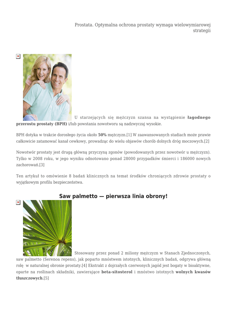 Prostata. Optymalna ochrona prostaty wymaga wielowymiarowej strategii U starzejących się mężczyzn szansa na wystąpienie łagodnego przerostu prostaty (BPH) i/lub powstania nowotworu są nadzwyczaj wysokie. BPH dotyka w trakcie dorosłego życia około 50% mężczyzn.[1] W zaawansowanych stadiach może prawie całkowicie zatamować kanał cewkowy, prowadząc do wielu objawów chorób dolnych dróg moczowych.[2] Nowotwór prostaty jest drugą główną przyczyną zgonów (powodowanych przez nowotwór u mężczyzn). Tylko w 2008 roku, w jego wyniku odnotowano ponad 28000 przypadków śmierci i 186000 nowych zachorowań.[3] Ten artykuł to omówienie 8 badań klinicznych na temat środków chroniących zdrowie prostaty o wyjątkowym profilu bezpieczeństwa. Saw palmetto — pierwsza linia obrony! Stosowany przez ponad 2 miliony mężczyzn w Stanach Zjednoczonych, saw palmetto (Serenoa repens), jak poparto mnóstwem istotnych, klinicznych badań, odgrywa główną rolę w naturalnej obronie prostaty.[4] Ekstrakt z dojrzałych czerwonych jagód jest bogaty w bioaktywne, oparte na roślinach składniki, zawierające beta-sitosterol i mnóstwo istotnych wolnych kwasów tłuszczowych.[5] Prostata. Optymalna ochrona prostaty wymaga wielowymiarowej strategii Naturalne składniki saw palmetto wpływają korzystnie na prostatę na kilka powiązanych ze sobą sposobów. Hamują one enzymy, które konwertują testosteron do dihydrotestosteronu (DHT),[6] hormonu, który zwiększa wzrost prostaty i może wywołać nowotwór.[7] Wiążą się z receptorami DHT w komórkach prostaty, redukując jego potencjalnie negatywny wpływ.[8] Blokują również pewne transmitery, które mogą nasilić objawy dolegliwości z dolnych dróg moczowych.[9] Te wielotorowe mechanizmy wyjaśniają terapeutyczne efekty saw palmetto w zarządzaniu BPH (łagodnym przerostem prostaty). Podsumowując 18 klinicznych prób obejmujących 2 939 mężczyzn, saw palmetto złagodził objawy dolegliwości z dolnych dróg moczowych (LUTS) oraz znacznie poprawił przepływ moczu w porównaniu z grupą otrzymującą placebo.[10] W badaniu odkryto również, że mężczyźni stosujący saw palmetto mieli mniejszą potrzebę oddawania moczu nocą. Jak wykazano, połączenie tego wyciągu z innymi ekstraktami fitoskładników, takimi jak korzeń pokrzywy i kora śliwy afrykańskiej – pygeum africanum, przynosi dodatkowe korzyści. Porównując bezpośrednio saw palmetto z lekami na receptę takimi jak finasteryd (Proscar ®) i tamsulosyna (Flomax ®), był równie skuteczny w łagodzeniu objawów schorzeń układu moczowego i usprawnieniu tempa przepływu moczu.[11] Co ciekawe, mężczyźni stosujących saw palmetto doświadczyli mniejszej częstotliwości występowania zaburzeń seksualnych, w porównaniu z tymi którzy byli poddani leczeniu środkami farmaceutycznymi![12] W rzeczywistosci potwierdzono tylko kilka skutków ubocznych stosowania ekstraktu saw palmetto.[13] Jak wykazano, kompleks opartych na roślinach substancji chemicznych (fitosteroli) w jagodzie saw palmetto wykorzystuje supresyjny efekt w stosunku do komórek nowotworu prostaty. Saw palmetto bogaty w beta-sitosterole, wraz z innymi składnikami zespołu fitosteroli — hamuje proliferację komórek nowotworu prostaty poprzez selektywne zatrzymywanie wzrostu komórek i wywoływanie zaprogramowanej ich śmierci (apoptozy).[14] Karotenoidy zawarte w saw palmetto również atakują błony komórek guza i spowalniają jego wzrost.[15] Wbrew tym imponującym odkryciom, saw palmetto nie powinien być traktowany jako główna terapia w leczeniu nowotworu prostaty. Co musisz wiedzieć: ochrona prostaty Niepożądane problemy prostaty dotykają co najmniej połowę wszystkim mężczyzn po 50-tce, a u 1 na 6 panów diagnozuje się nowotwór prostaty — uśmiercający aż 28 000 osób każdego roku w Stanach Zjednoczonych. Technologicznie zaawansowane sposoby ekstrakcji pomagają optymalizować Prostata. Optymalna ochrona prostaty wymaga wielowymiarowej strategii dotychczas znane korzyści wyciągu z saw palmetto. Ekstrakt saw palmetto prawdopodobnie zwalcza BPH (łagodny przerost prostaty) i nowotwór prostaty poprzez bezpośrednie blokowanie konwersji hormonu w tkankę prostaty i przez modyfikację ekspresji genów, które przyczyniają się do rozwoju nowotworu. Rozmaite, uzupełniające, naturalne środki działają na różne sposoby, hamując rozwój choroby prostaty w każdym jej stadium. Zarówno sam jak i w połączeniu, może być równie efektywne jak leki — ale już bez niepożądanych skutków ubocznych, takich jak zaburzenia seksualne. Uzupełniająca moc korzenia pokrzywy W licznych badaniach wykazano, że korzeń pokrzywy (Urtica dioica) wpływa sprzyjająco na zdrowie prostaty, (uzupełniając działanie saw palmetto). Jak się okazuje, kłująca pokrzywa moduluje aktywność hormonu w tkance prostaty. Posiada również potężne przeciwzapalne i przeciwbakteryjne zdolności — o bardzo niskiej toksyczności.[16] Dalsze badania przeprowadzone na zwierzętach udowadniają jej zdolności do ograniczania wzrostu tkanki prostaty.[17] Kontrolowane badania kliniczne wykazały, że ekstrakt pokrzywy przeciwdziała, a nawet odwraca efekty łagodnego przerostu gruczołu krokowego (BPH). W podwójnie ślepym, kontrolowanym za pomocą grupy placebo badaniu, przeprowadzonym na 558 pacjentach z BPH, ekstrakt pokrzywy złagodził objawy dolegliwości z dolnych dróg moczowych (LUTS) o 81%, w porównaniu z tylko 16% poprawą w grupie kontrolnej.[18] W porównaniu z placebo, znacznie zwiększył on również maksymalne tempo przepływu moczu. Ekstrakt z pokrzywy połączony z saw palmetto wykazuje nawet jeszcze bardziej imponujący wpływ na BPH. Pewne badanie odkryło, że ta kombinacja działa równie skutecznie w zmniejszaniu objawów i zwiększaniu strumienia uryny co finasterydowe leki (Proscar ®), ale powodują Prostata. Optymalna ochrona prostaty wymaga wielowymiar