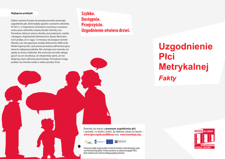 Najlepsze praktyki Żadne z państw Europy nie posiada procedur prawnego uzgodnienia płci, które byłyby zgodne z prawami człowieka. W 2012 r. w Argentynie uchwalono tworzoną w poszanowaniu praw człowieka ustawę Gender Identity Law. Procedura, którą ta ustawa określa, jest przejrzysta, szybka i dostępna. Argentyńskie Ministerstwo Spraw Wewnętrznych podaje, że w ciągu 12 miesięcy od przyjęcia Gender Identity Law skorygowane zostały dokumenty 3000 osób. Model argentyński, czyli prosta procedura administracyjna, stanowi najlepszą praktykę. Nie wymaga ona rozwodu ani zgody ze strony małżonka. Nie wymusza od osób ubiegających się ani sterylizacji, ani eksperckiej opinii, ani też diagnozy stanu zdrowia psychicznego. Procedurze mogą poddać się również osoby w wieku poniżej 18 lat. Szybko. Dostępnie. Przejrzyście. Uzgodnienie otwiera drzwi. Uzgodnienie Płci Metrykalnej Fakty Dowiedz się więcej o prawnym uzgodnieniu płci i sprawdź, co możesz zrobić, by dokonać zmian na lepsze – www.tgeu.org/AccessAllAreas oraz www.transfuzja.org. Stworzone dzięki wsparciu Open Society Foundation, holenderskiego rządu oraz Komisji Europejskiej. Poniżej wyrażone są wyłącznie poglądy TGEU, które niekoniecznie odzwierciedlają poglądy patronów. Czym jest uzgodnienie płci metrykalnej? Prawne uzgodnienie płci jest procedurą polegającą na zmianie imienia i nazwiska oraz oznaczenia płci w kluczowych oficjalnych dokumentach i rejestrach. Ma to na celu uznanie tożsamości płciowej danej osoby. Władze państwowe wyznaczają kryteria określające, kto może się takiej procedurze poddać. Jednakże takie wymagania, jak przymusowa sterylizacja, nakaz rozwodu, wymóg rozpoznania stanu zdrowia psychicznego oraz progi wiekowe w oczywisty sposób łamią prawa człowieka konkretnych jednostek. Dlaczego uzgodnienie płci metrykalnej jest takie ważne? Elementy codzienności, takie jak wybór miejsca zamieszkania, otwieranie rachunku bankowego czy korzystanie ze spersonalizowanego biletu na transport miejski, mogą stać się źródłem trudności, jeżeli tożsamość płciowa danej osoby nie jest odzwierciedlona w dowodzie osobistym, paszporcie itp. Dzieje się tak dlatego, że osoby transpłciowe często są posądzane o posiadanie fałszywych dokumentów oraz zmuszane do ujawnienia swojej tożsamości płciowej wbrew swojej woli. Stanowi to naruszenie ich prawa do prywatności, a nawet często skutkuje dyskryminacją i przemocą. Prowadzi to również do tego, że wiele osób transpłciowych zostaje wykluczonych ze społeczeństwa i rynku pracy. Ponadto wiele z nich nie ma odwagi się ujawnić, czego konsekwencją mogą być lęki, depresja, a nawet samobójstwo. Posiadanie dyplomów oraz świadectw pracy, które nie odzwierciedlają płci, w której dana osoba żyje, staje się częstą przyczyną bezrobocia u osób transpłciowych. Szybka, dostępna i przejrzysta procedura uzgodnienia płci metrykalnej zapobiega dyskryminacji, chroni prywatność danej osoby i umożliwia godne życie. Europa a problemy z prawnym uzgodnieniem płci Uzgodnienie płci metrykalnej nie jest dostępne aż w 16 krajach Europy. Powodem jest brak odpowiednich procedur, tudzież nieskuteczność tych już istniejących. Prowadzi to do tego, że osoby transpłciowe nie mogą legalnie zmienić dokumentów oraz wieść godnego życia. ZALECENIE: Przegląd ram prawnych i umożliwienie szybkiego, dostępnego i przejrzystego procesu prawnego uzgodnienia płci. Sterylizacja stanowi wymóg formalny w ramach procedury uzgodnienia płci aż w 23 państwach Europy. W sposób jawny łamie to prawo do integralności cielesnej, prawo do wolności od tortur i prawo do założenia rodziny. Nie wszystkie osoby transpłciowe mają chęć lub możliwość poddania się takim interwencjom medycznym. ZALECENIE: Usunąć wszelkie wymogi medyczne w ramach procedury prawnego uzgodnienia płci. Przymusowy rozwód lub unieważnienie małżeństwa w przypadku osoby transpłciowej pozostającej w związku małżeńskim stanowi wymóg formalny w 19 państwach Europy. Jest to bardzo trudne również dla ich rodzin, ponieważ ich współmałżonkowie i dzieci tracą tym samym prawa chronione przez małżeństwo. Procedura rozwodowa stanowi ogromne obciążenie finansowe i emocjonalne, skutkuje również rozstaniem kochających się par. ZALECENIE: Usunąć rozwód z listy wymogów koniecznych do procedury prawnego uzgodnienia płci. Diagnoza stanu zdrowia psychicznego lub opinia eksperta są konieczne do prawnego uzgodnienia płci we wszystkich państwach Europy. Oznacza to, że tożsamości transseksualne uznaje się za chore, mimo że takie nie są. Prowadzi to do stygmatyzacji i wykluczenia społecznego. Co więcej, wymóg procesu diagnostycznego wyklucza wiele osób transpłciowych, które potrzebują prawnego uzgodnienia płci. Sprawia to również, że cała procedura trwa o wiele dłużej, nawet o wiele lat. ZALECENIE: Usunąć wszelkie wymogi dotyczące diagnozy zdrowia psychicznego lub opinii eksperckiej w procedurze prawnego uzgodnienia płci. Progi wiekowe uniemożliwiają dostęp do prawnego rozpoznania płci wielu młodym osobom transpłciowym. Poza Niemcami i Austrią przepisy w prawach państw europejskich określają, że osoba poddająca się procedurze prawnego uzgodnienia płci musi być pełnoletnia (najczęściej ten wiek to minimum 18 lat). Utrudnia to integrację społeczną, na przykład w szkole, tym samym czyniąc szkodę dla rozwoju osobistego na tak ważnym etapie życia. Co więcej, wymogi dotyczące progu wiekowego mogą skutkować wykluczeniem możliwości prawnego uzgodnienia płci dla transpłciowej młodzieży i osób starszych (np. powyżej 65. roku życia). ZALECENIE: Usunąć określone bezpośrednio i pośrednio progi wiekowe w procedurze prawnego uzgodnienia płci.